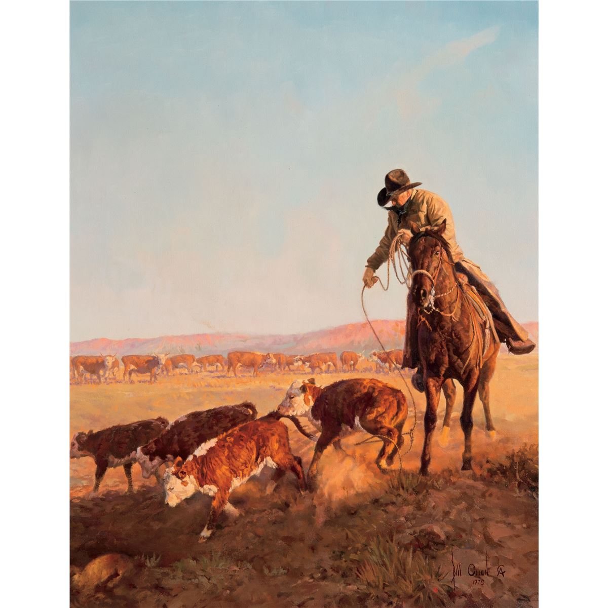 In Cowboy Artists of America, author Michael Duty writes that Bill Owen referred to cowboys as ÒwatchersÓ because Òthey always have to be aware of whatÕs going on around them.Ó (p. 94). Owen was a working ranch hand from the time he could ride a horse, but his desire to see the lives of cowboysÑ as they areÑrepresented in art, caused him to transpose his skill at ÒwatchingÓ from the range to the studio. In A CO Bar Cowboy, Owen commits himself to the straightforward, journalistic aesthetic that characterizes the CAA (in which he was an early member). The painting offers an insiderÕs glimpse at calf roping; it is as if the painting were a snapshot taken by another cowboy.