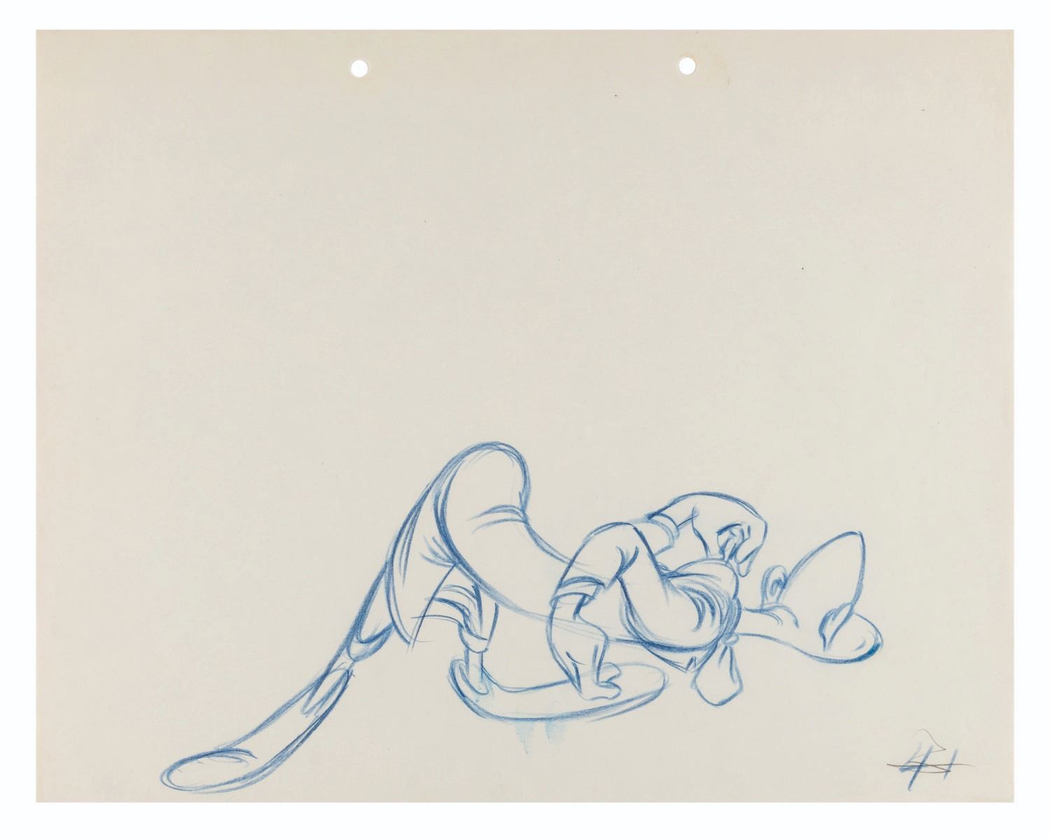 (Schlesinger, 1943) An original production drawing from "Coal Black and de Sebben Dwarfs” of Prince Chawmin’ as he tries to revive So White. With an image size of 9” x 4.25” on 9.5” x 12” animation paper, the drawing accomplished in color pencil is in very good condition with a smudge to one foot, and light wear from age and production use.
