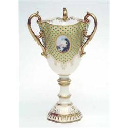 A Coalport 3-handled vase with small oval landscape vignette against a turquoise 'jewelled' gilt ground on domed foot, patt no.V5955, 6.75ins £750-1000