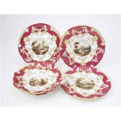 A Coalport bone china comport, painted with a landscape vignette, against a gilded and pierced claret border, and three dessert plates en suite, circa.1840 £150-200