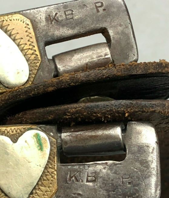 A collectible and fairly rare old pair of Kelly Bros & Parker (KB&P) spurs. They are single mounted with the heart pattern in silver and bronze on the bands and silver and bronze accents on the shanks as well. The swing buttons are in the shape of hearts on the mounted side and they come with the spur leathers on them. MAKER: Hallmarked KB&P - Kelly Bros. & Parker. APPROX AGE: This mark was used circa 1909 -- 1919. SIZE: Heel opening is 3 1/4". Heel bands are 7/8" wide. Shanks are 3-1/2" long including the rowels. CONDITION: Good for its age, normal wear expected. Please look closely at the pictures as they are an important part of our description and are hereby incorporated into the description, specifically with regards to condition. SHIPPING: There will be a $5 handling / packaging fee for shipping this lot. The actual cost of postage will be added on top of that. BUY IT NOW: If you would like to buy this item now, without waiting for the auction day to bid on it, we do offer this option (which is available up to 48 hours before the actual auction starts). The “Buy it Now†price is the high estimate of this lot (plus applicable fees and the Buyer's premium is discounted to 10% when using the Buy it Now option). If you would like to exercise this option, you must contact us by email (or phone as long as you talk to someone live). Reference this lot number and your intention to "Buy it Now."