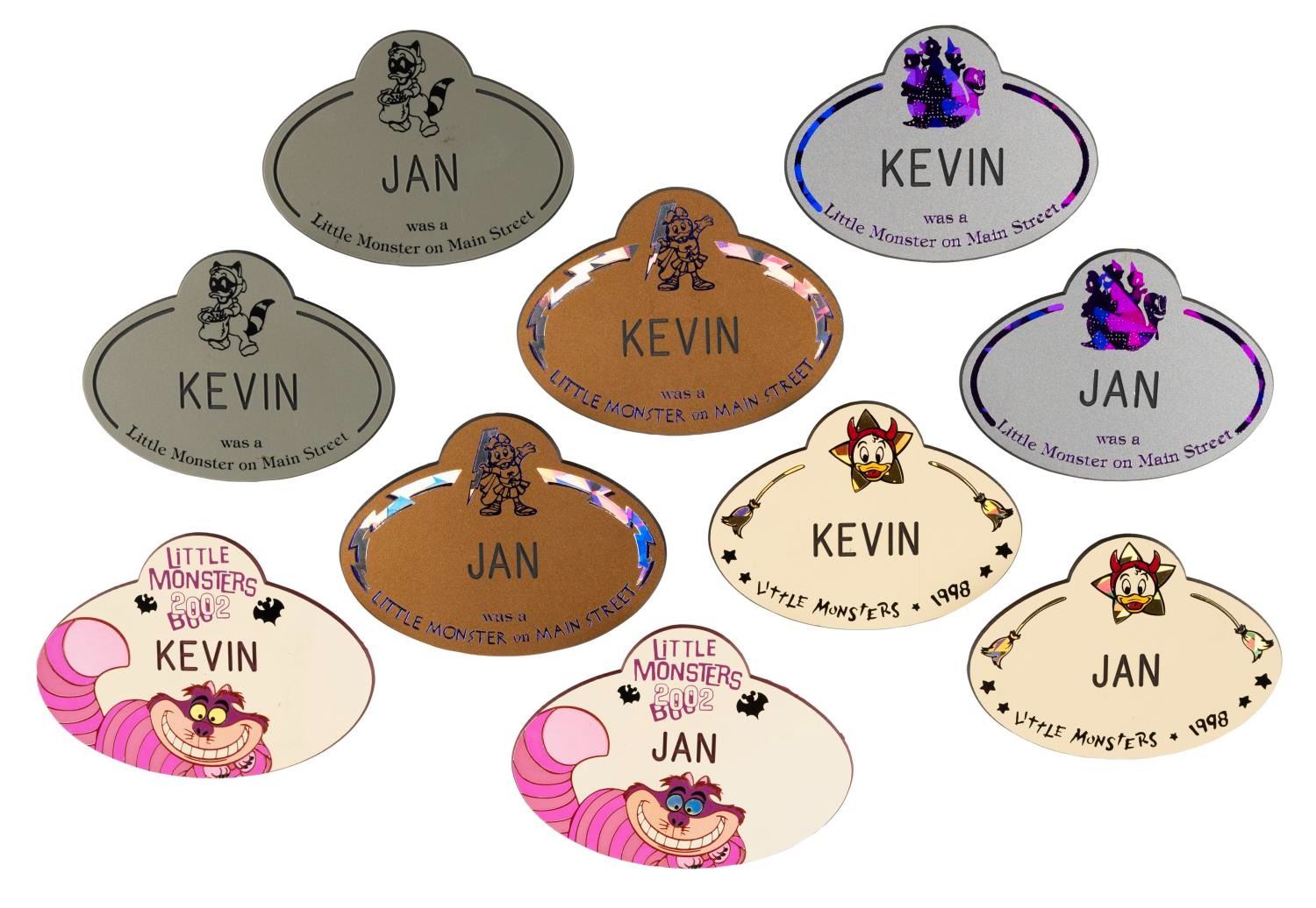 (Disneyland, 1995-98/2002) A collection of 10 Cast Member Name Badges from several years of the Little Monsters on Main Street Halloween event. Included are badges for "Kevin" and "Jan" for the years 1995 through 1998 and 2002.
