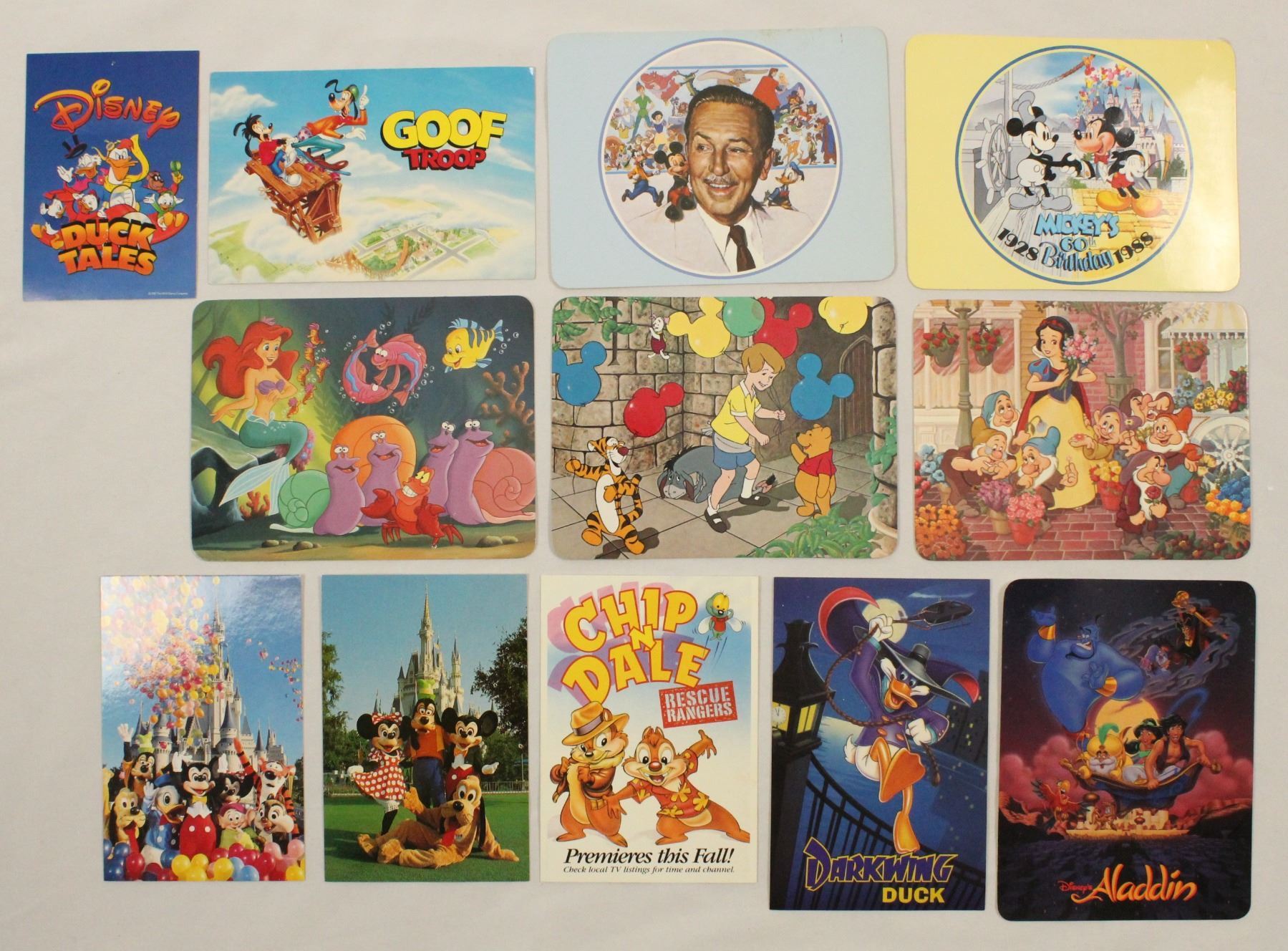 (Walt Disney World, 1970s - 1990s) These cards range in age and depictions from Mickey and friends in front of the castle, Walt Disney himself, classic animation to Disney Afternoon animation. Six of the cards measure 5"x7", two are 4" x 6", two are 4.25" x 6.5" and one is 3.5" x 5". All of them vary in condition with some edge-wear and surface scratches, pin holes or tape pulls. None have been mailed.