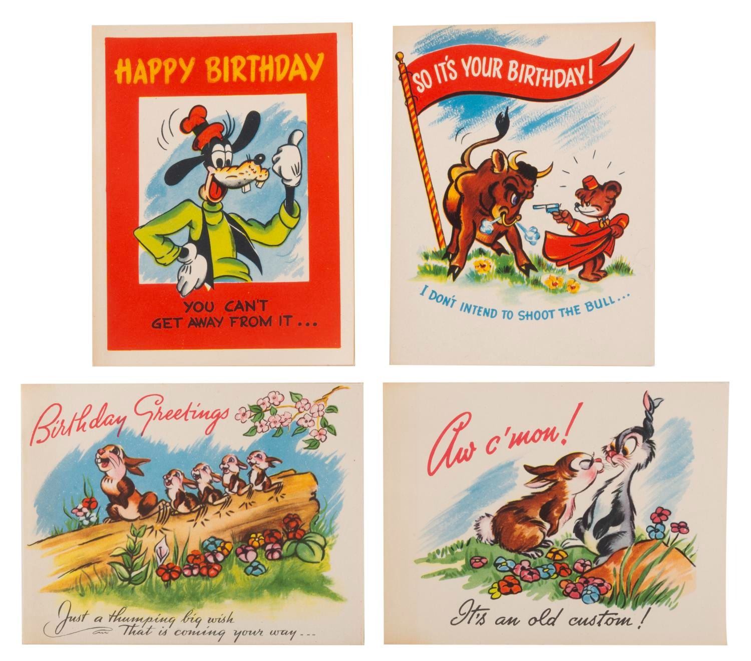(Disney, 1940s) A collection of four unused birthday cards from the late 1940s. Two feature Thumper from"Bambi," with one each of Goofy and Bongo from"Fun and Fancy Free." Each measuring 4.25" x 5.5" the unused cards are in very good condition with slight wear from age, and light pencil notations on the back.