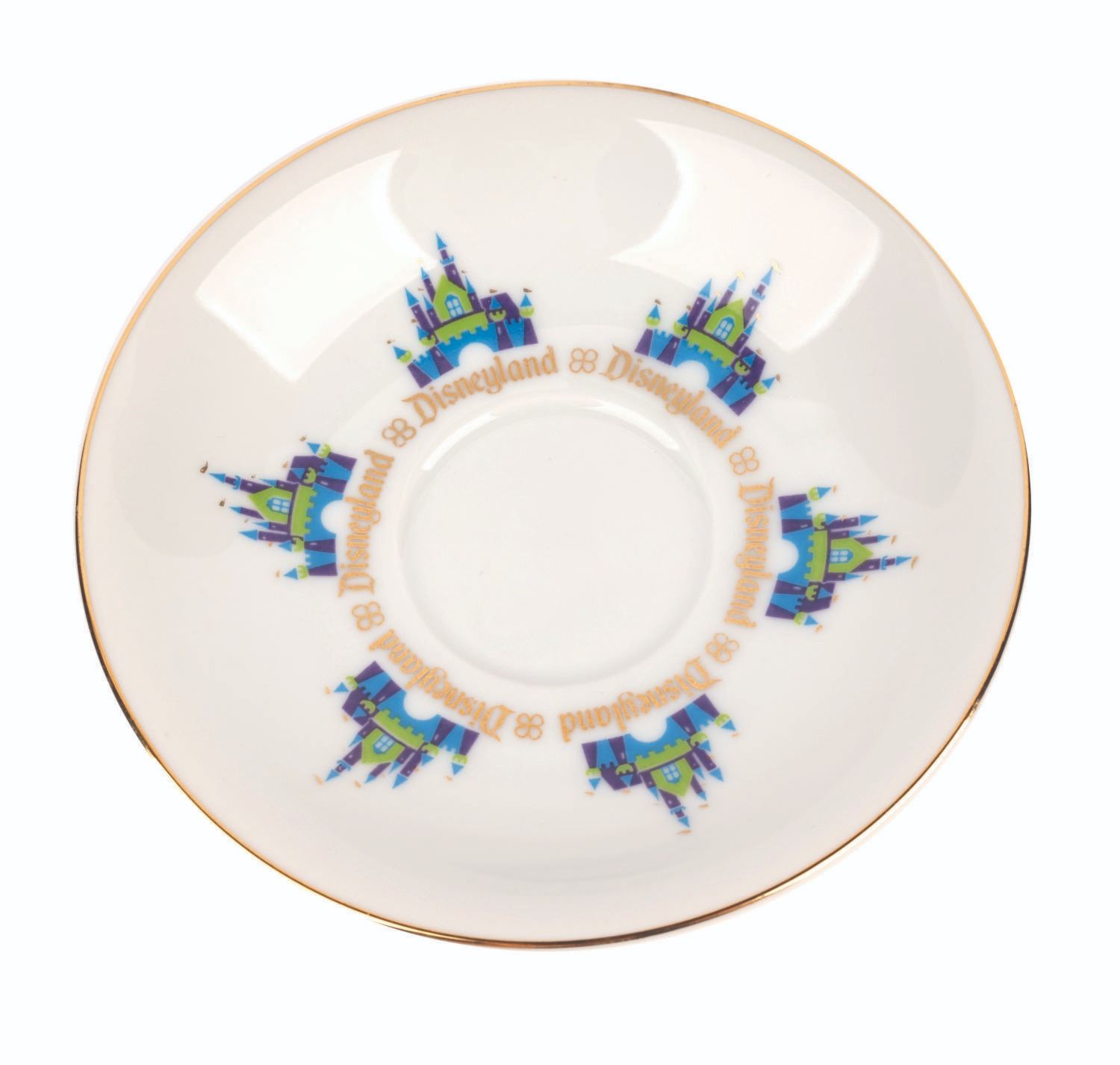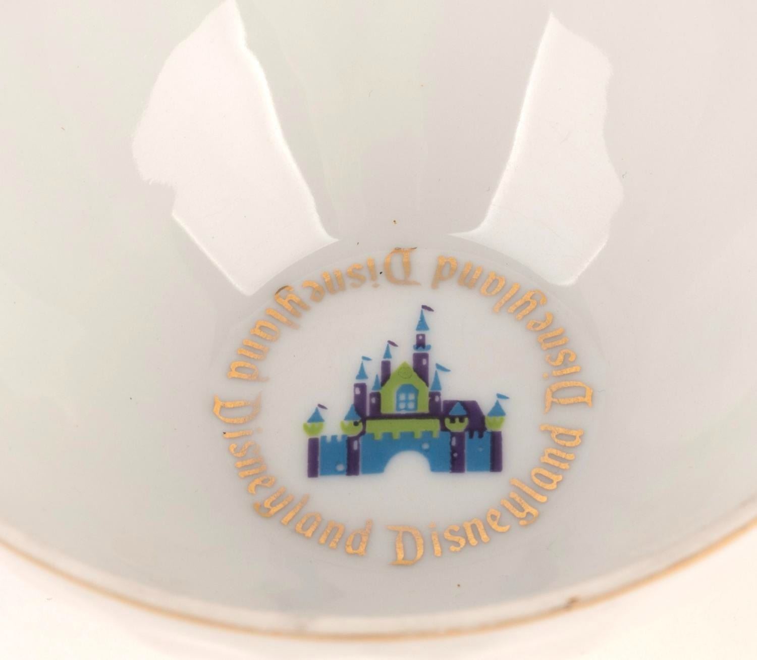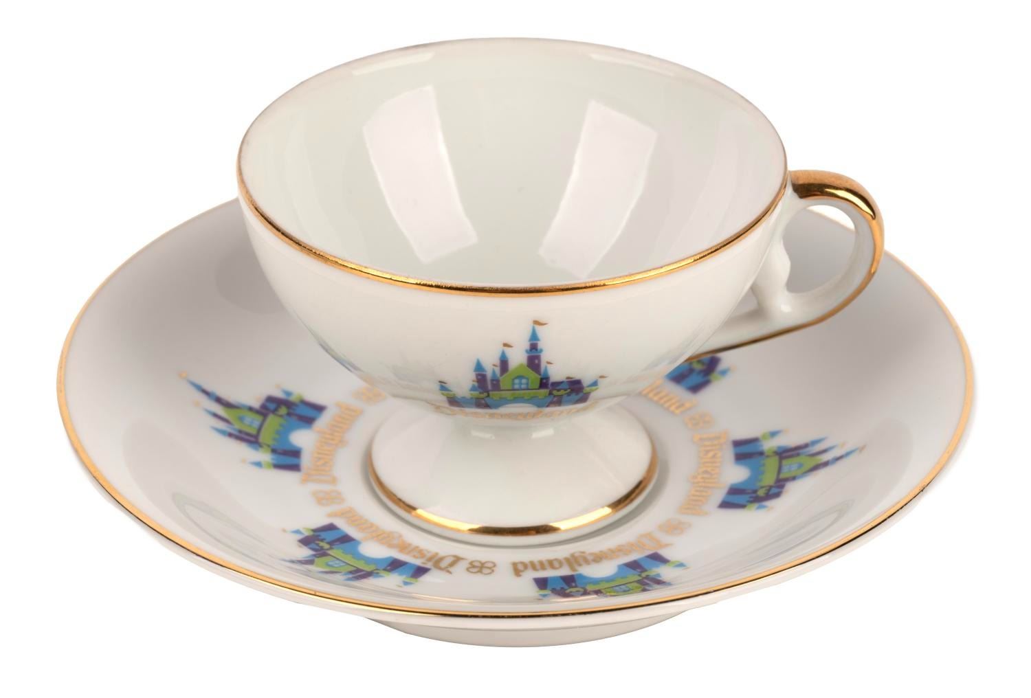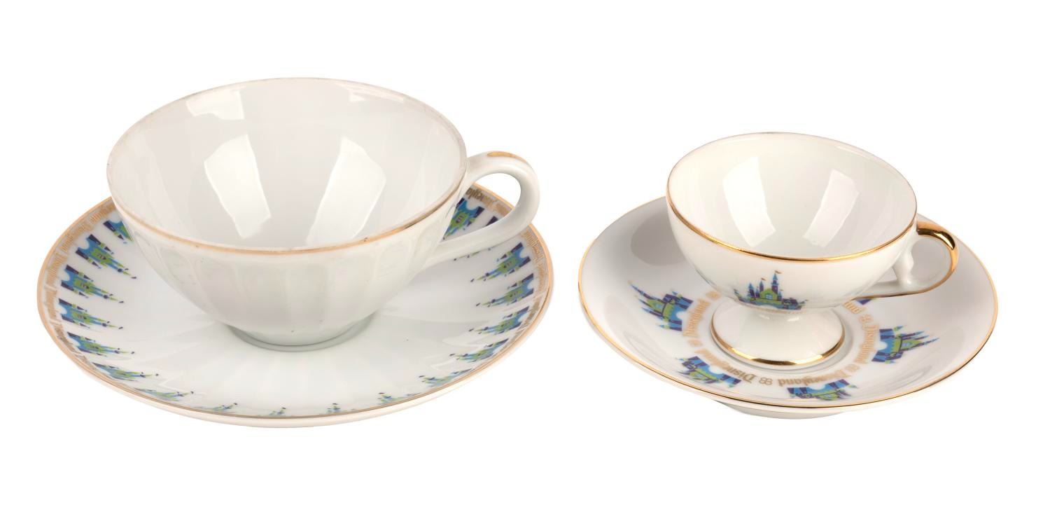 (Disneyland, 1970s) A collection of two teacups and two saucers with a stylized Sleeping Beauty Castle and gold accents. The saucers measure 4.75" and 6" in diameter, and the cups are 2.75" and 4" in diameter. All the pieces are in very good condition with slight wear to one spot of gold lettering on the 6" saucer.