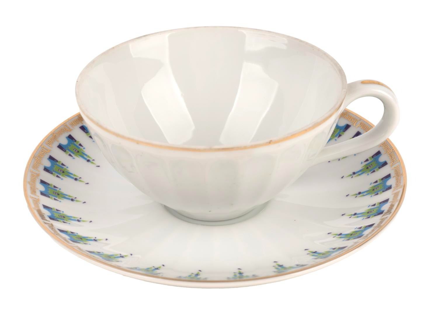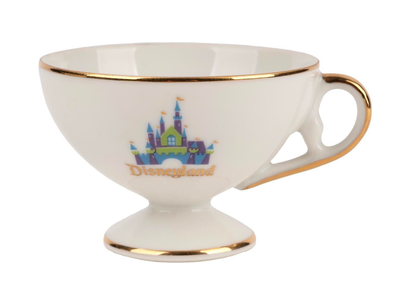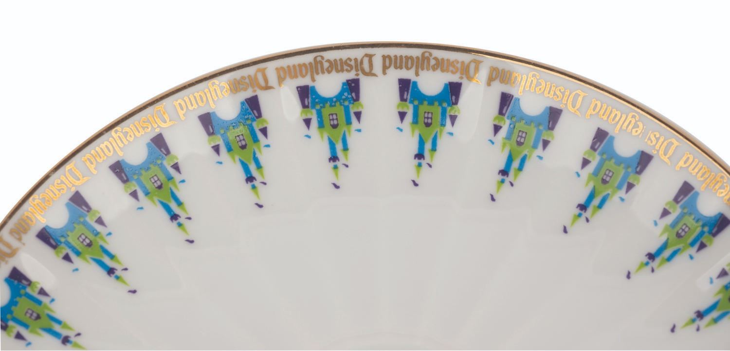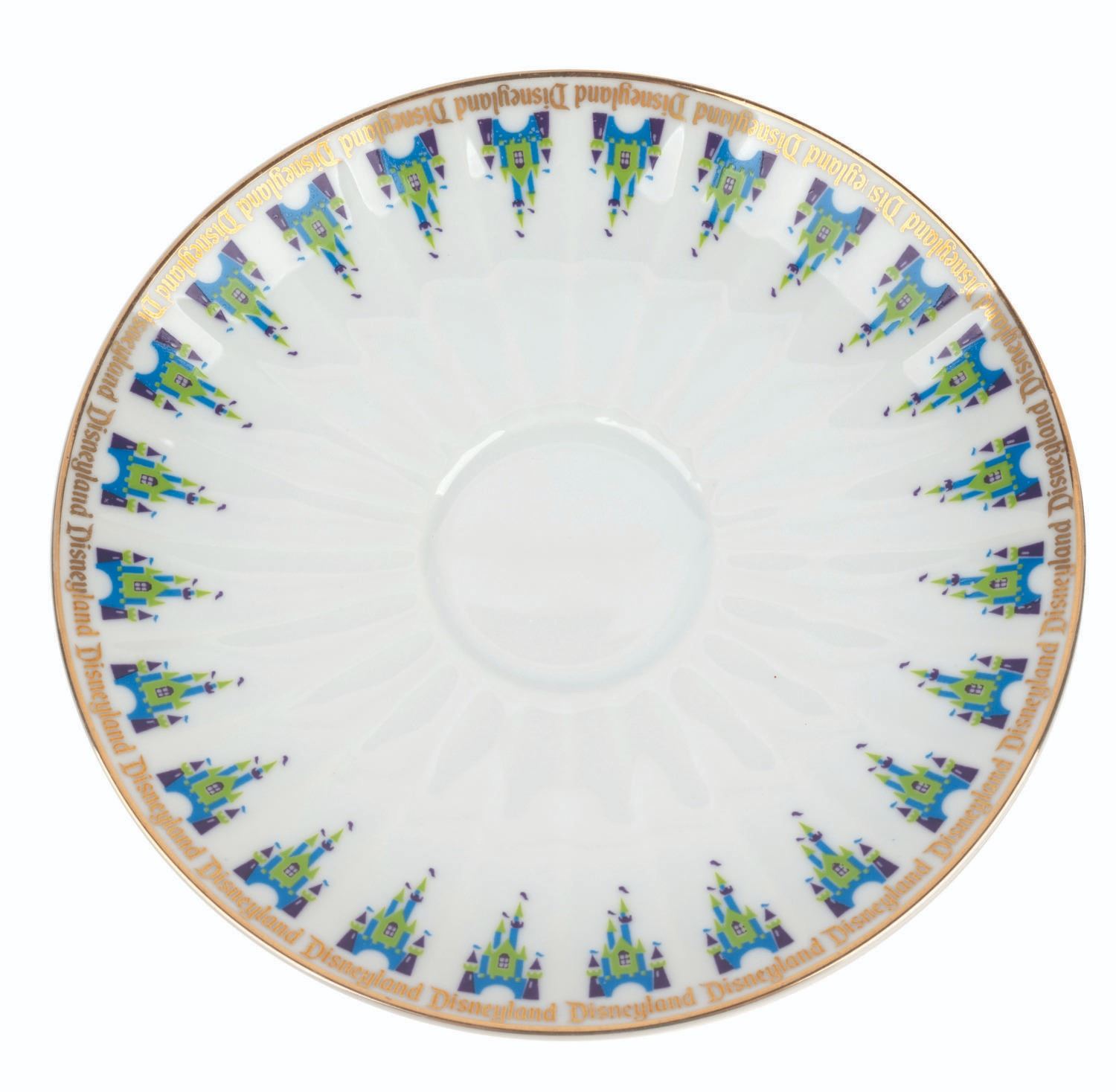 (Disneyland, 1970s) A collection of two teacups and two saucers with a stylized Sleeping Beauty Castle and gold accents. The saucers measure 4.75" and 6" in diameter, and the cups are 2.75" and 4" in diameter. All the pieces are in very good condition with slight wear to one spot of gold lettering on the 6" saucer.