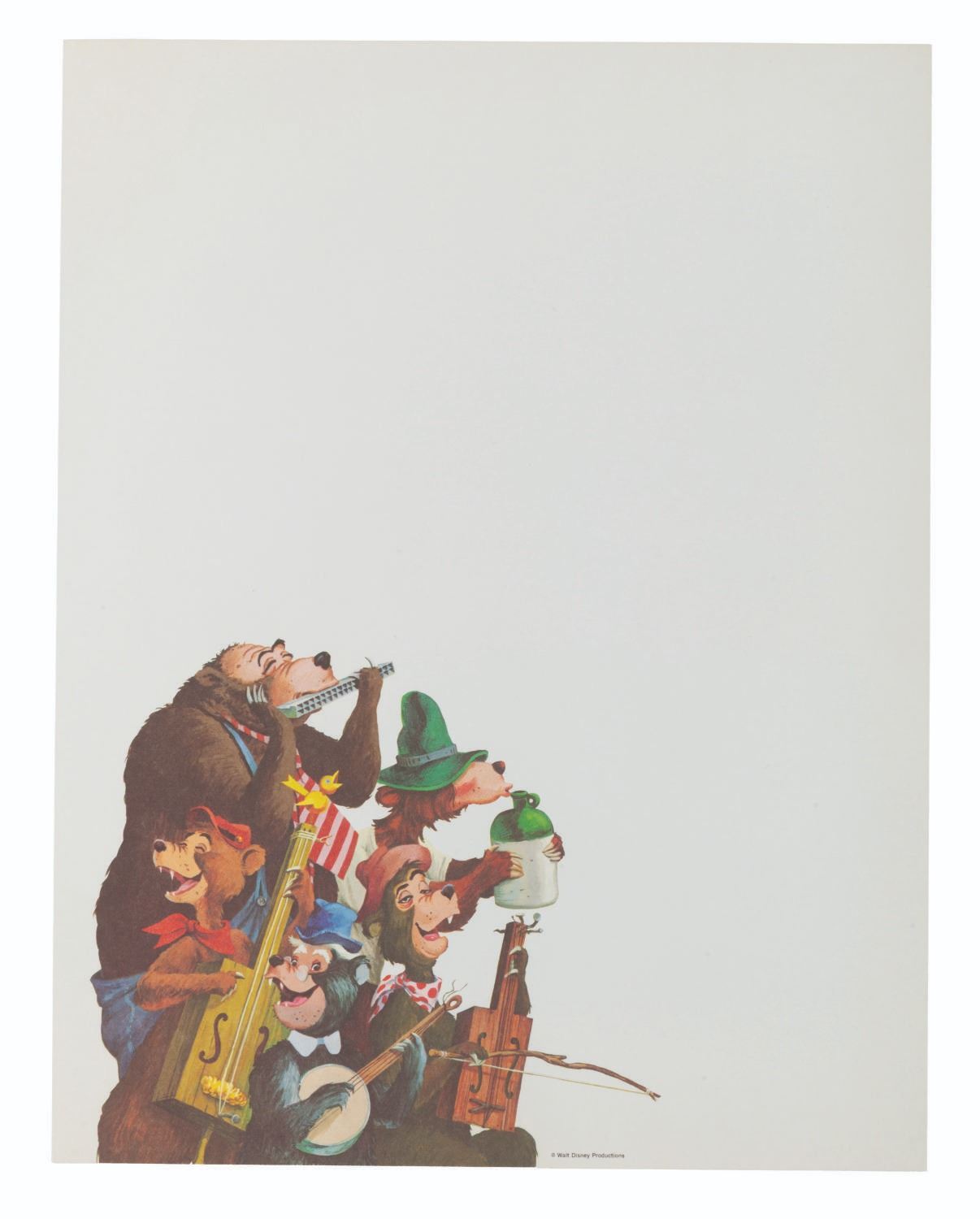 (Disneyland, 1970s) A collection of eight sheets of 1970s Disneyland stationery featuring imagery, events, and attractions. Included are America on Parade, 50 Years of Walt Disney Productions, Bear Country Jamboree, Mickey with a jet pack, and more. Measuring 8.5” x 11” each, the collection is in fine condition.