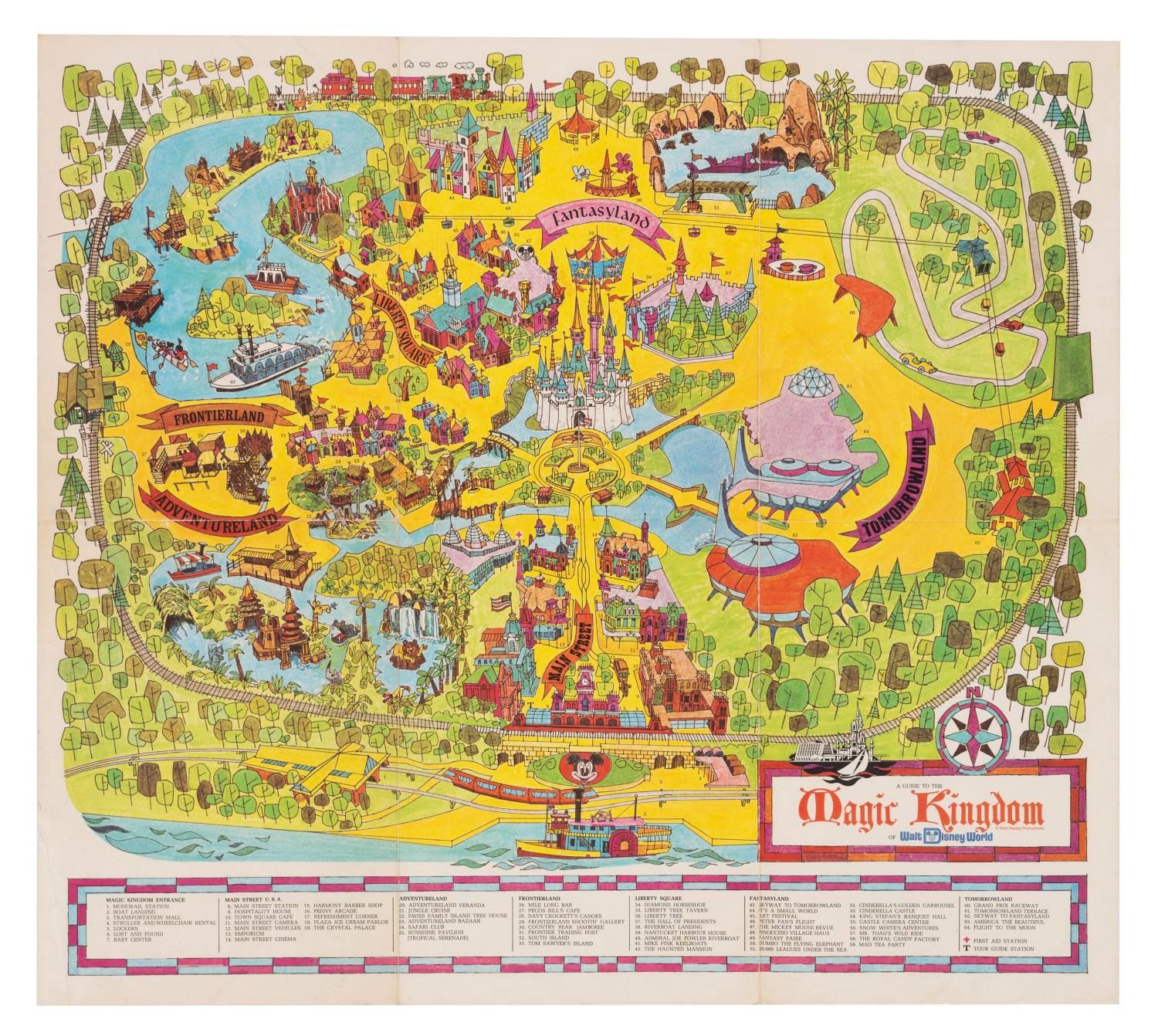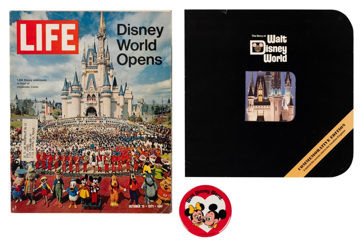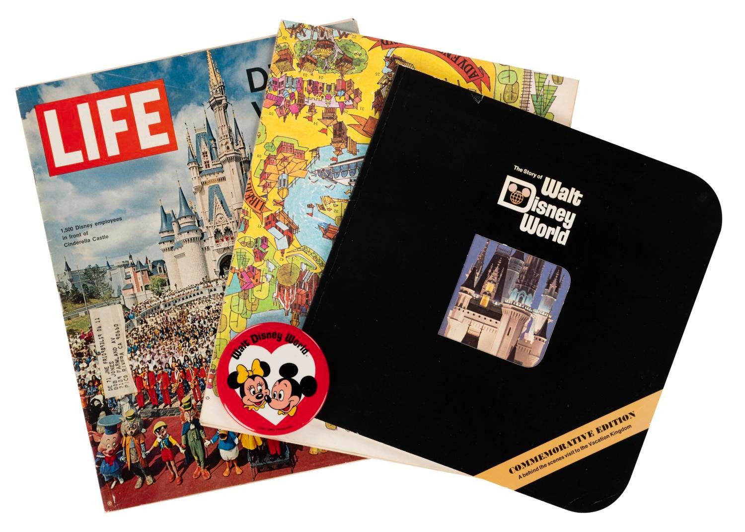 (Walt Disney World, 1971) A collection of early souvenirs including a "The Story of Walt Disney World" book, an October 1971 "Life" magazine about Disney World's opening, the first souvenir map of the Magic Kingdom, and a Mickey and Minnie button. Measuring 3.5" in diameter, the button is in very good condition with light scratches. The 11" x 11" book and 10.5" x 13.25" Life magazine are in good condition with scratches, creases, edge wear, and an address label on the cover. The map measures 25" x 28" and is in very good condition with creases, edge wear, and its original folds.