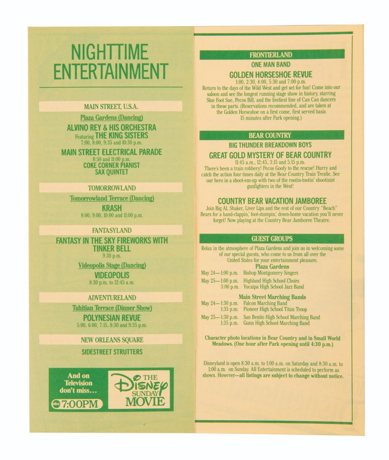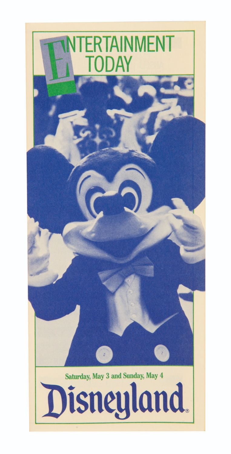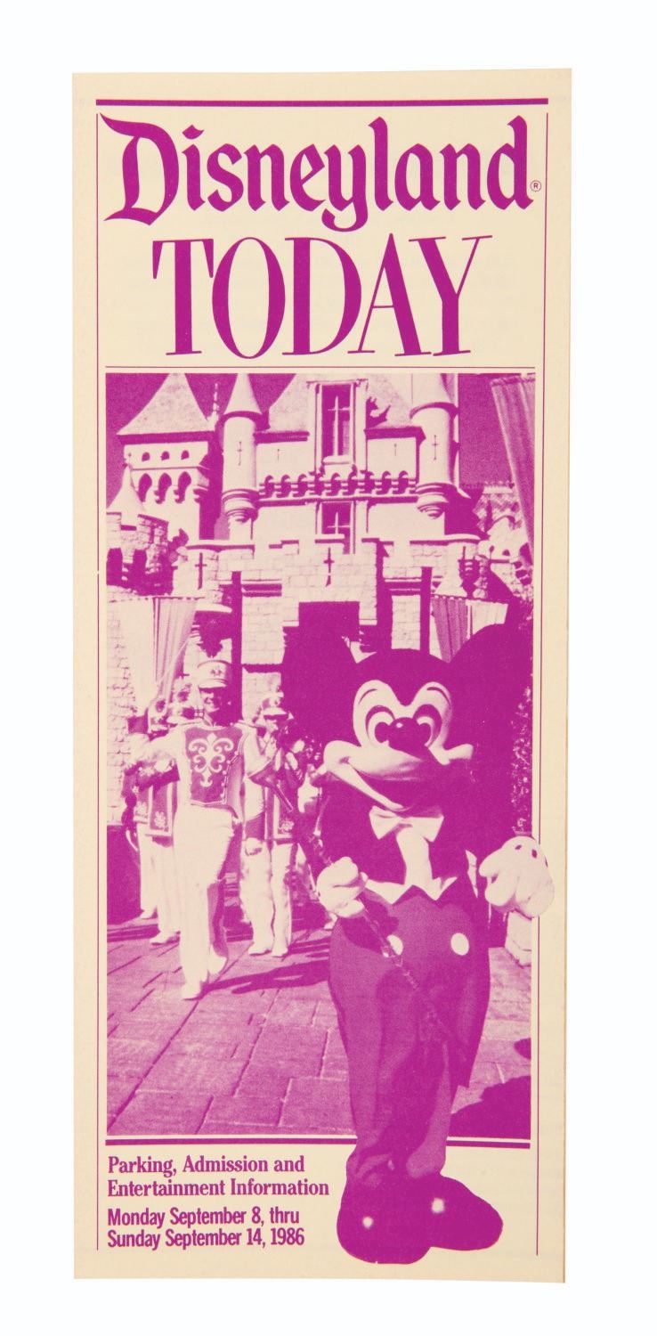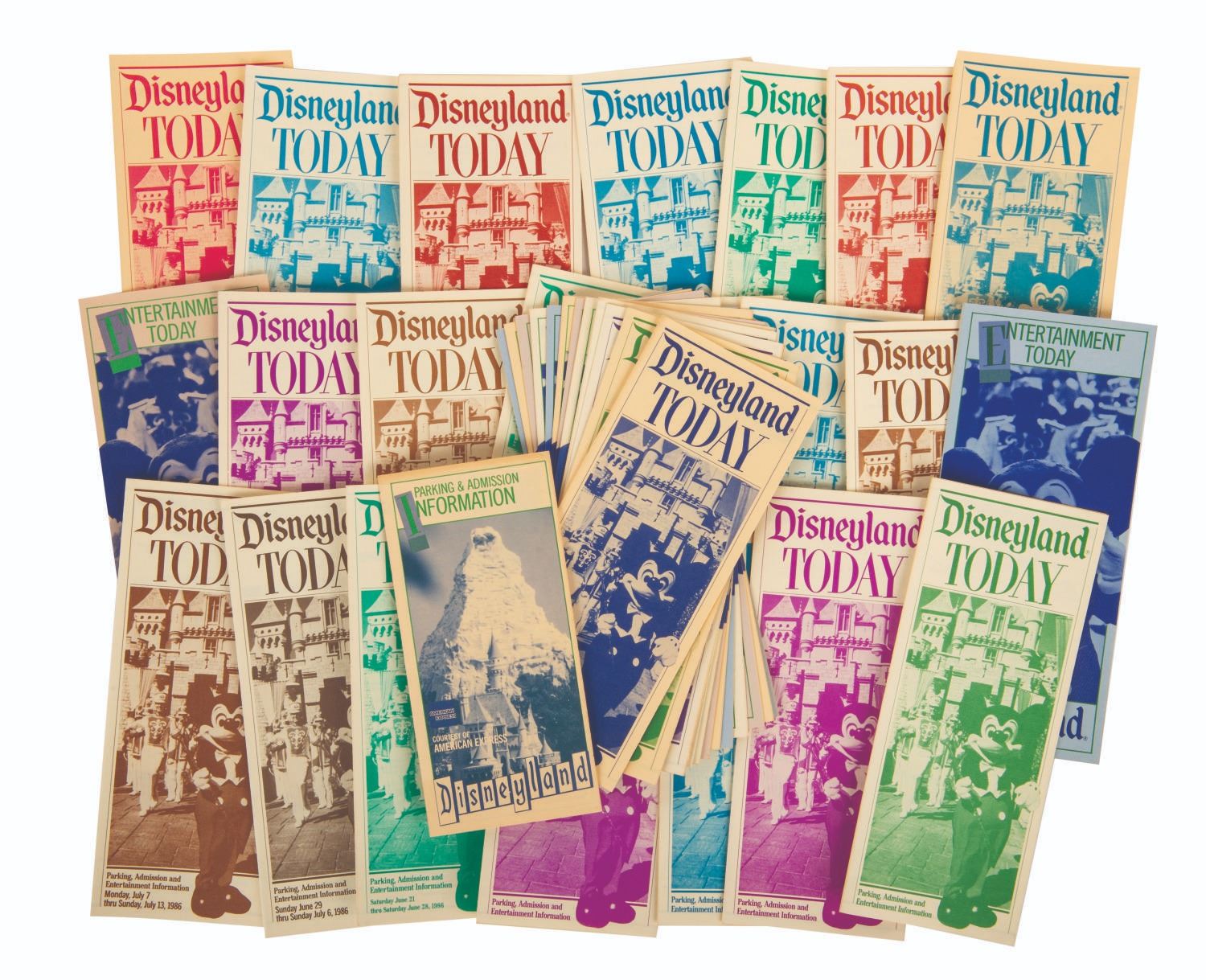 (Disneyland, 1986) An incredible collection of (35) "Disneyland Today" Main Gate handbills. Documenting April through September of 1986, the handbills promote special events, closings, and other happenings around the park. Also included is a Parking & Admission Information Guide. Measuring from 3.25"x7" to 3.5"x 8.5", the handbills are in fine condition.