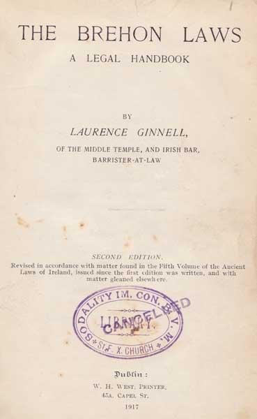The collection comprises: (1) Ginnell, Laurence. The Brehon Laws a Legal Handbook. West (Dublin), 1917. pp. iv, 145; (2) Coghlan Rev. Daniel. Trinity College: its Income and its Value to the Nation. Pp. 131, Postscript; (3) Cohalan, Most Rev. Dr. The Church & Christian Marriage. Gill, undated. Pp.67; (4) Macneill, Prof. Eoin. A Chapter of Irish Religious History. Pp.10; (5) Anon. Illustrated Guide to Dublin with Notes on its History, Antiquities, and Industries. Messenger Office. Undated. Pp. 84. Illustrated. (5 items)