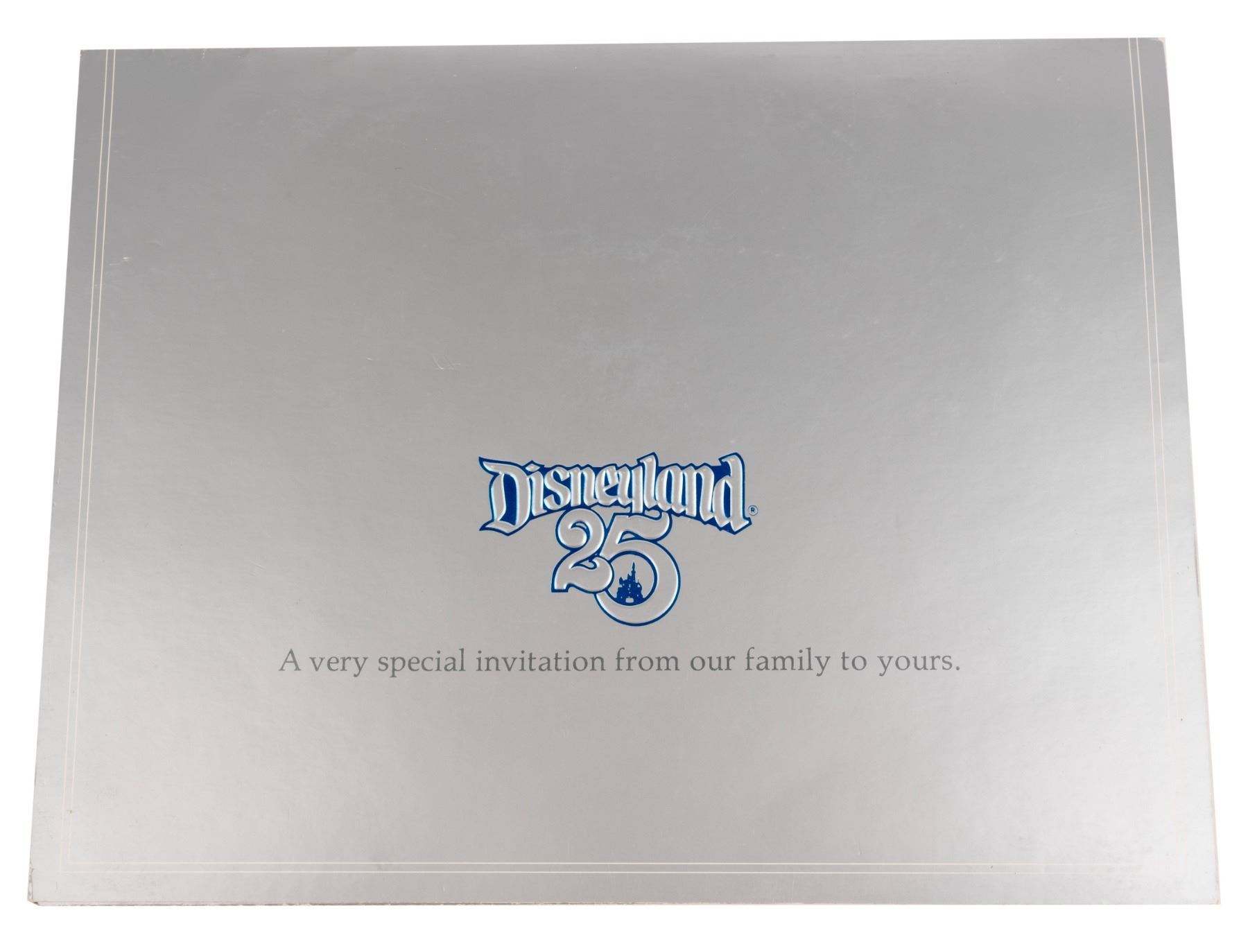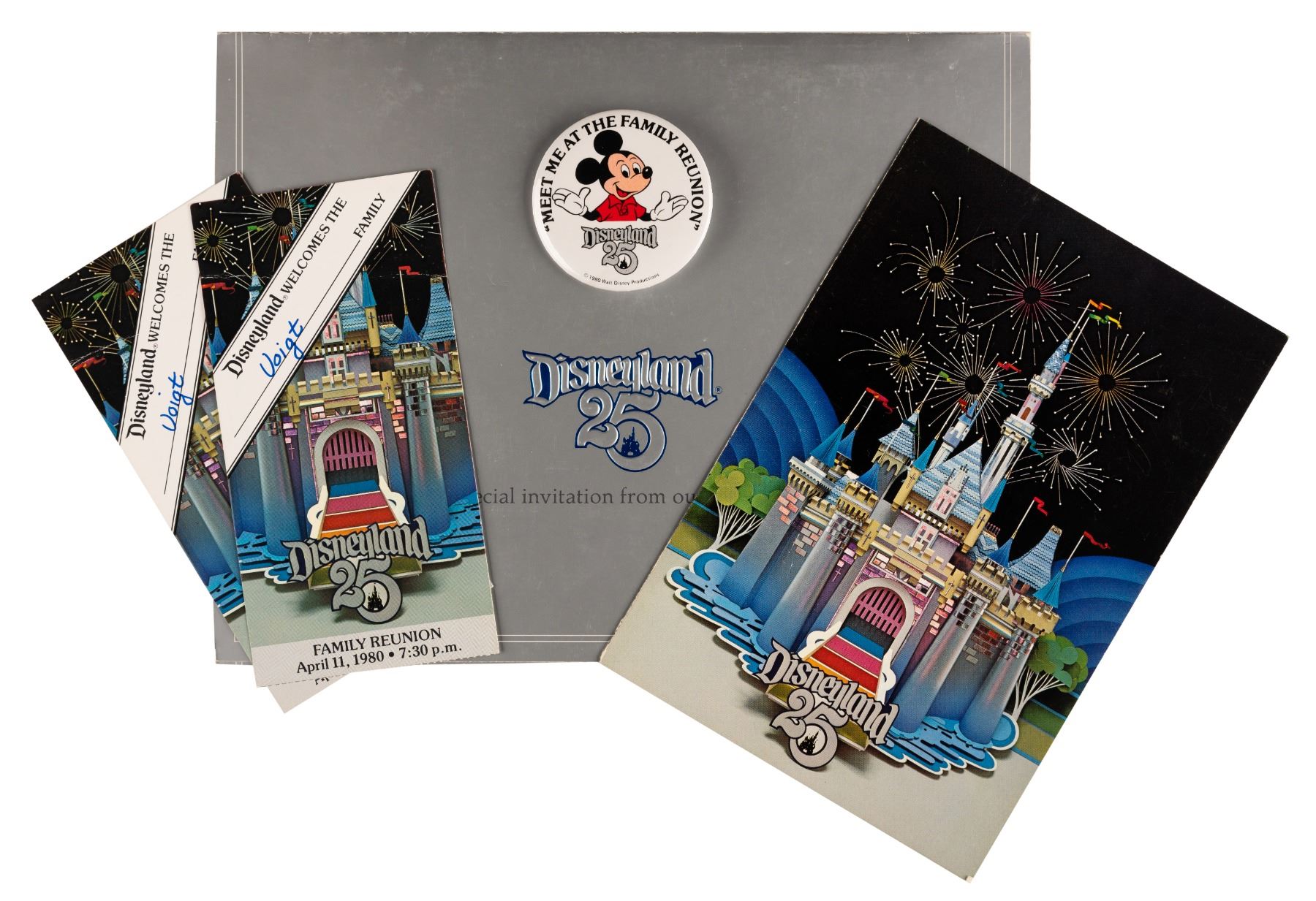(Disneyland, 1980) A collection of Disneyland 25th Anniversary Family Reunion memorabilia related to a special invitation only event. Included are a pop-up invitation, program, ticket, and button. All are in good used condition with light wear from use.Est. Opening Bid: $25.00