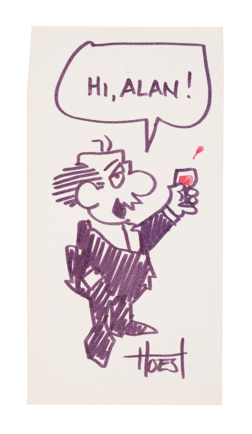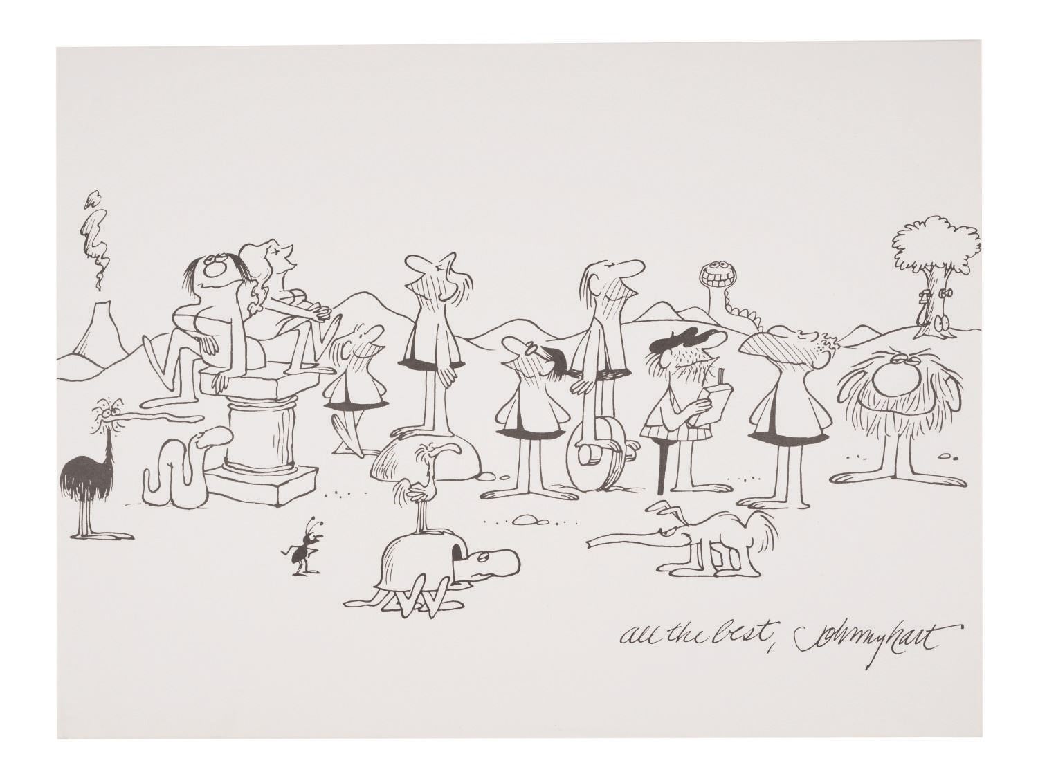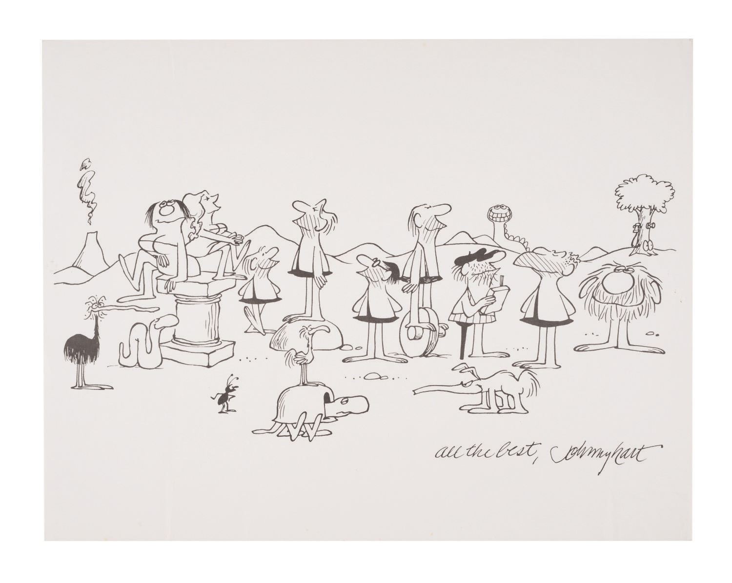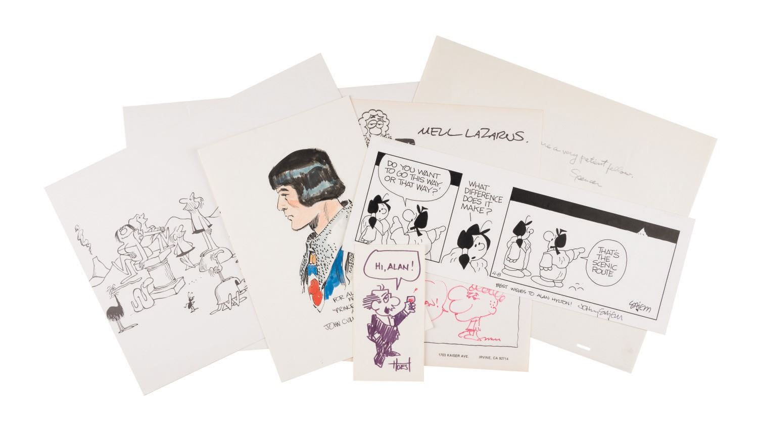 (The Hylton Collection) A collection of (6) original and printed artworks signed and dedicated by well-known comic strip artists and cartoonists. Included in the collection are an original drawing by Bill Hoest (The Lockhorns), A Letter with original drawing by Mel Lazarus (Momma), An original drawing of Prince Valient by John Cullen Murphy, an original daily strip by Johnny Sajem (Seaweed), and two printed cards featuring the B.C. Cast with facimille Johnny Hart Signatures, Measuring various sizes from 5.75"x3" to 13.75"x10.5", the artwork is in fine overall condition.