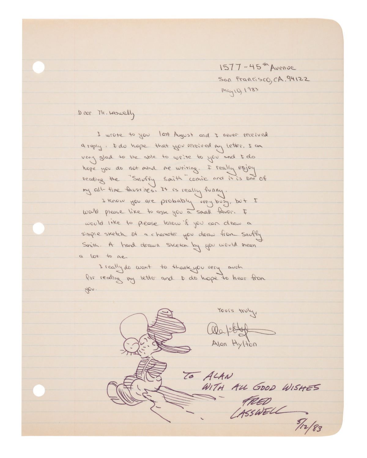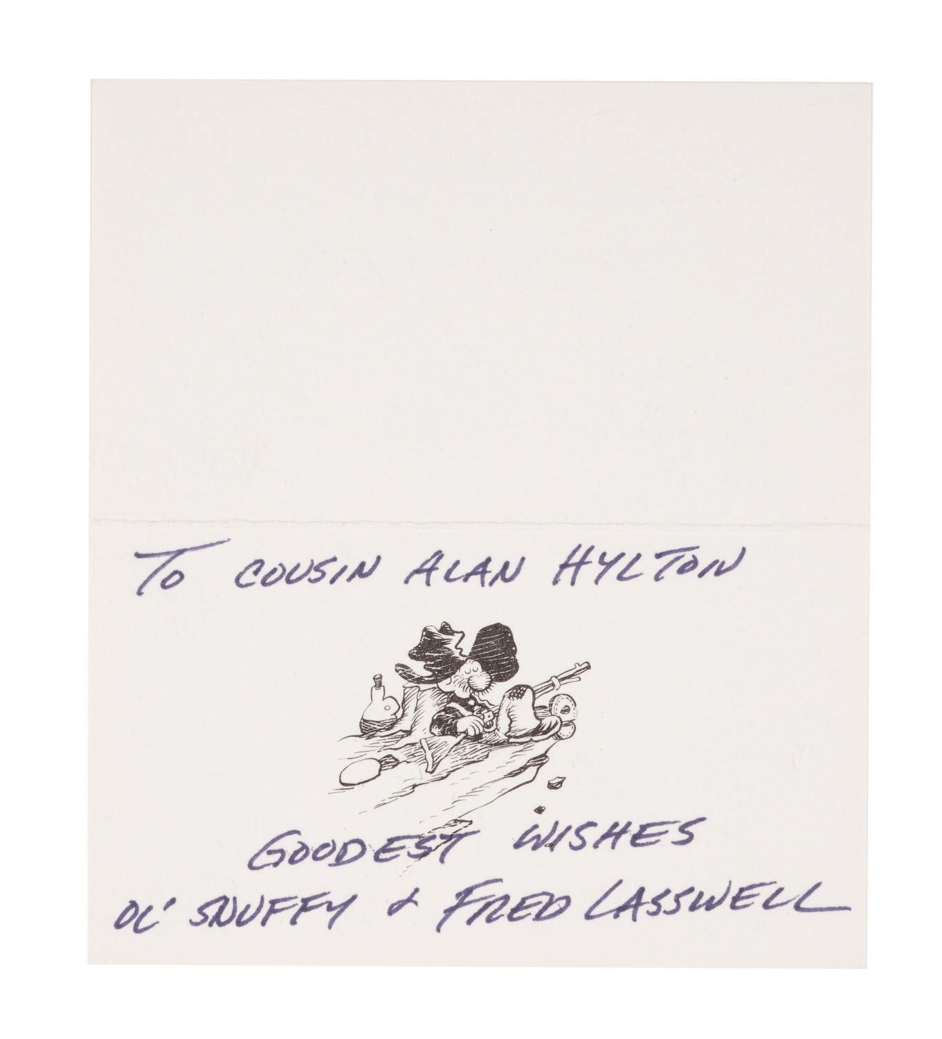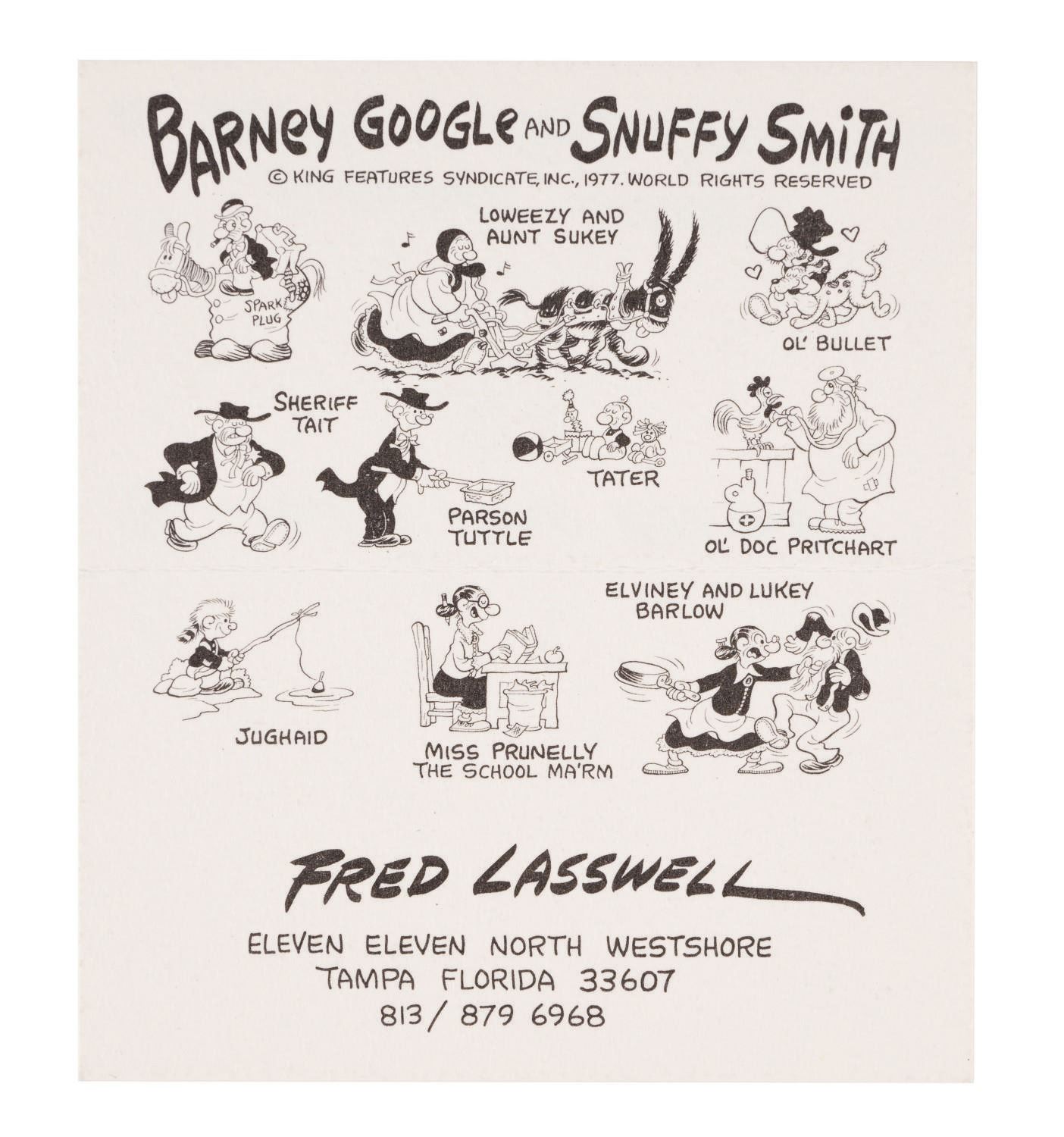 (The Hylton Collection) A collection of (6) original and printed artworks signed and dedicated by well-known comic strip artists and cartoonists. Included in the collection is a drawing of Dennis the Menace signed by Hank Ketcham, a Leroy Lockhorn drawing by Bill Hoest, a Moon Mullins drawing by Ferd Johnson, a Fred Basset drawing by Alex Graham , and signed letter and business card featuring Snuffy Smith by Fred Laswell. Measuring various sizes, the pieces display in fine condition.