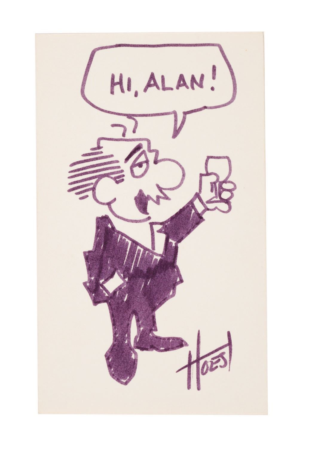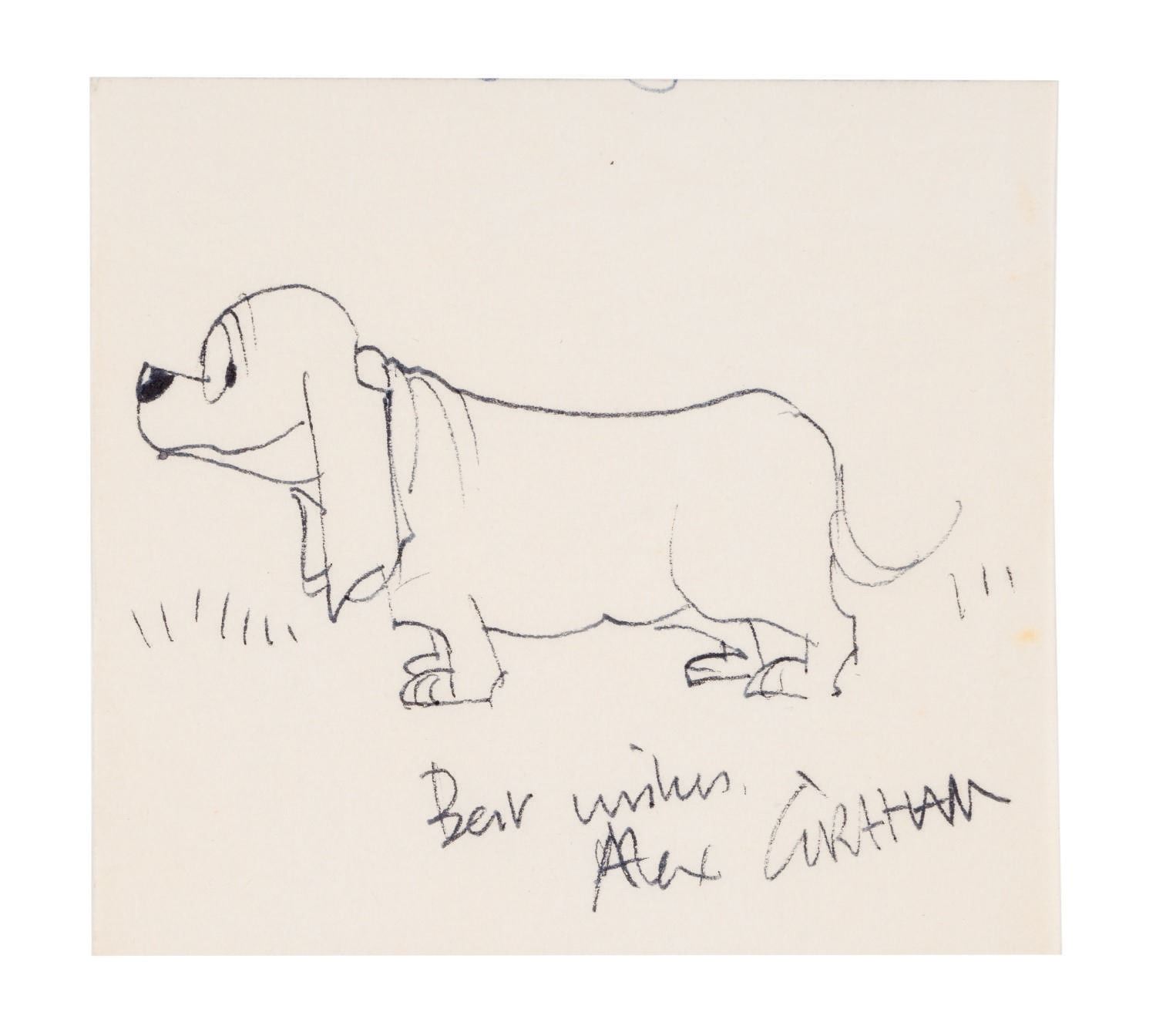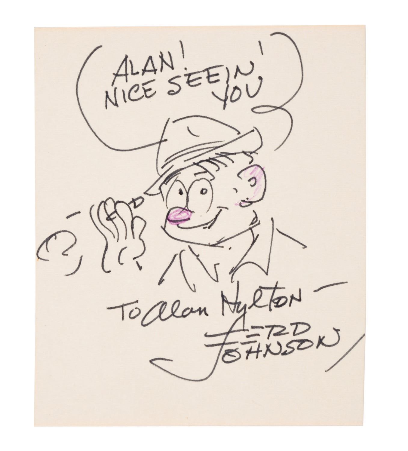 (The Hylton Collection) A collection of (6) original and printed artworks signed and dedicated by well-known comic strip artists and cartoonists. Included in the collection is a drawing of Dennis the Menace signed by Hank Ketcham, a Leroy Lockhorn drawing by Bill Hoest, a Moon Mullins drawing by Ferd Johnson, a Fred Basset drawing by Alex Graham , and signed letter and business card featuring Snuffy Smith by Fred Laswell. Measuring various sizes, the pieces display in fine condition.