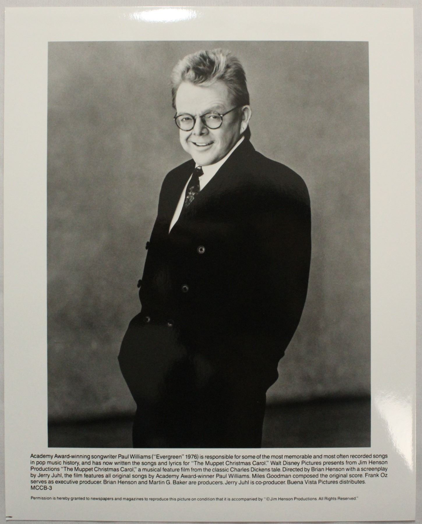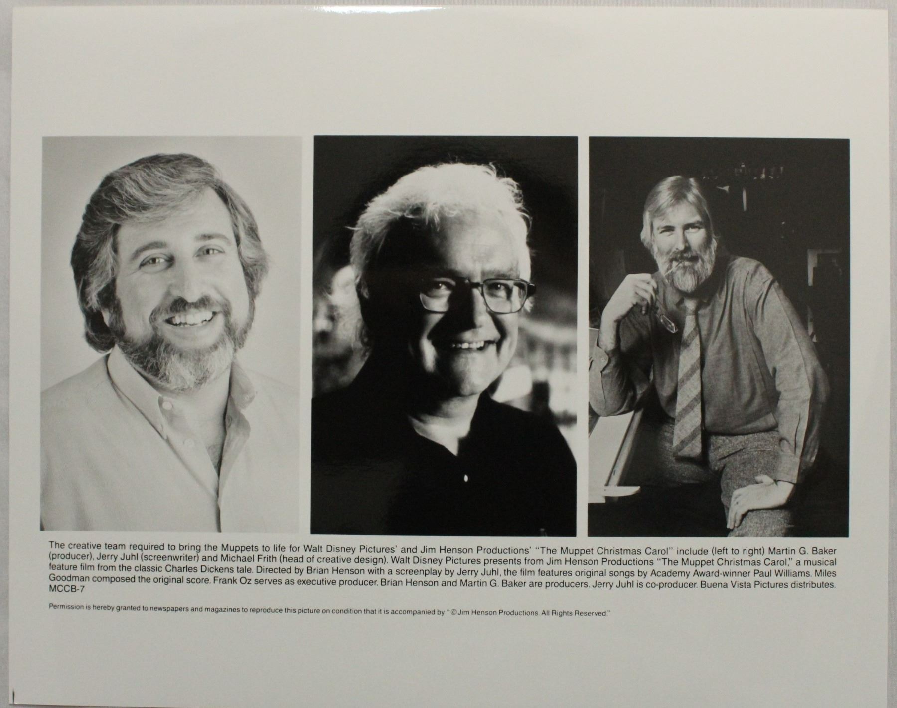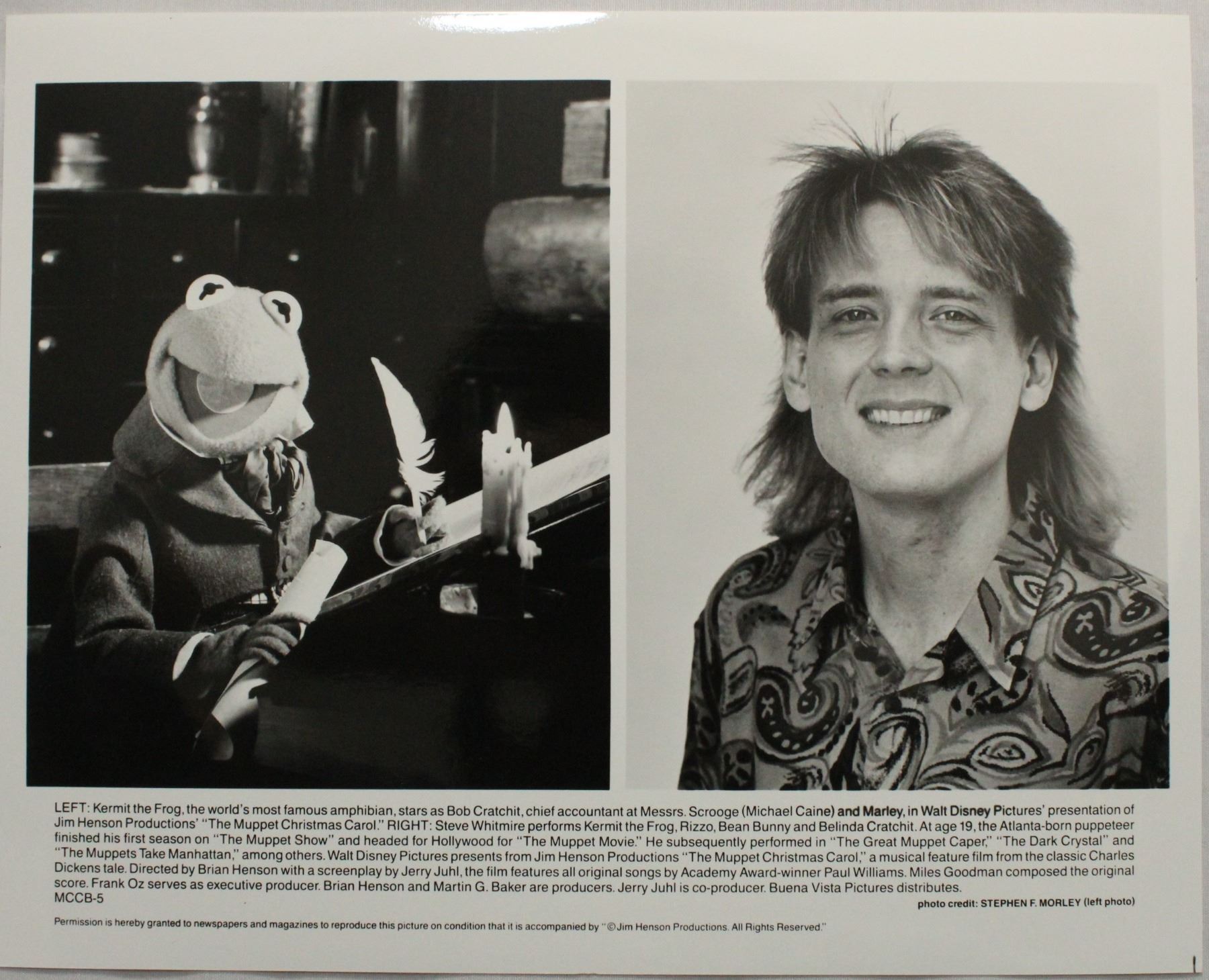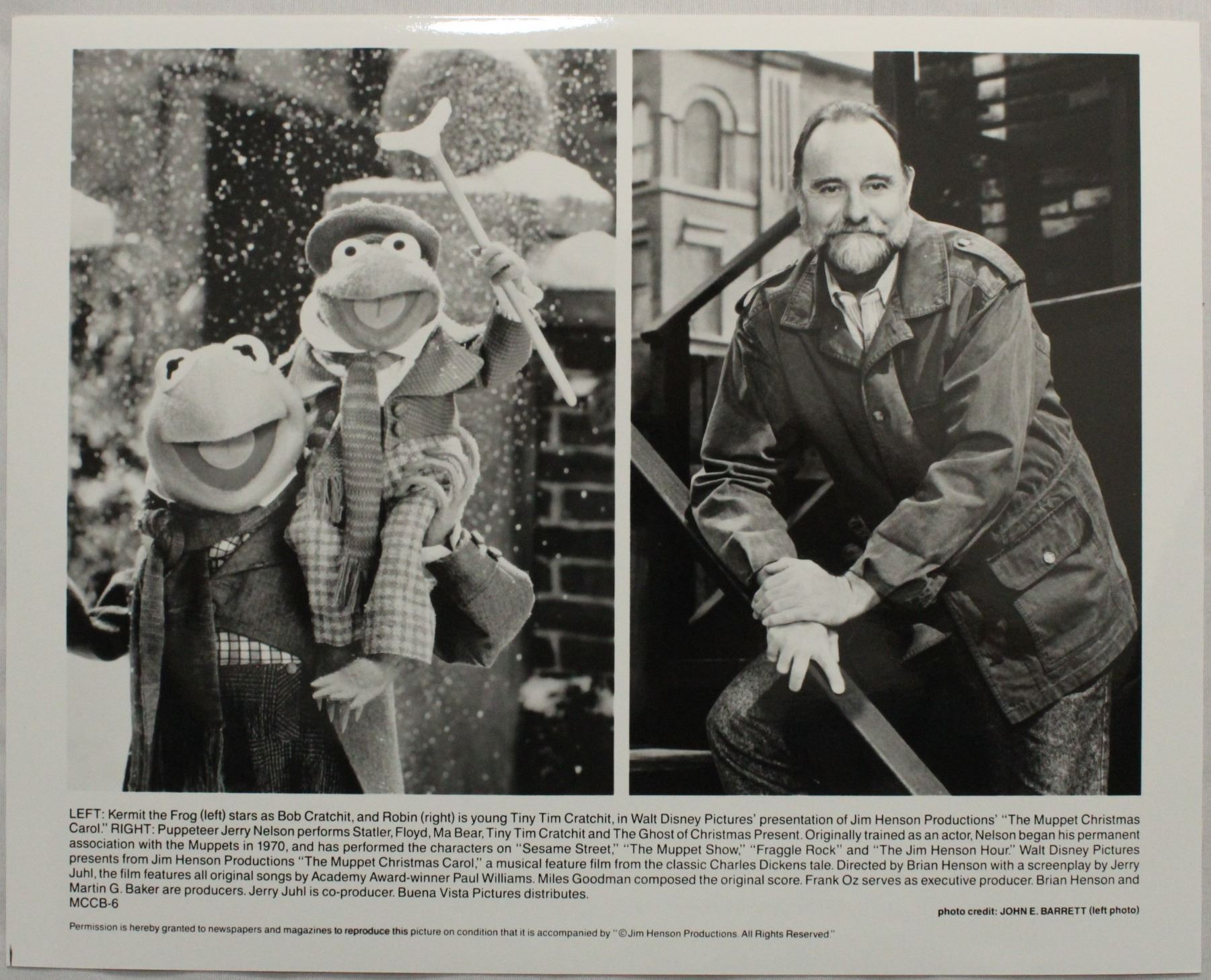 (Jim Henson Productions, 1992) This is a set of seven press photos for the 1992 Muppet Classic, The Muppet Christmas Carol. Photos include Brian Henson, Frank Oz, Gonzo, David Goelz, Kermit the Frog, Steve Whitmire, Robin the Frog, Jerry Nelson, Martin baker, Jerry Juhl, Michael Frith, Michael Caine, Miss Piggy, and Paul Williams. The photos are in near mint condition measuring 10" by 8".