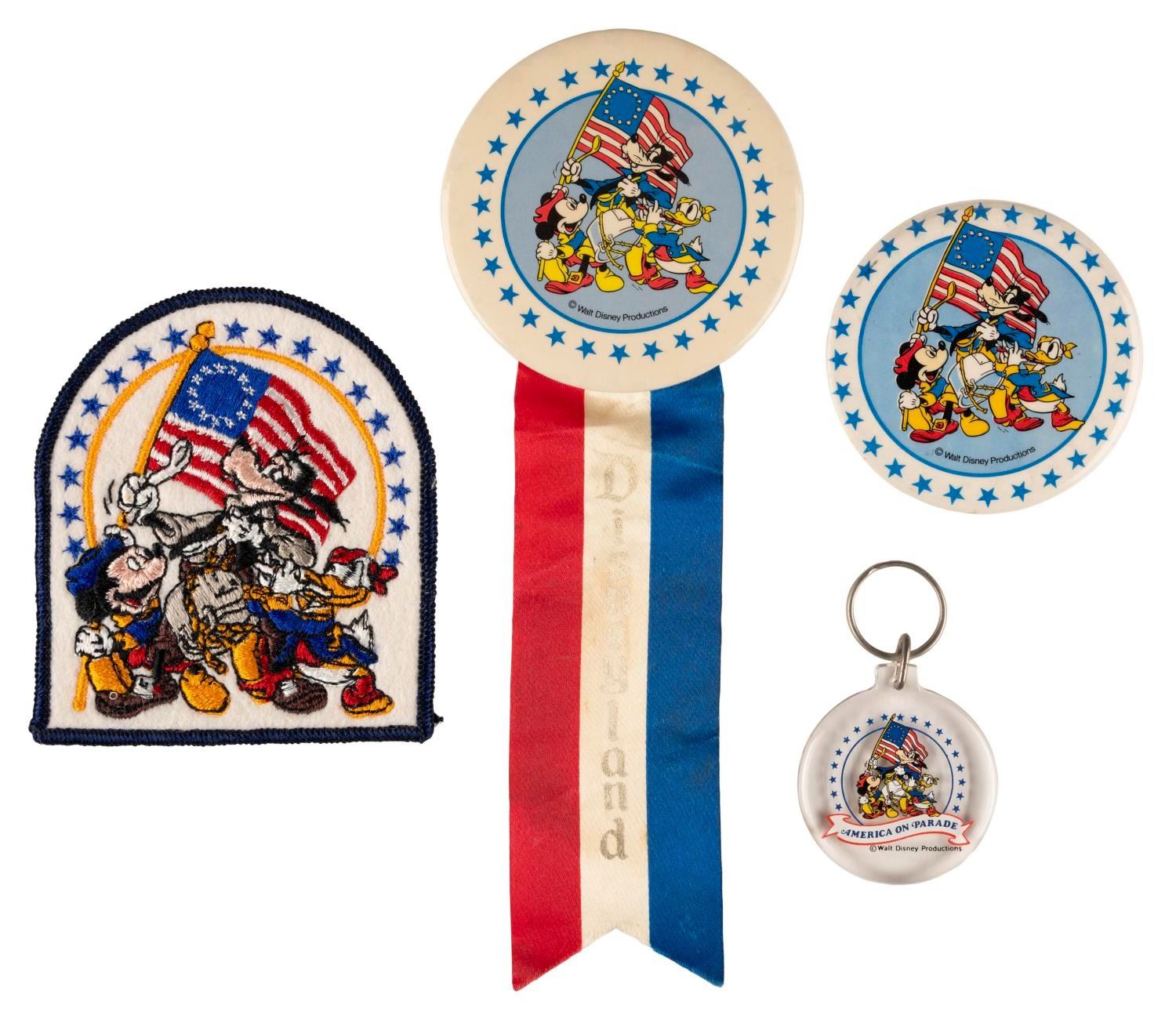 (Disneyland, 1976) A collection of souvenirs from Disneyland's bicentennial celebration "America on Parade," including an embroidered shoulder patch, two pinback buttons (one with a ribbon), and a keychain. Measuring from 3" diameter up to 3.5" x 9", the items are in very good condition with light handling wear.