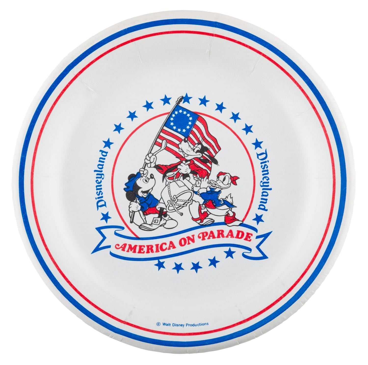 (Disneyland, 1976) A collection of 12 disposable paper plates in two different sizes from Disneyland's bicentennial celebration "America On Parade." Measuring 7" in diameter and 9" in diameter, the plates are in very good condition.