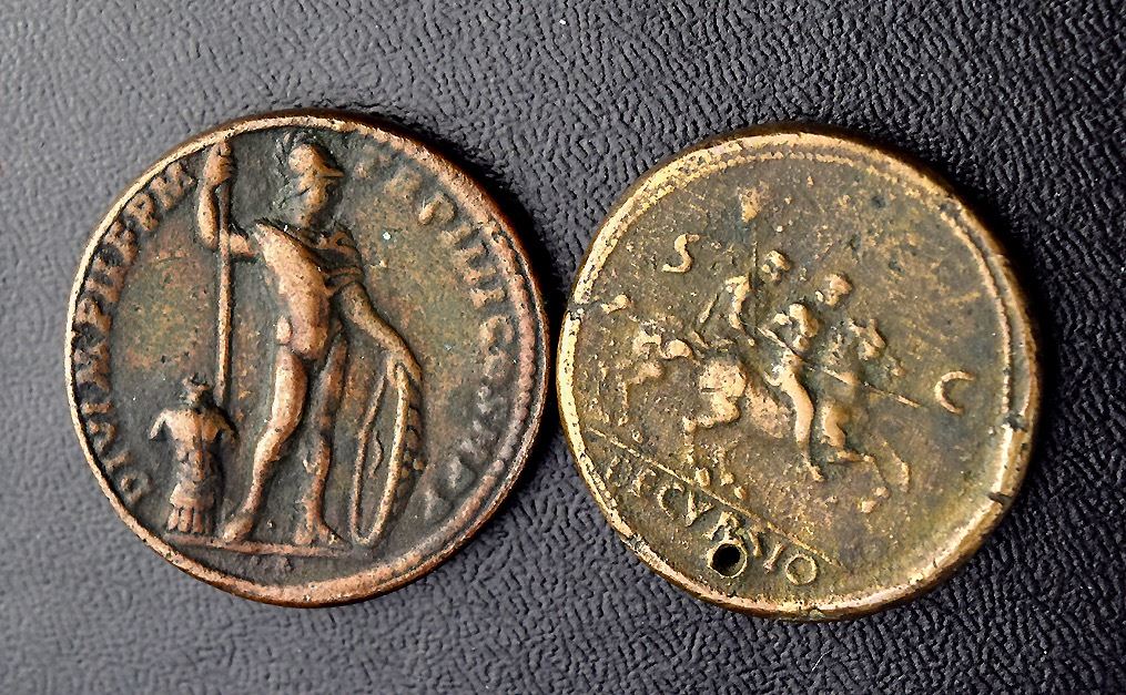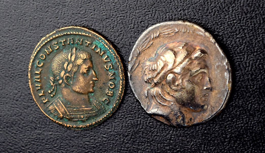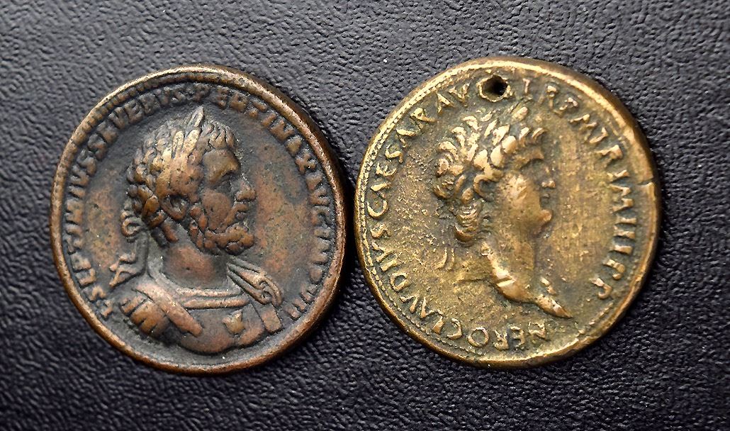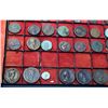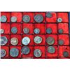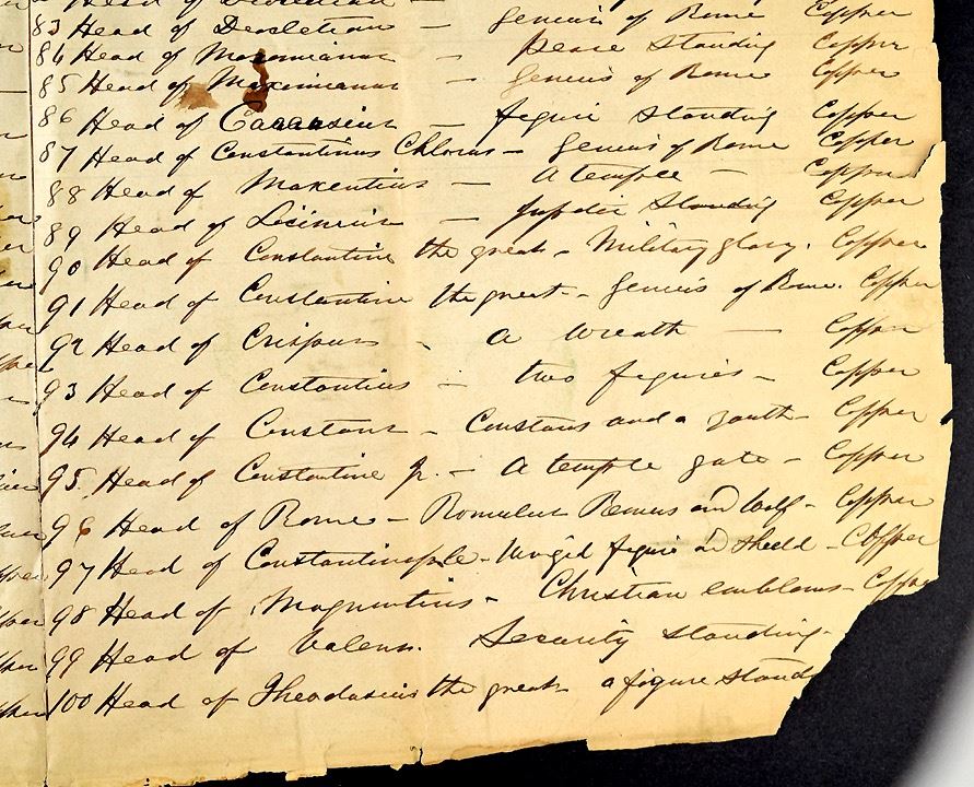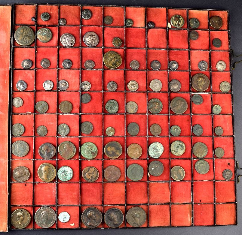 The Victorian white metal hinged customized case is finished in green and black and centered with his name in large gilt block letters, opening to reveal a velvet lined interior, fitted with one hundred compartment squares now containing eighty-three (83) coins and medallions, comprising: ancient Greek and Roman coins as well as five or six antique counterfeits. One of the case hinges is somewhat damaged.