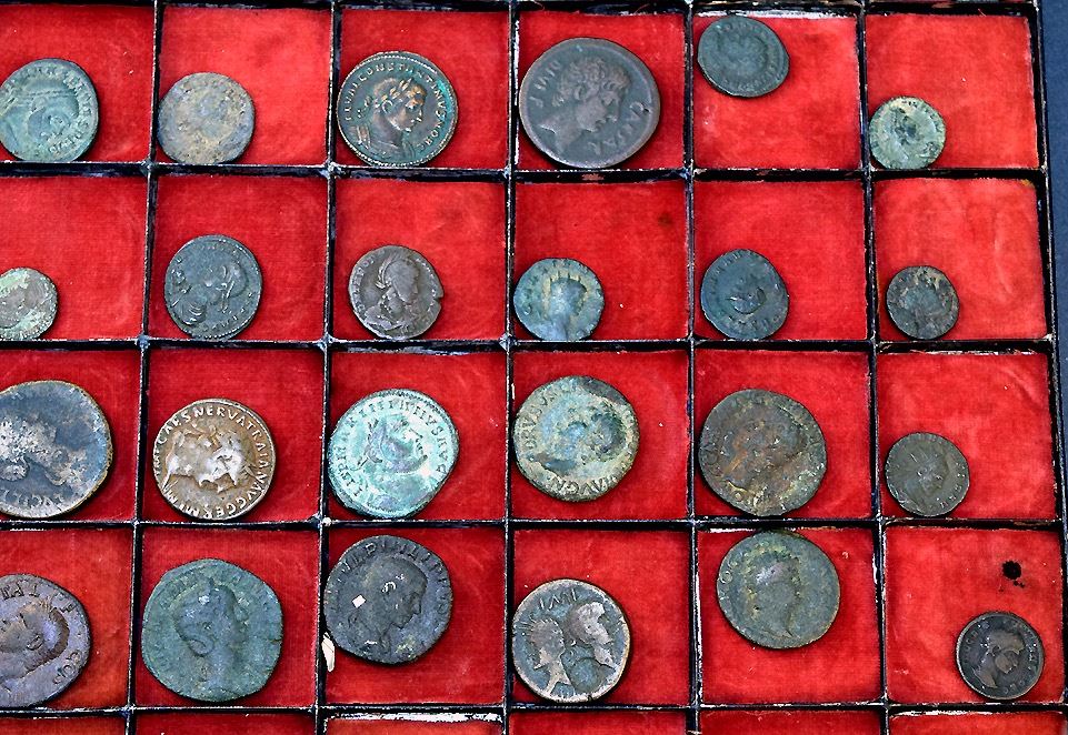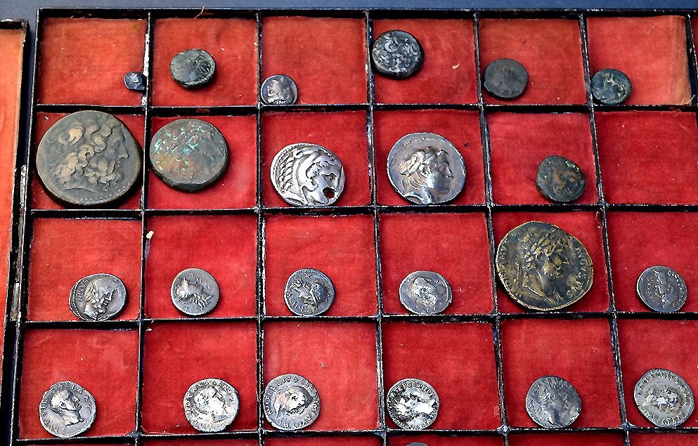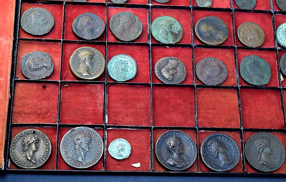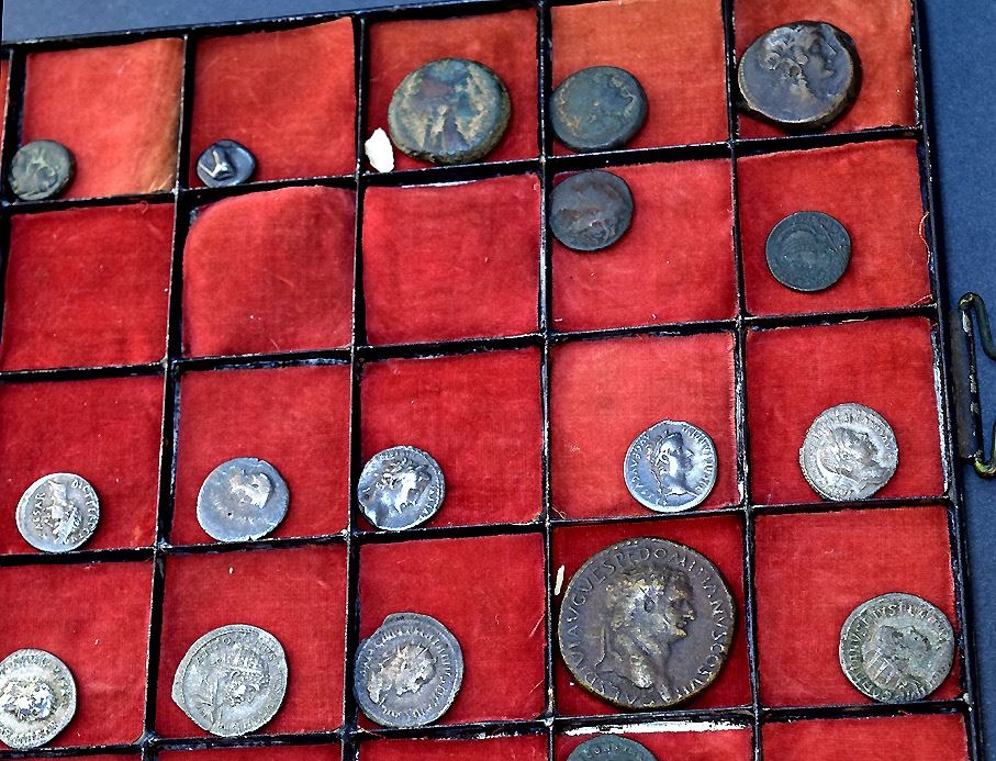 An Interesting collection of Ancient Coins, as arranged & presented at lectures by Mr. Stanley Clark Bagg (1820-1873), Montreal’s Premier Antiquarian and Numismatist; in his original named Travel case, with his handwritten inventory list, circa mid nineteenth century. 39 cm. x 39 cm.