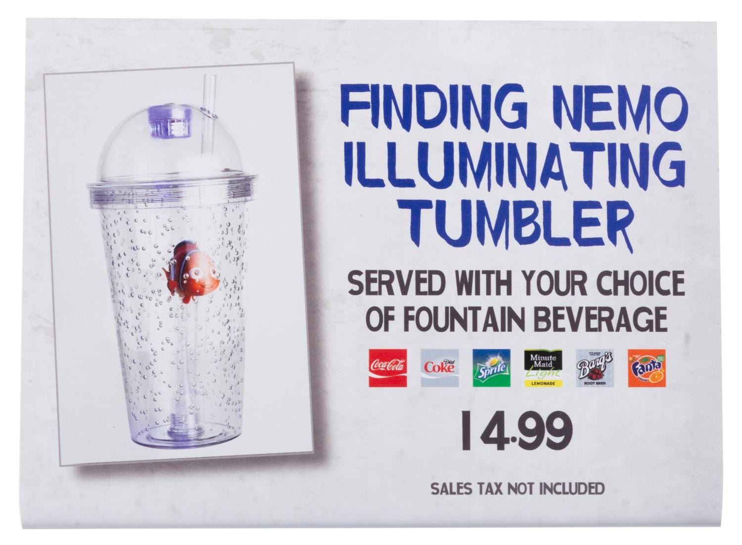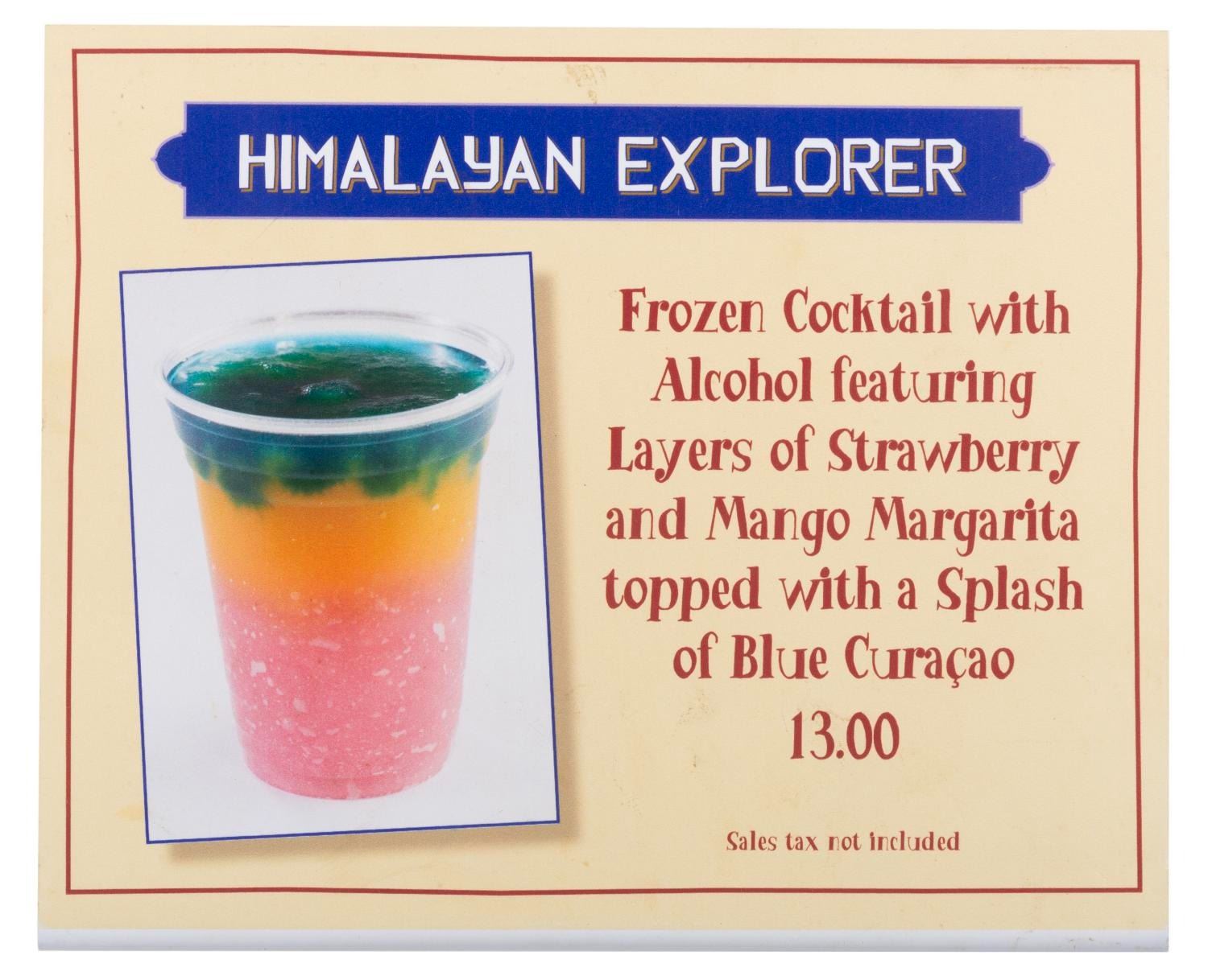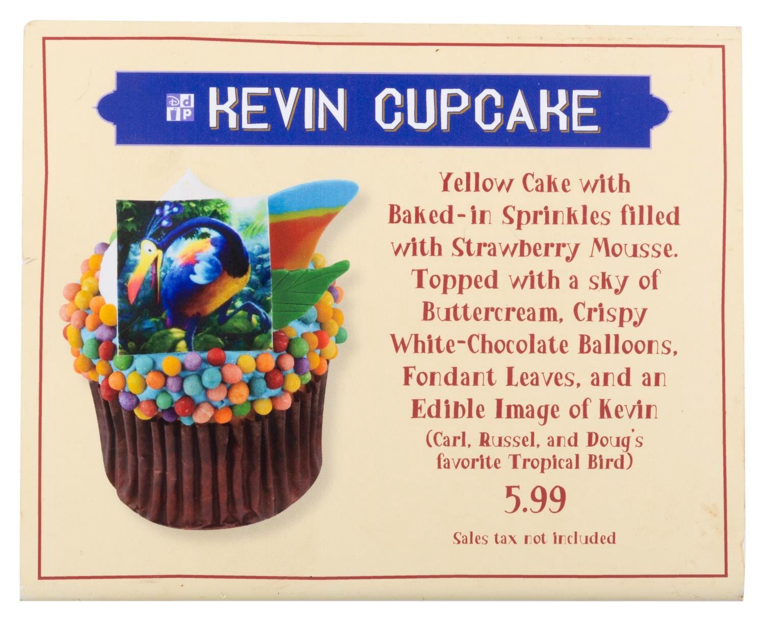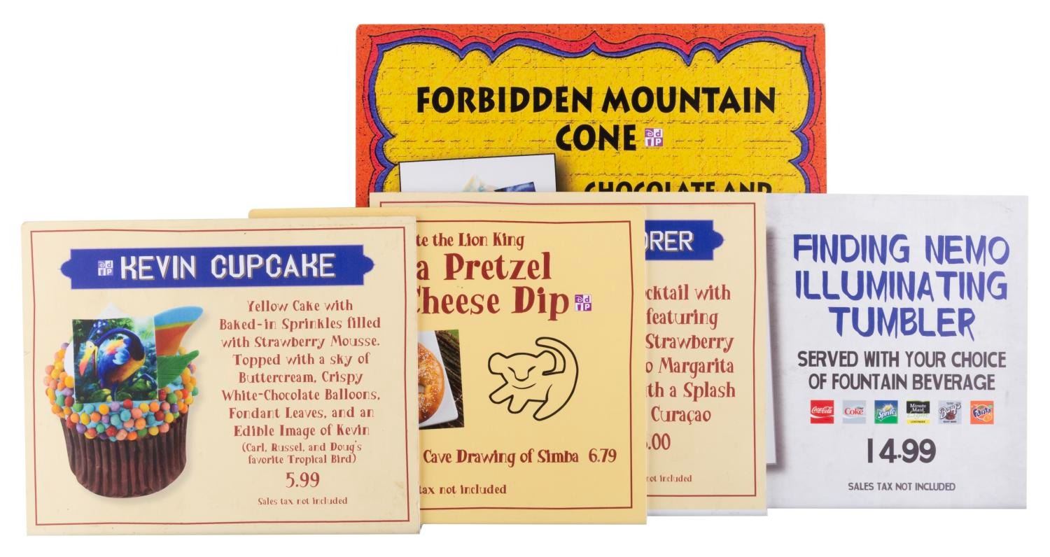(Disney’s Animal Kingdom, 2000s) A collection of Animal Kingdom food item signs, including a Simba Pretzel, a Kevin (from “Up”) Cupcake, a Finding Nemo Tumbler, a Himalayan Explorer cocktail, and a Forbidden Mountain Cone. Measuring from 3.5” x 10” x 8” to 4” x 12” x 11.75” high, the signs are in good to very good condition with typical wear from Park display.