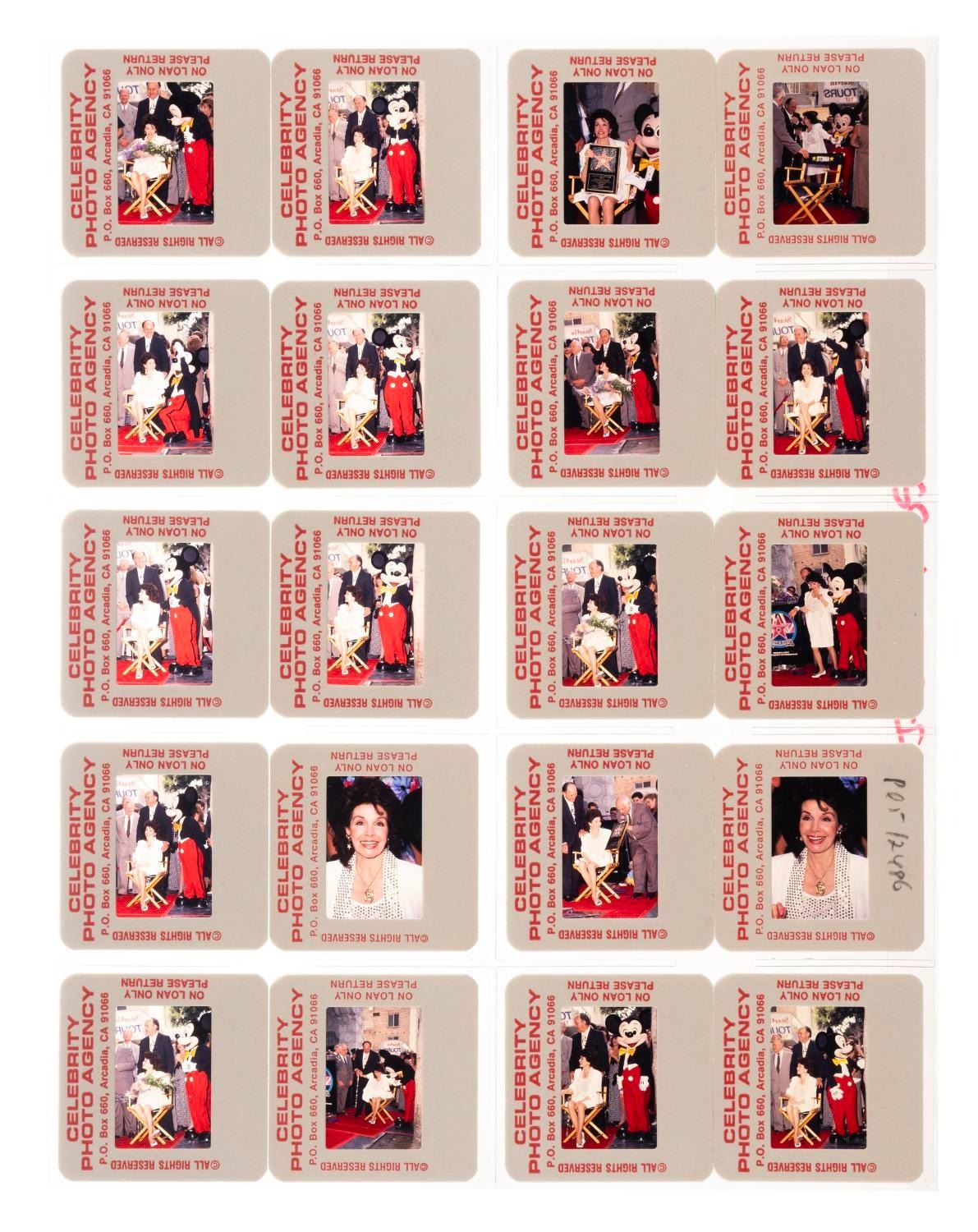 (Annette, 1993) A collection of twenty color slides of original Mouseketeer Annette Funicello receiving a Walk of Fame star for her work in motion pictures. Funicello became a Disney Legend for her work in film and television the year prior. Each slide measures 2" x 2" in an 8.5" x 11" plastic sleeve. The slides are in very good condition with minimal scratching and graphite writing on the reverse of one slide.