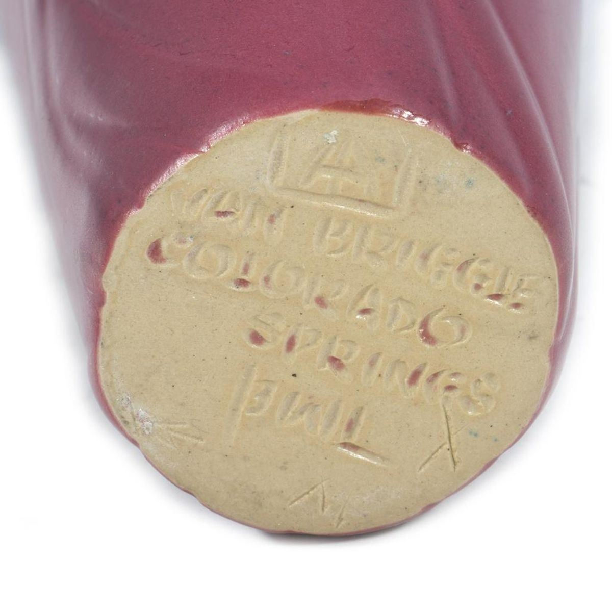 Including a pair of Van Briggle candlesticks, 4in. h; and a Van Briggle vase, 9 1/2in. h.; all signed on base. Together with a Roseville bowl, 3in. h., and Roseville long bowl, 3in h. 9in l., signed on base.