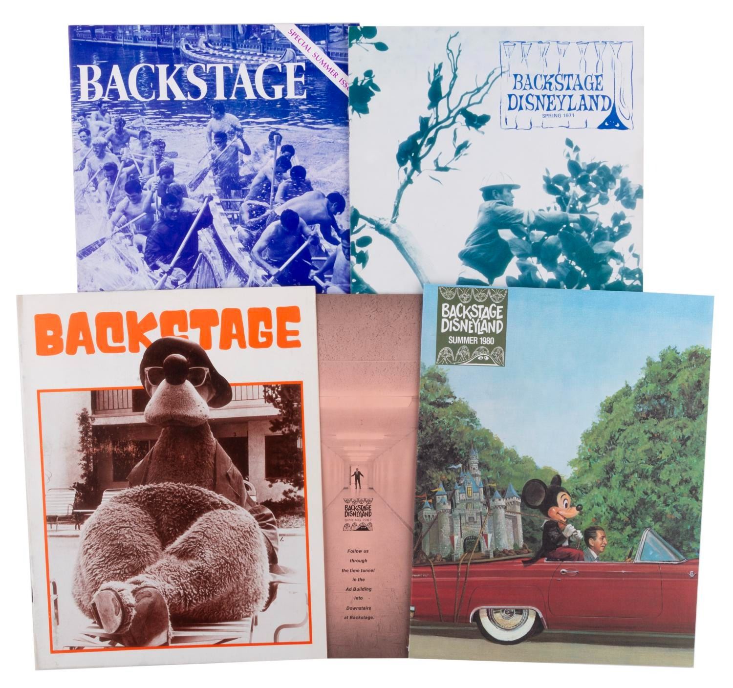 (Disneyland, 1964-80) A collection of five issues of Backstage Disneyland, including Spring 1967, Summer 1969, Spring 1971, one from 1972, and the final issue from 1980. These magazines provide a unique look into the Disneyland Backstage Area and include great photos, anecdotes, cartoons, and recipes contributed by Cast Members. Measuring 8.25” x 10.75” to 8.5” x 11”, the magazines are in good to very good condition with light edge wear.
