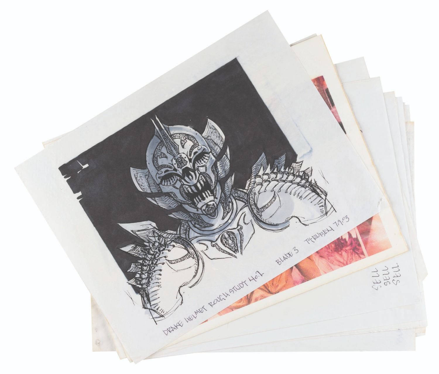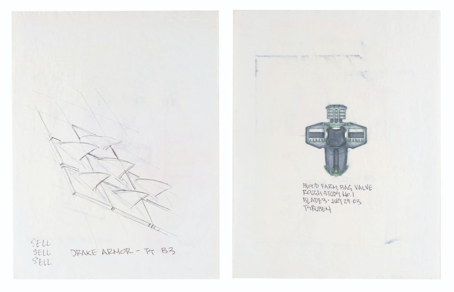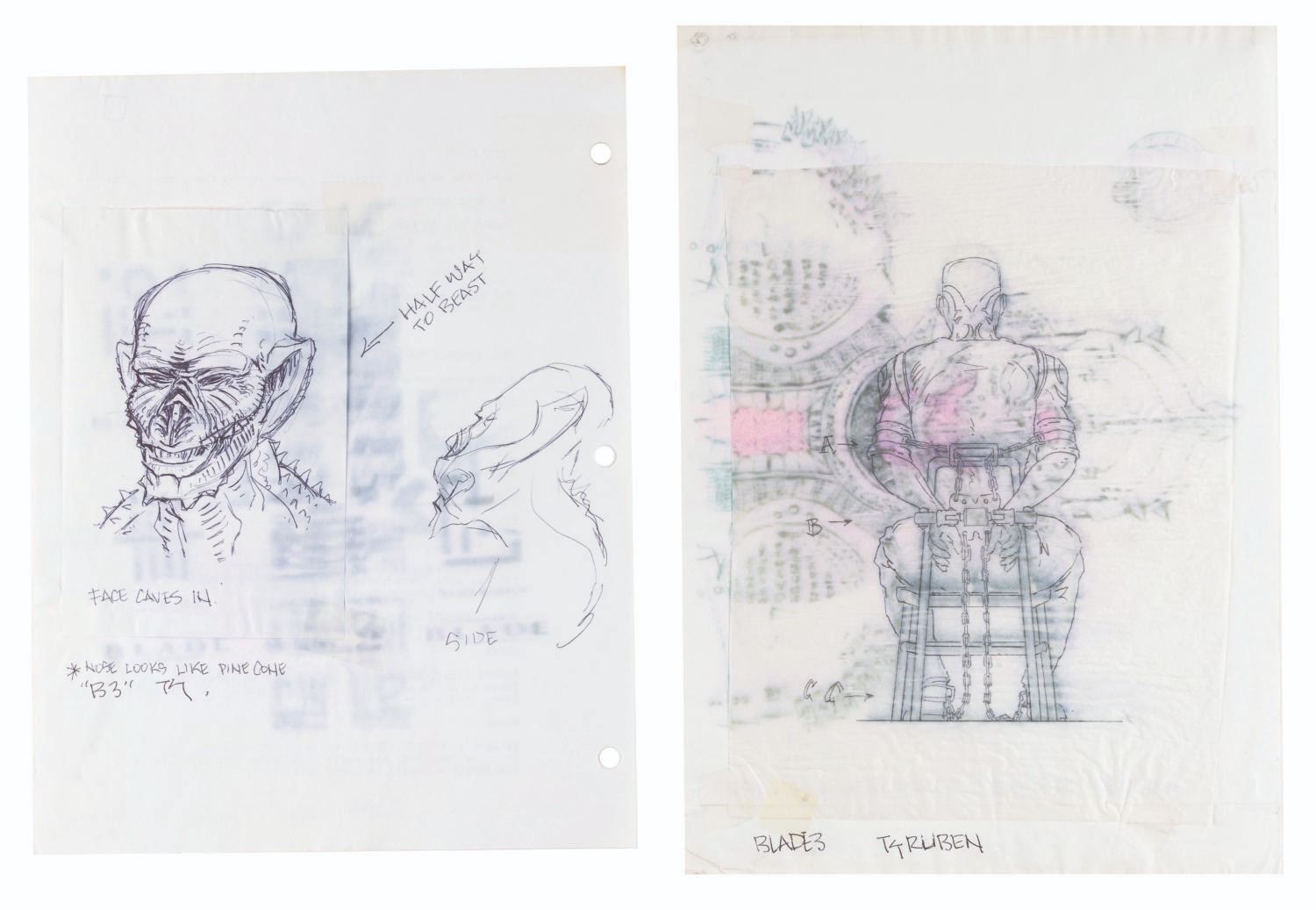(New Line Cinema, 2004) A collection of hand-drawn designs by conceptual artist Ty Ruben for the film "Blade: Trinity." Accomplished in ink, marker, and graphite, the drawings measure 8.5” x 11” and 8.5” x 12”, and are in fair condition with some water damage.