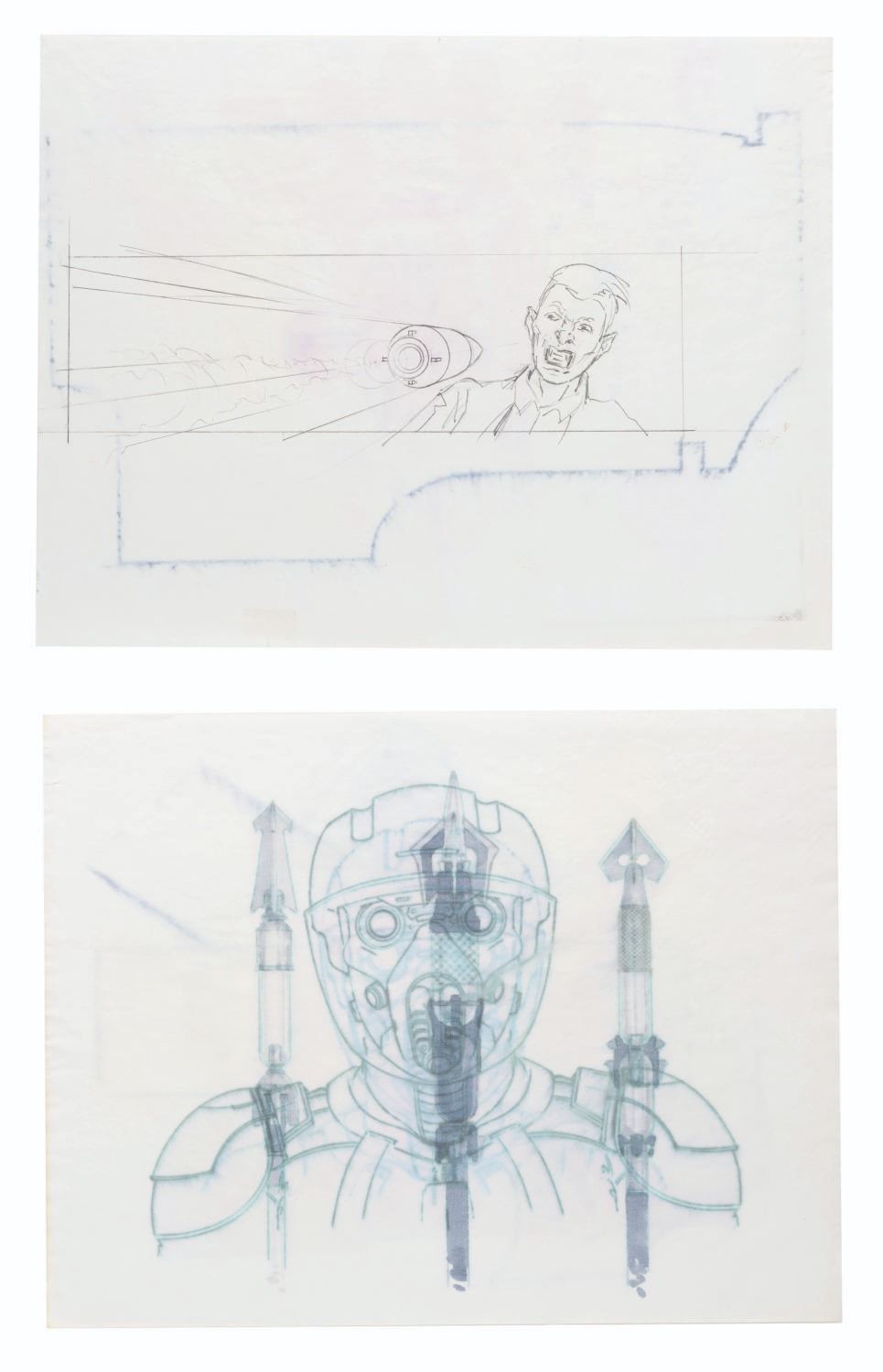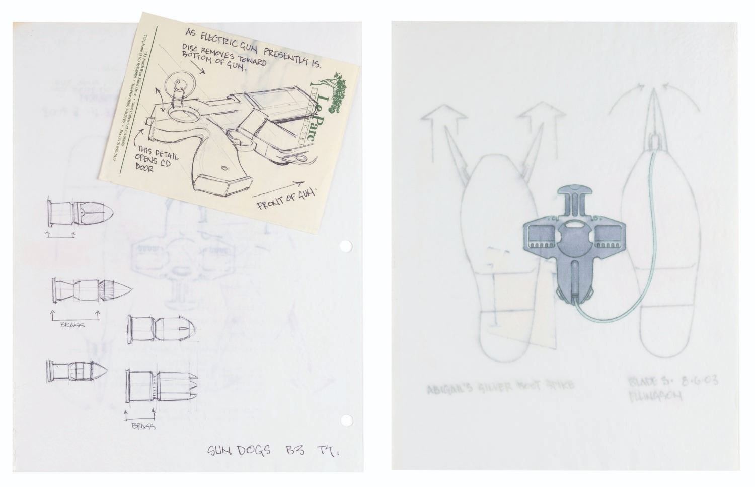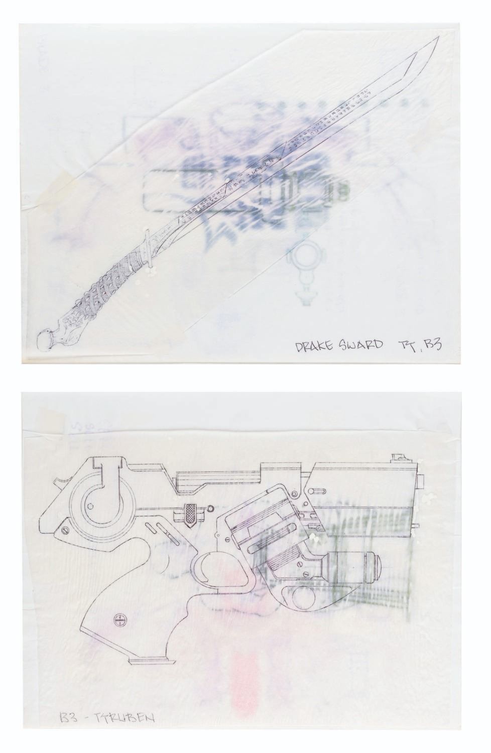 (New Line Cinema, 2004) A collection of hand-drawn designs by conceptual artist Ty Ruben for the film "Blade: Trinity." Accomplished in ink, marker, and graphite, the drawings measure 8.5” x 11” and 8.5” x 12”, and are in fair condition with some water damage.