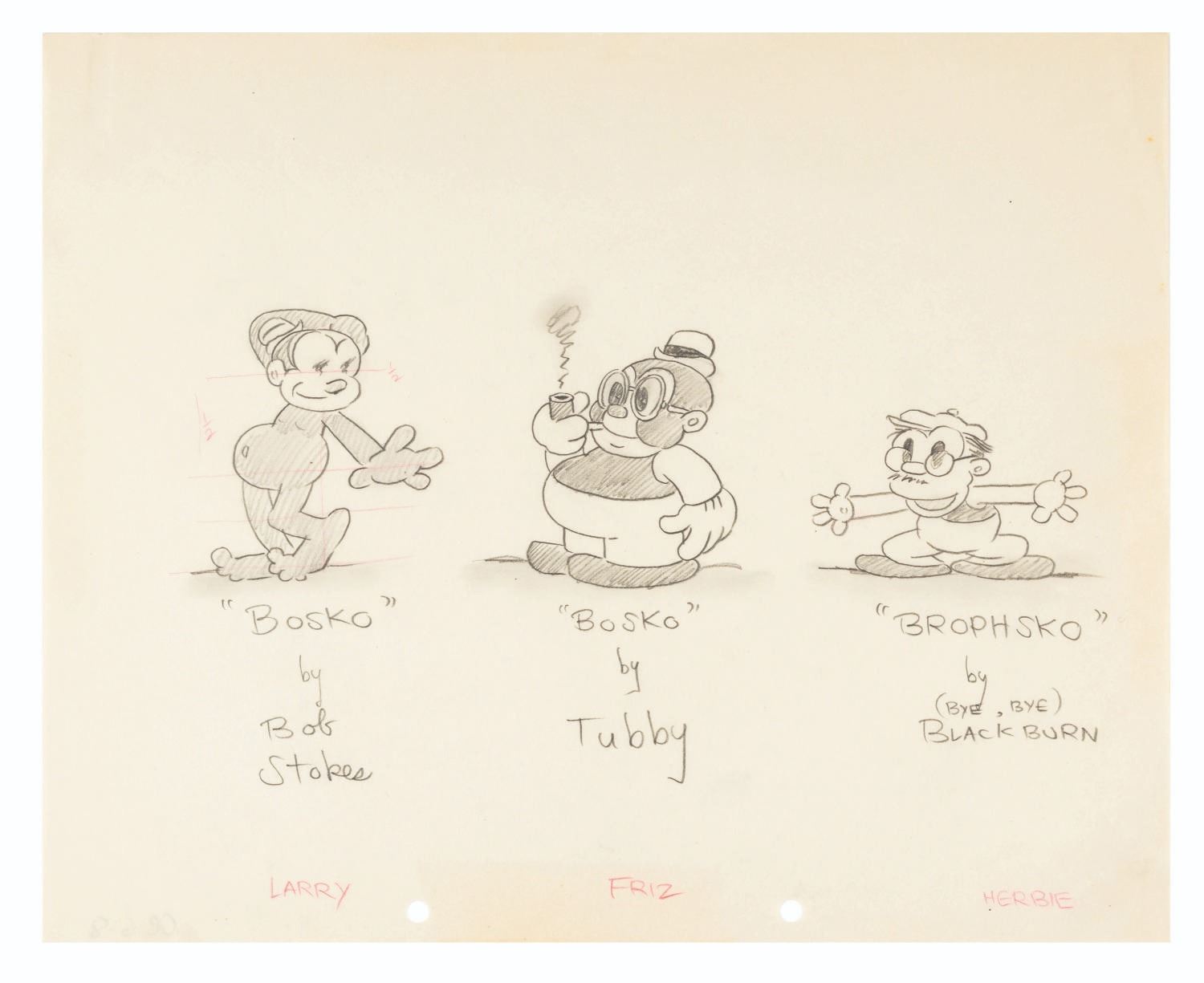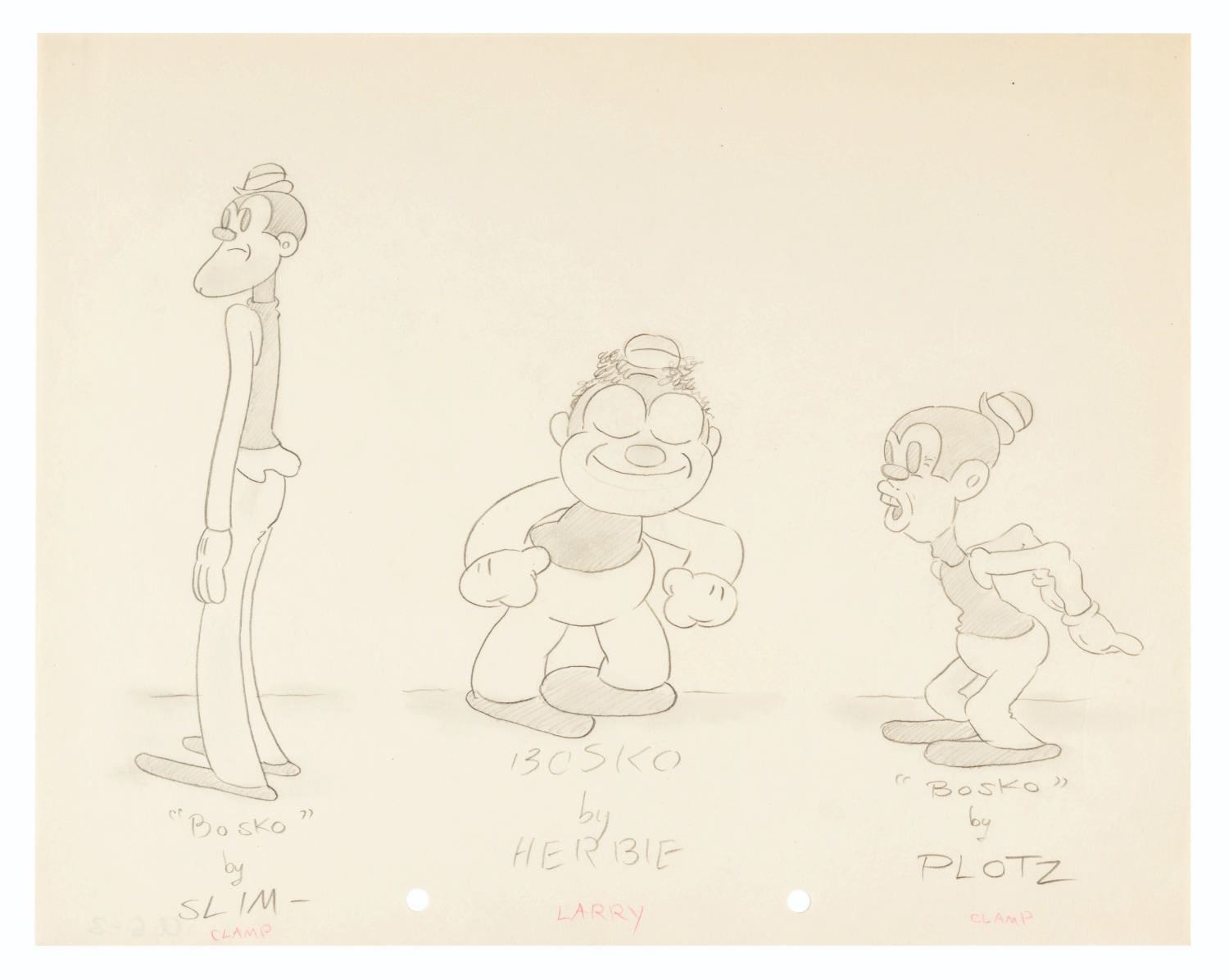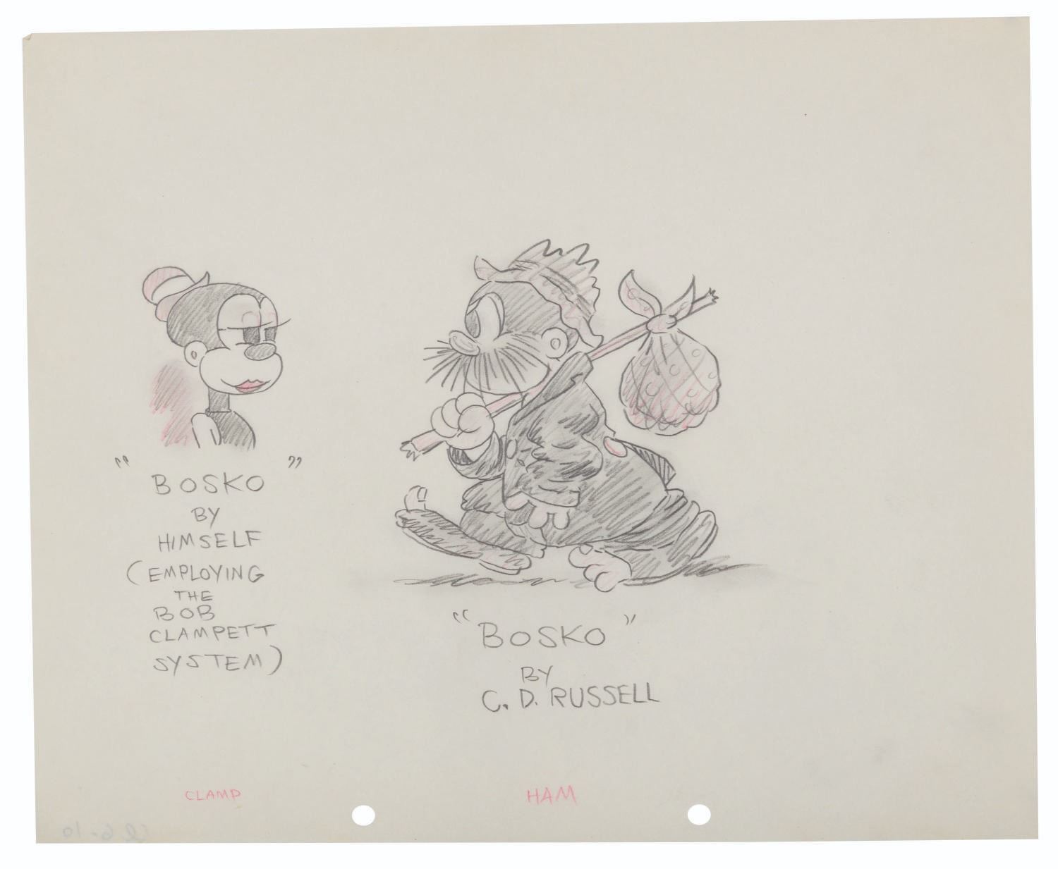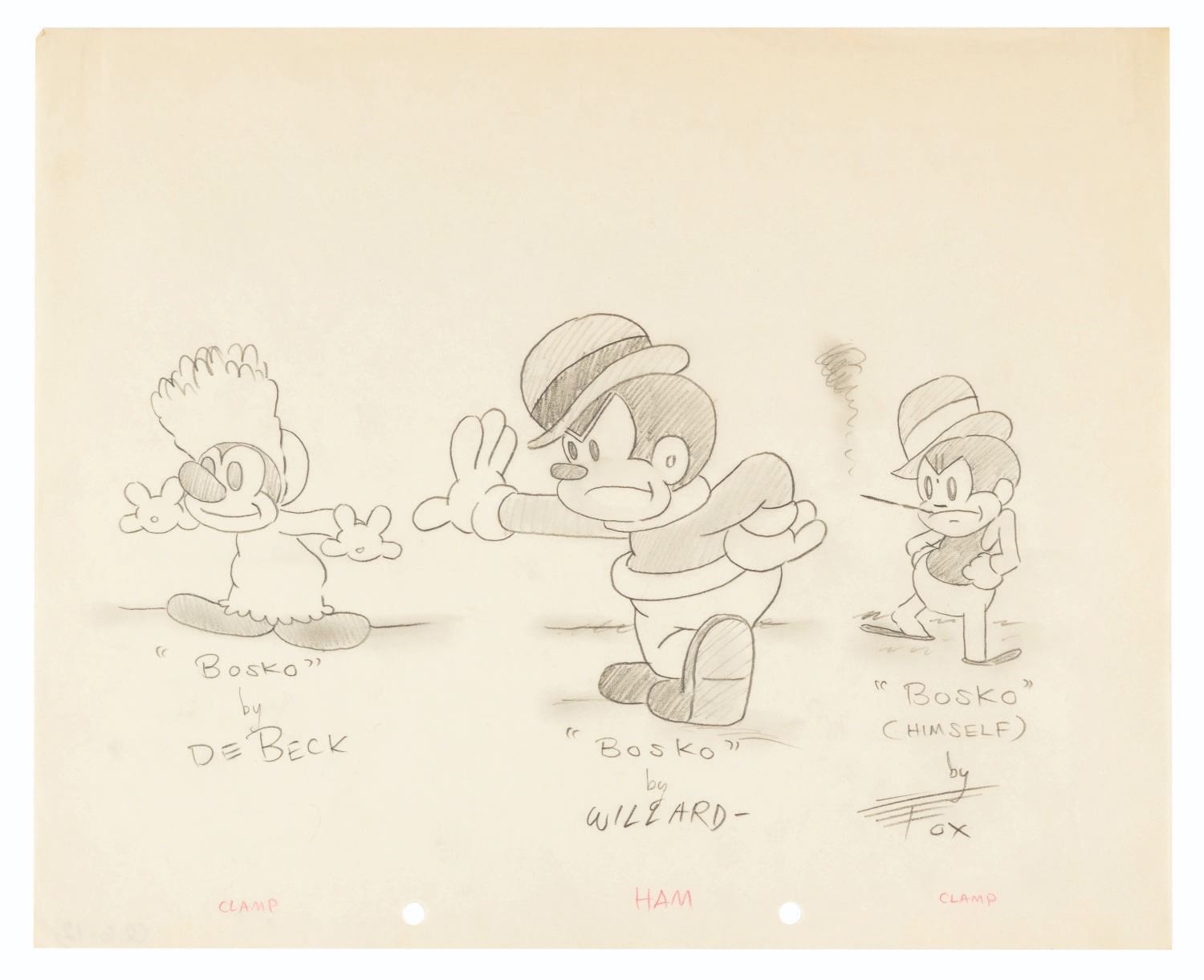 (Harman-Ising, 1930s) Twenty-nine original caricatures of Bosko, drawn by Harman-Ising animators in the styles of popular cartoonists of the day. The 13 pages include drawings of Bosko in the style of Popeye, Krazy Kat, Ripley’s Believe It or Not, and more. Each is labeled with the name of the animator who drew it, including Bob Clampett and Friz Freleng. Accomplished in graphite and colored pencil with character image sizes ranging from 3” x 2” to 6” x 7” on 9.75” x 12” animation paper, the drawings display in good condition with light edge wear, creasing, paperclip oxidization stains, and light discoloration from age.