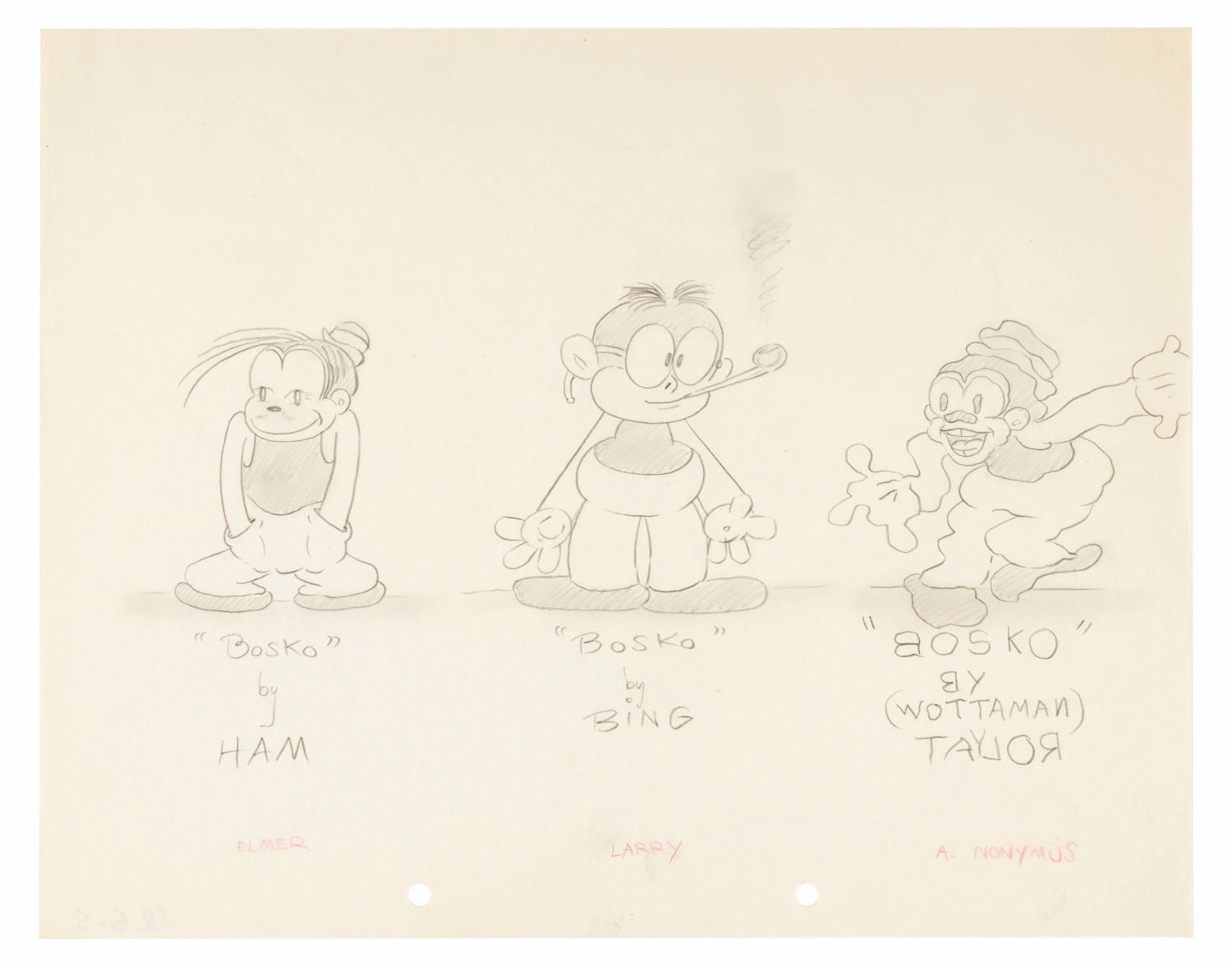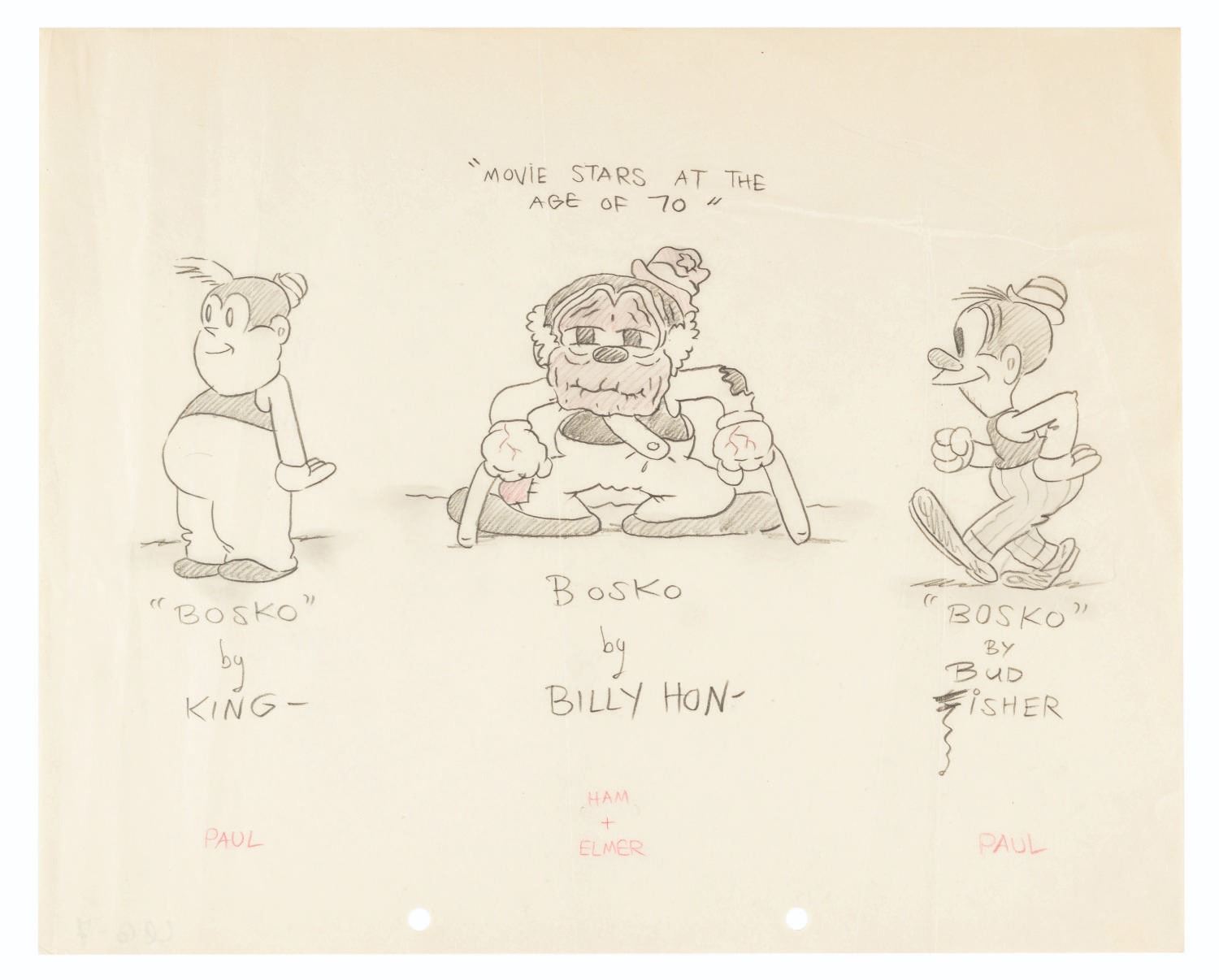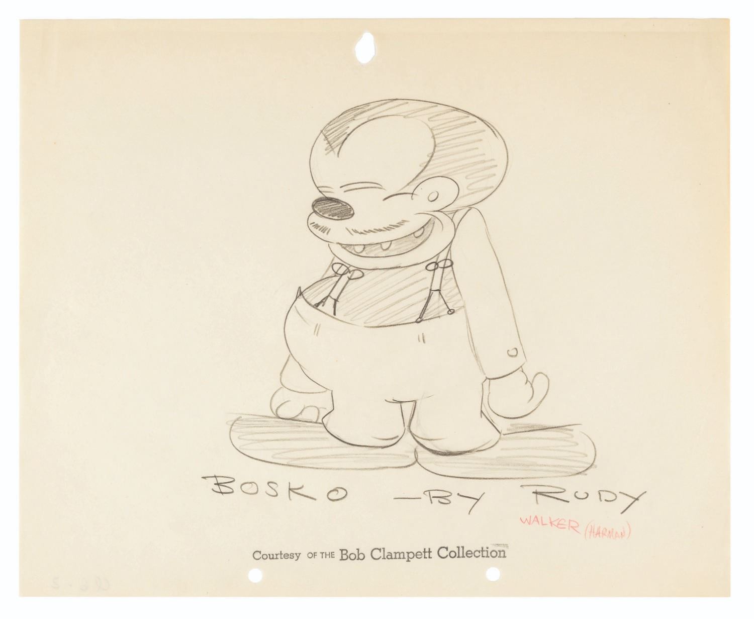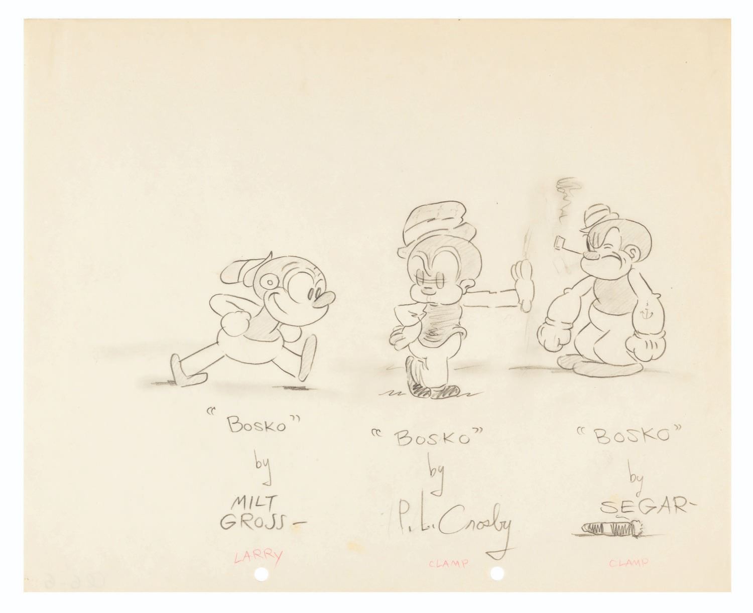 (Harman-Ising, 1930s) Twenty-nine original caricatures of Bosko, drawn by Harman-Ising animators in the styles of popular cartoonists of the day. The 13 pages include drawings of Bosko in the style of Popeye, Krazy Kat, Ripley’s Believe It or Not, and more. Each is labeled with the name of the animator who drew it, including Bob Clampett and Friz Freleng. Accomplished in graphite and colored pencil with character image sizes ranging from 3” x 2” to 6” x 7” on 9.75” x 12” animation paper, the drawings display in good condition with light edge wear, creasing, paperclip oxidization stains, and light discoloration from age.