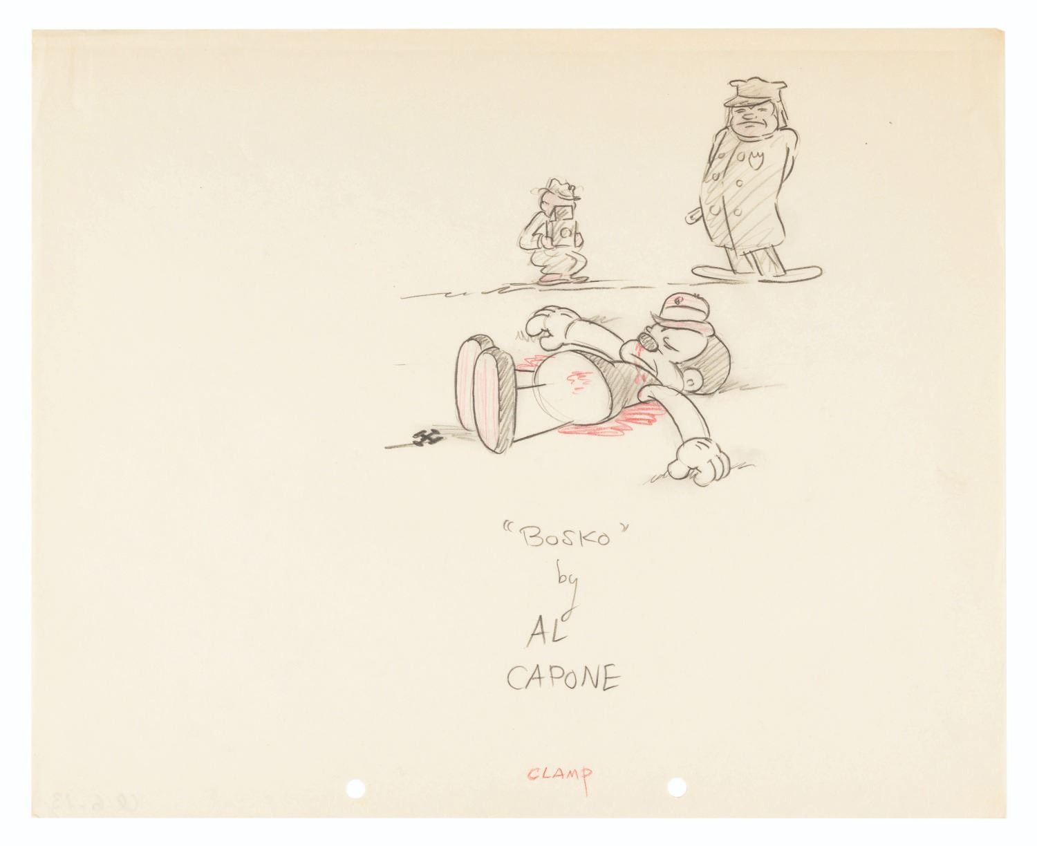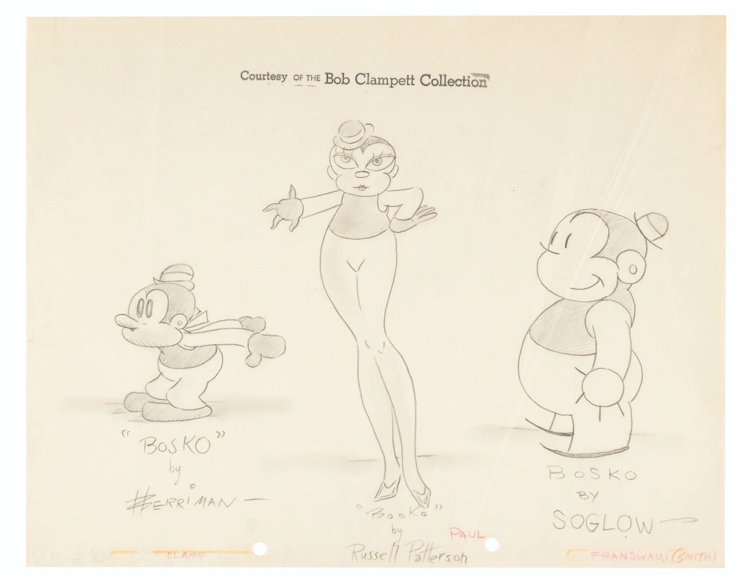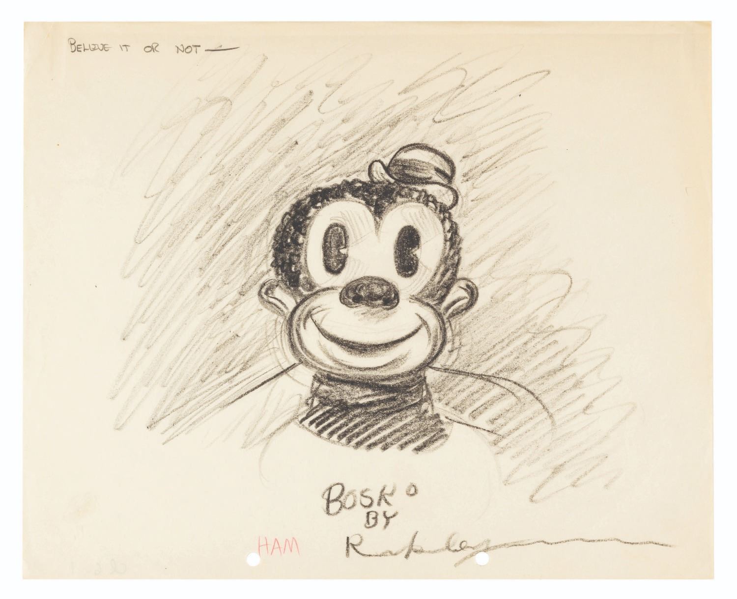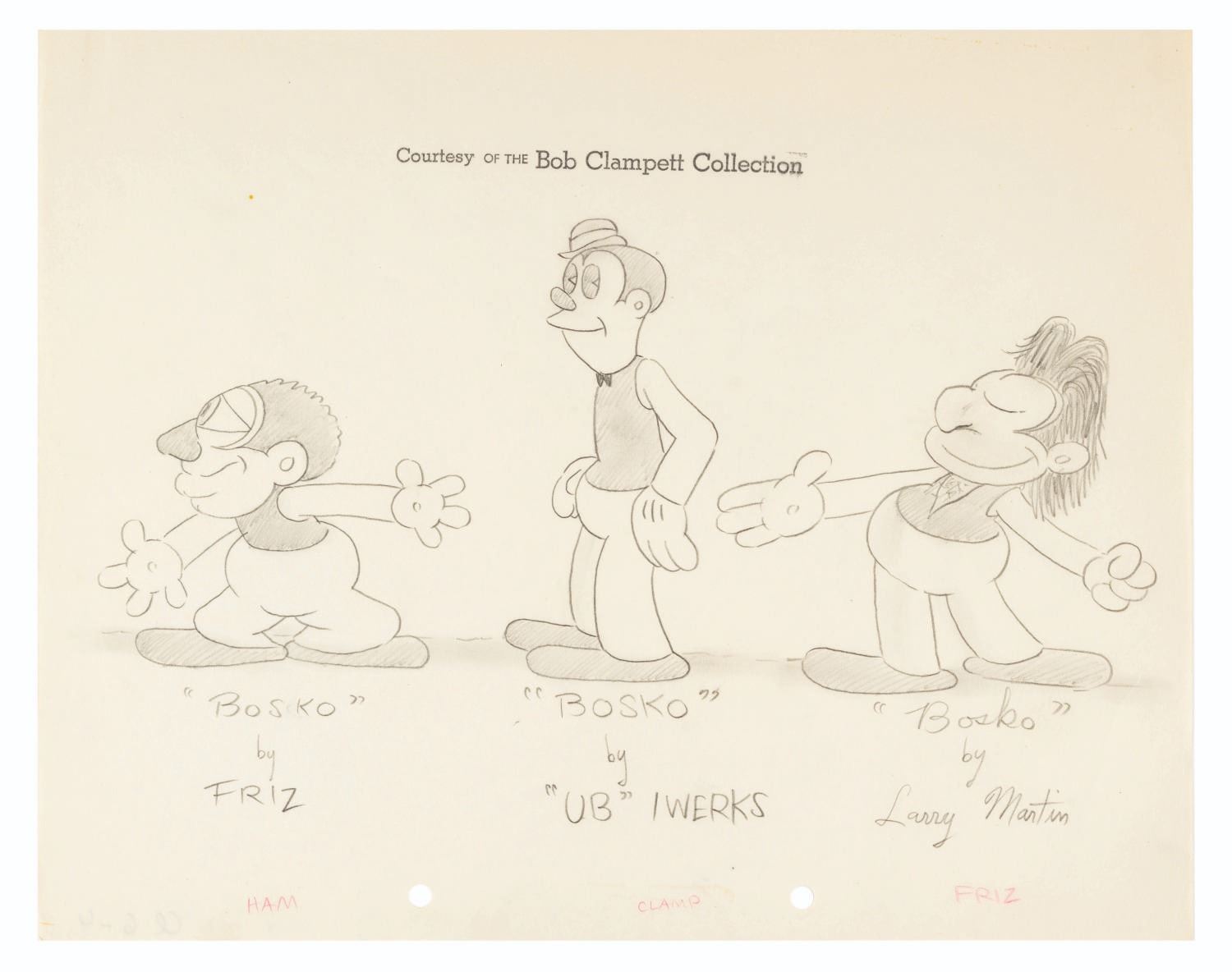 (Harman-Ising, 1930s) Twenty-nine original caricatures of Bosko, drawn by Harman-Ising animators in the styles of popular cartoonists of the day. The 13 pages include drawings of Bosko in the style of Popeye, Krazy Kat, Ripley’s Believe It or Not, and more. Each is labeled with the name of the animator who drew it, including Bob Clampett and Friz Freleng. Accomplished in graphite and colored pencil with character image sizes ranging from 3” x 2” to 6” x 7” on 9.75” x 12” animation paper, the drawings display in good condition with light edge wear, creasing, paperclip oxidization stains, and light discoloration from age.