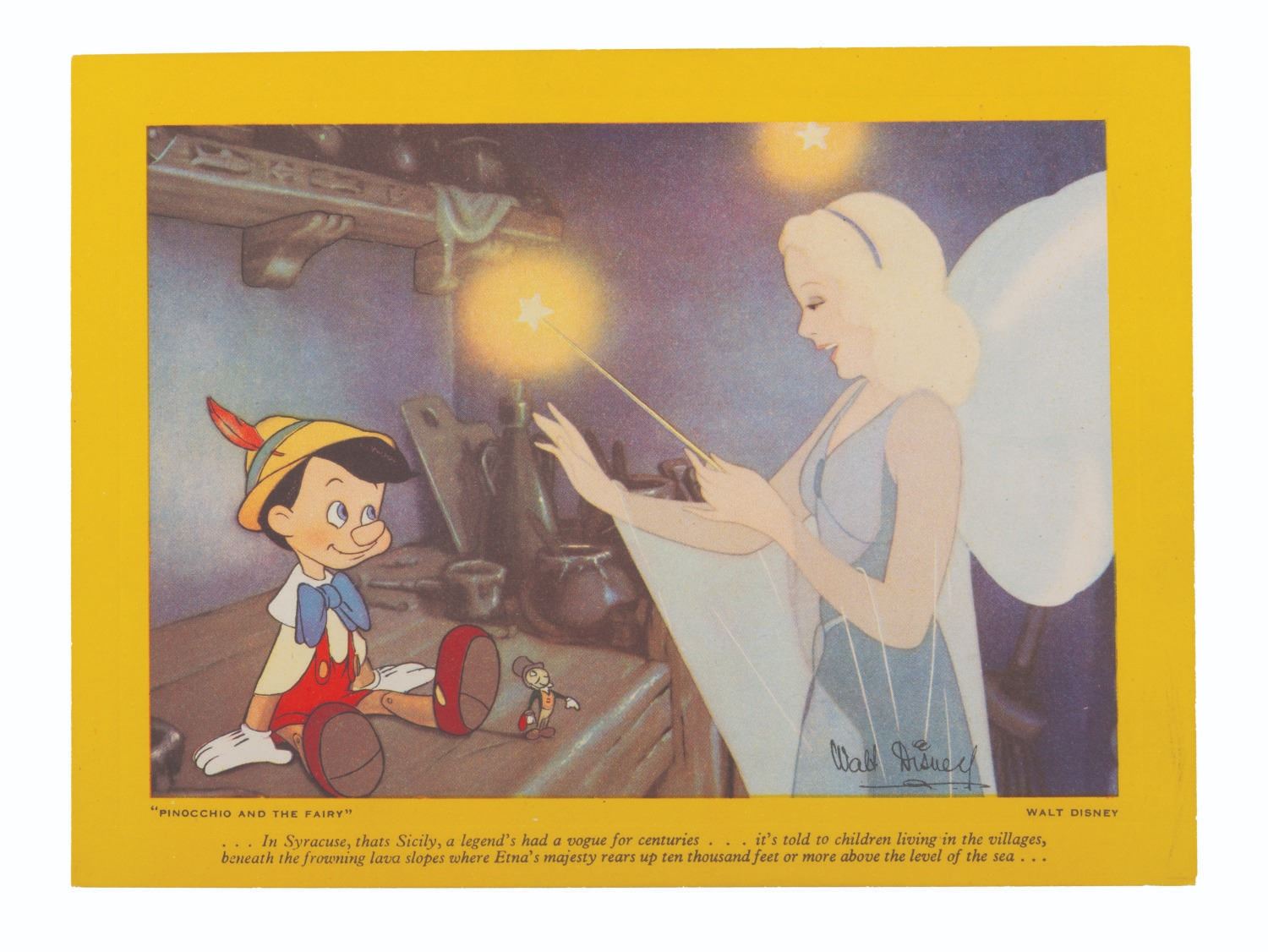 (Brownlee, 1942) A collection of 14 prints of scenes from early Disney animated films, including"Snow White and the Seven Dwarfs,""Pinocchio," and"Bambi." These prints were made in England during World War II and sold to support the war effort. Measuring 5.5" x 7.5" to 5.5" x 8.75", the prints and original envelopes are in good condition with light soiling and discoloration from age.