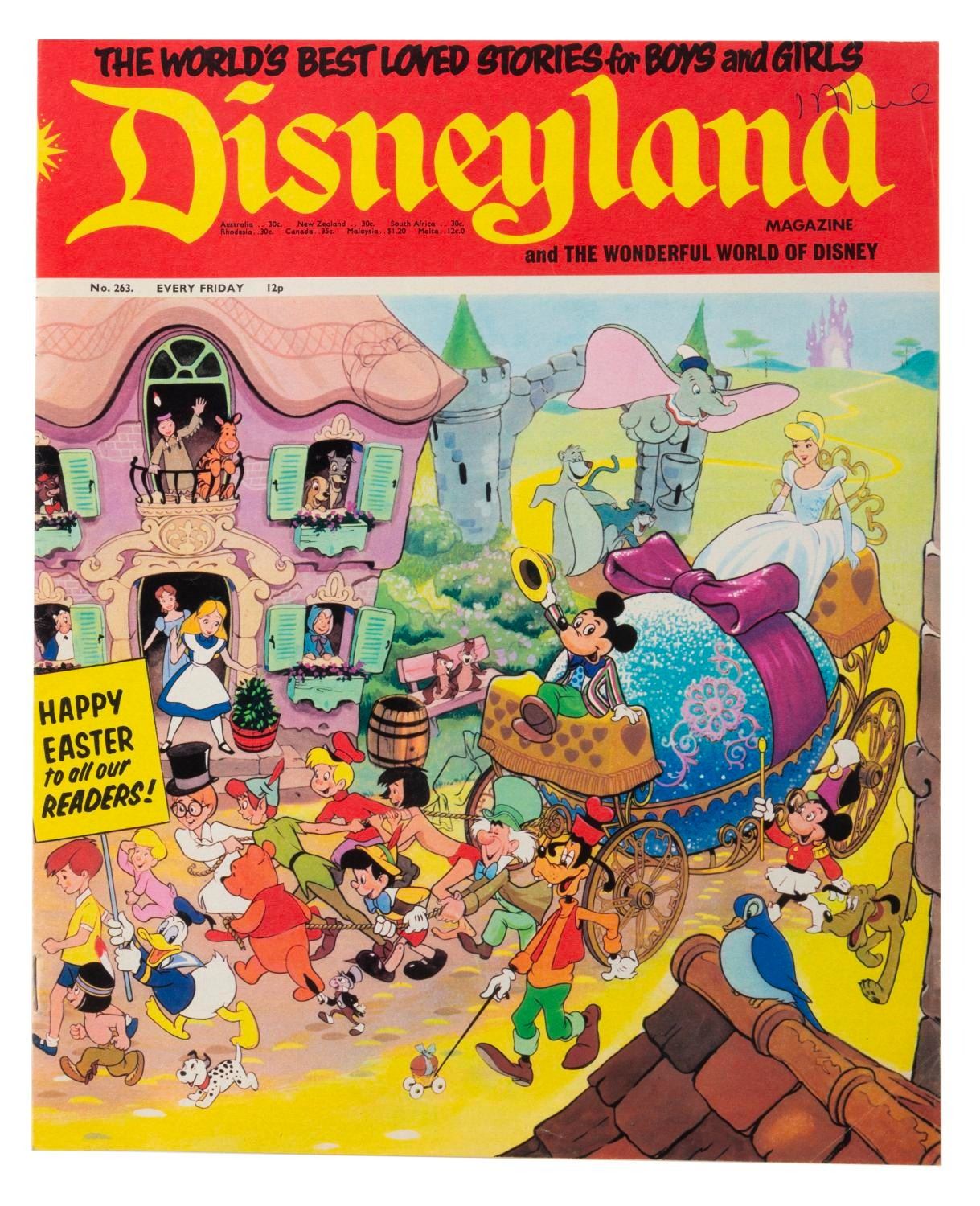 (Disneyland, 1976) A set of Disneyland Magazines published in London from 1976. Included are issues 255 thru 292, with 278 & 288 missing. The weekly Disney magazine features colorfully illustrated stories of new adventures of the Studios’ animated characters. Each measuring 10” x 12.5”, the magazines are in very good to fair condition, some with creases and scuffs from use, and a name written on the cover of each.