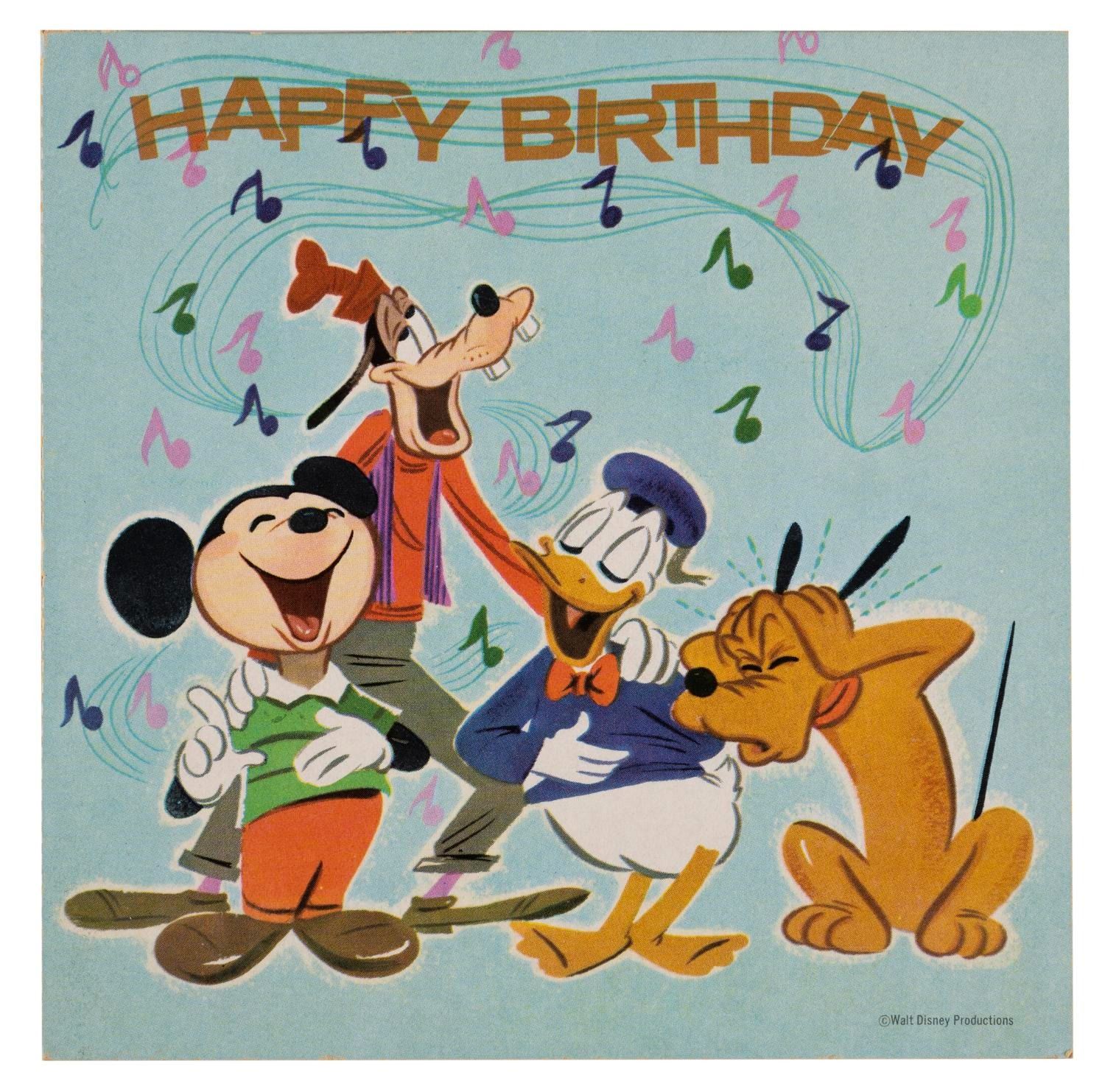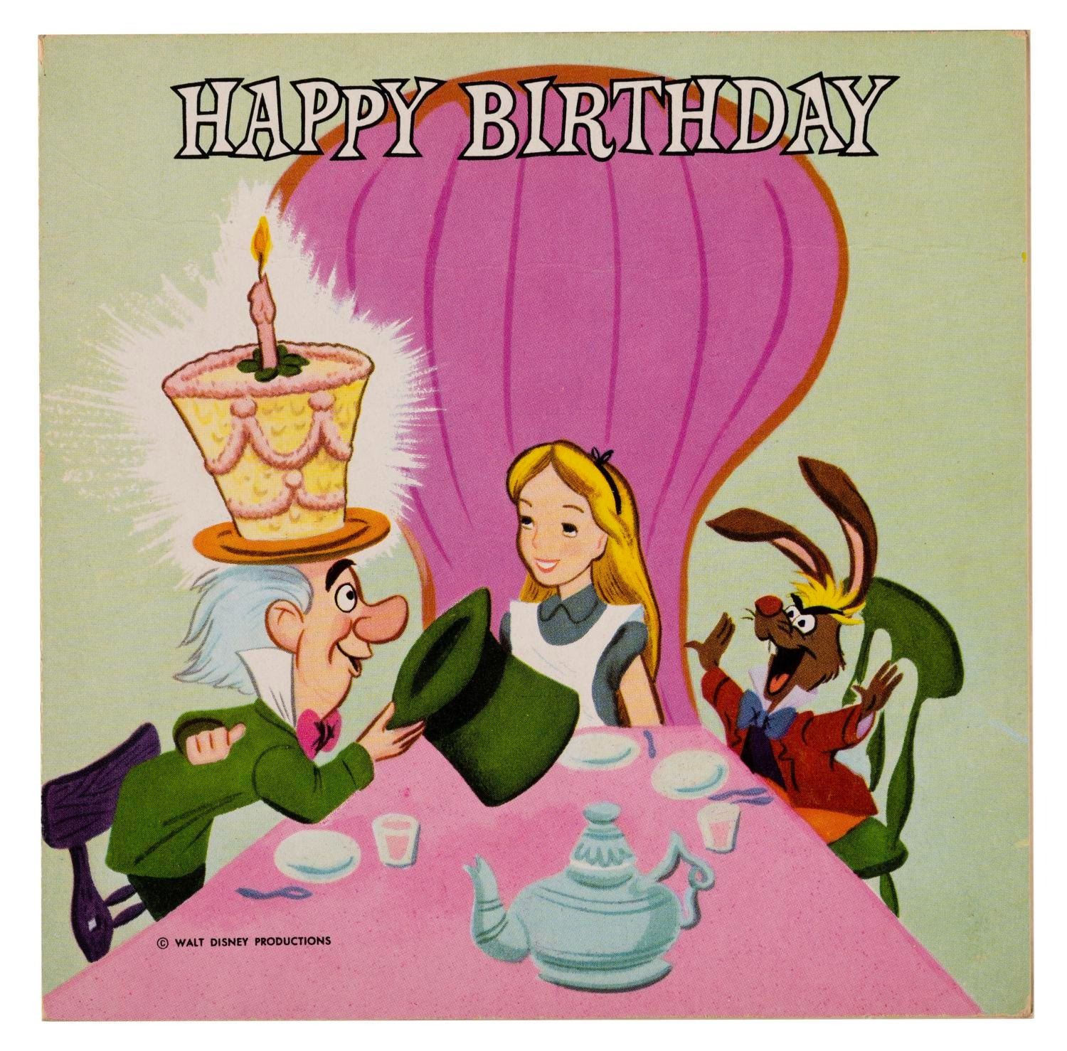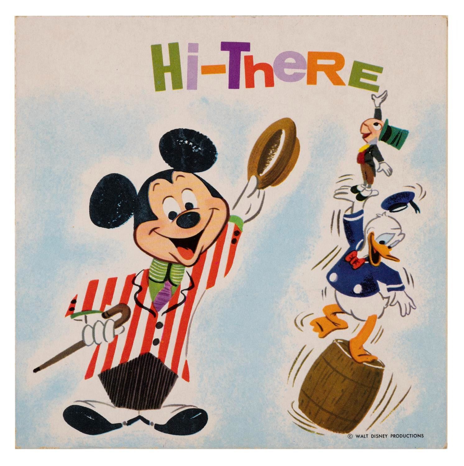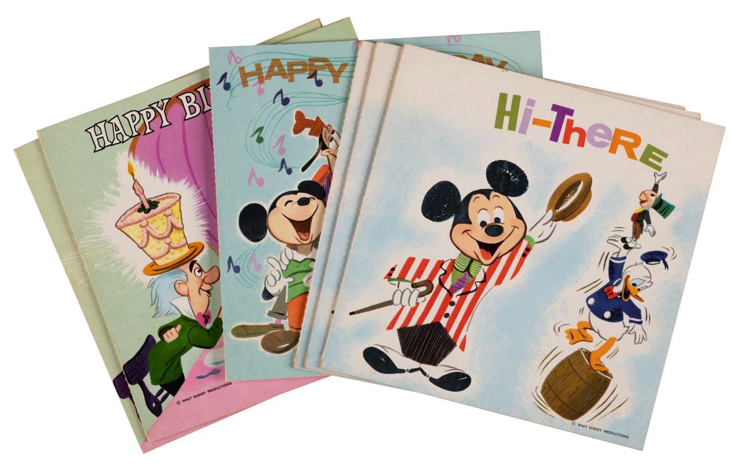 (Disney, 1960s) A collection of six birthday and greeting record cards featuring recordings of authentic Disney voices. Included are one copy of the Mickey and Friends birthday card, two copies of the Alice in Wonderland birthday card, and three copies of the Mickey and Jiminy Cricket "Hi There" card. Each measuring 6" x 6", the cards with mailing envelopes are in very good condition, with expected light wear from age.