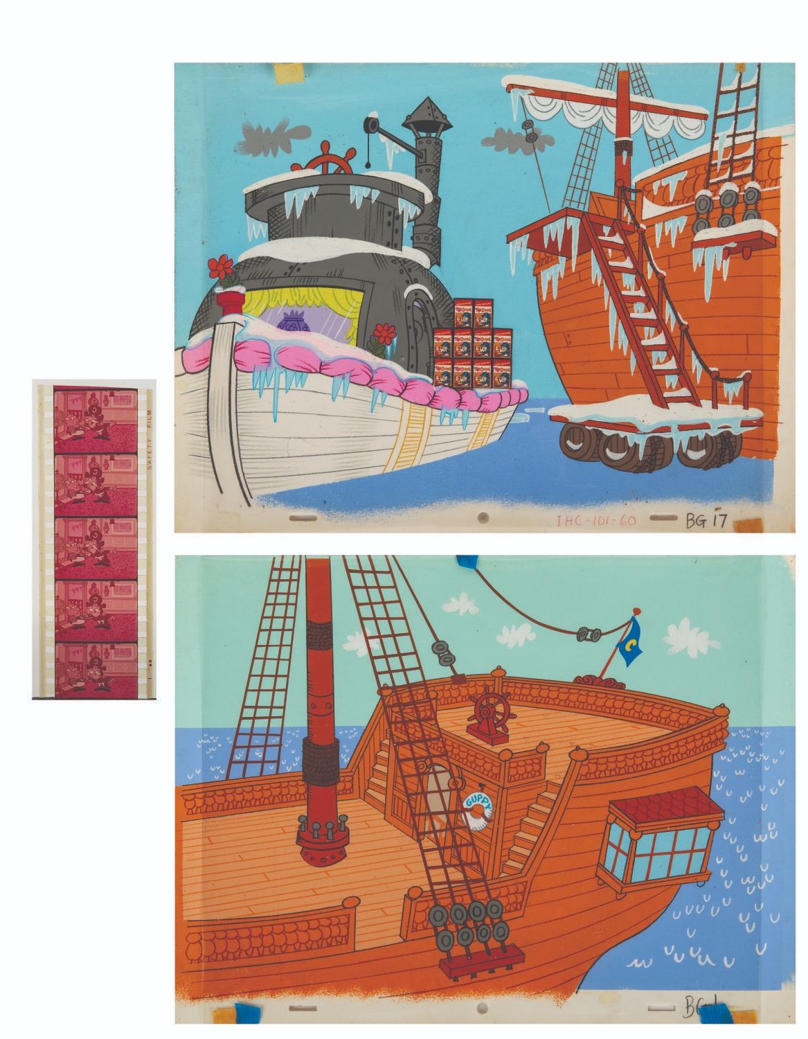 (Jay Ward, 1960s) Two original hand-painted production backgrounds and five frames of 35mm film used in the production of early Cap'n Crunch commercials. Accomplished in gouache with pencil accents and a photo applique of product boxes, the backgrounds measuring 10.5" x 14" display in fine condition. Measuring 3.75"x1.25", the film segment displays in good condition with typical magenta shift from age. Jay Ward was a prominent figure in children's animation during the 1960s, known for his remarkable roster of cartoon characters, including Rocky and Bullwinkle, Dudley Do-Right, Peabody and Sherman, and George of the Jungle. His influence extended beyond television shows, as his studio also designed iconic cereal mascots such as Cap’n Crunch, Quisp, and Quake, along with a series of animated commercials that helped solidify the connection between breakfast cereals and Saturday morning cartoons. Perhaps Jay Ward’s most significant contribution to the medium was the creation of "Crusader Rabbit," which holds the distinction of being the first animated series made exclusively for television.