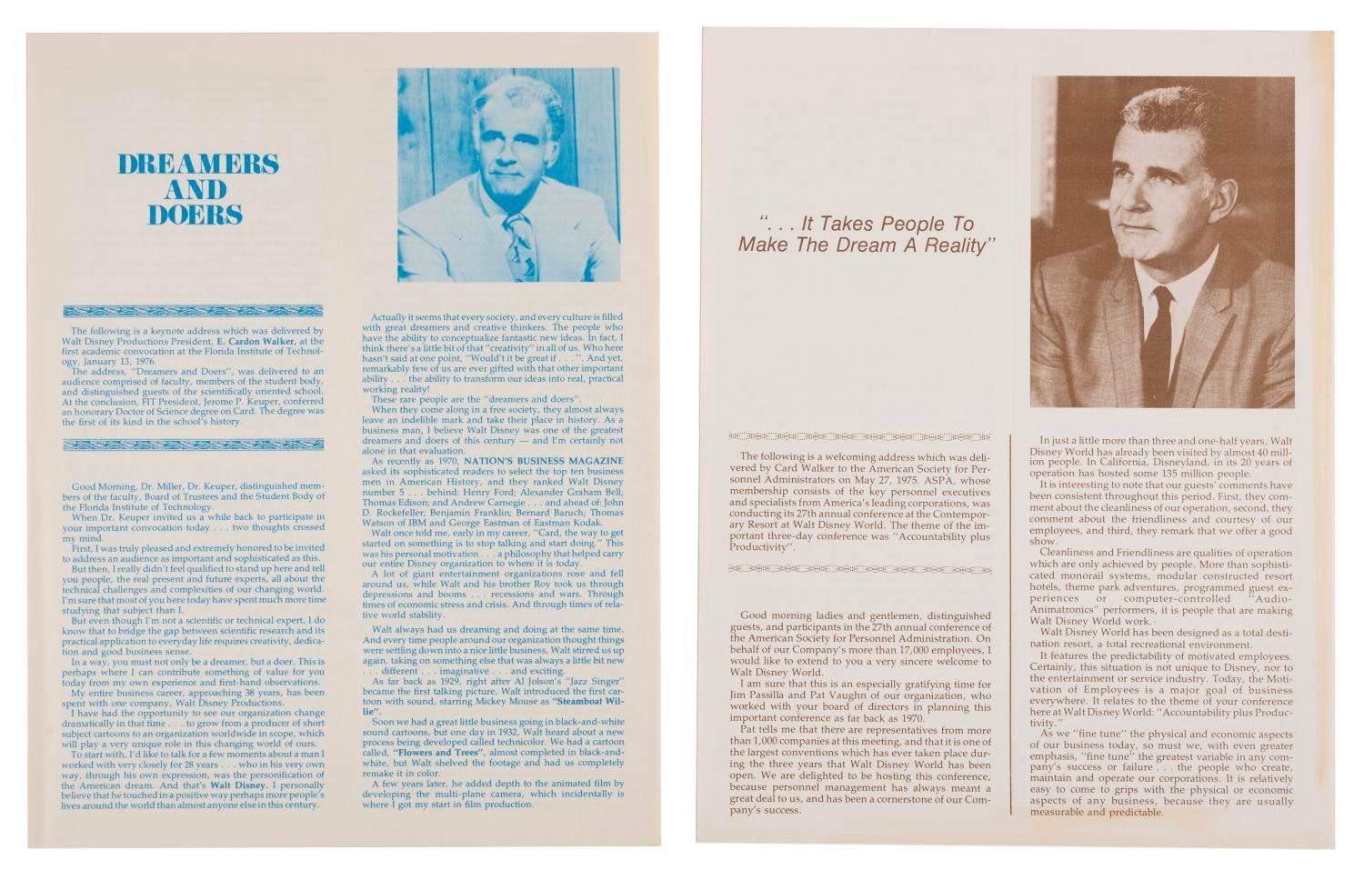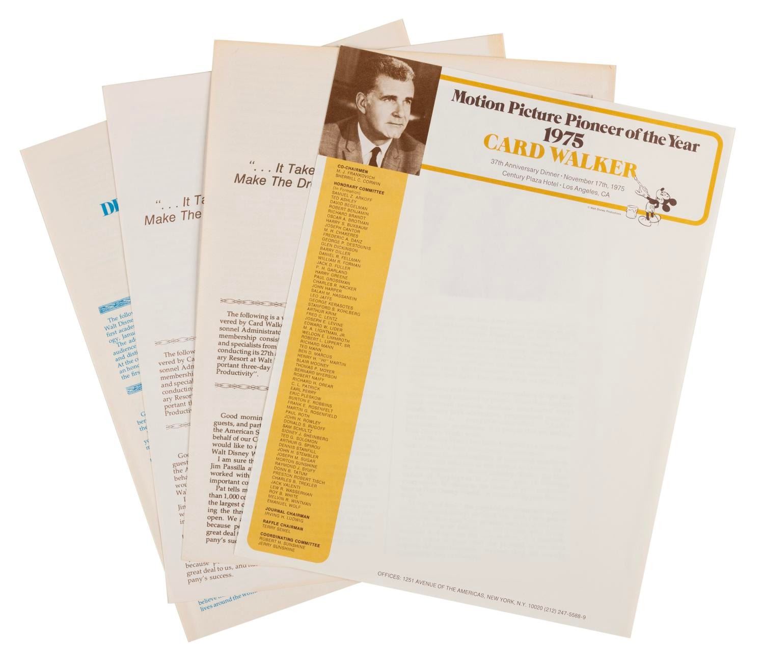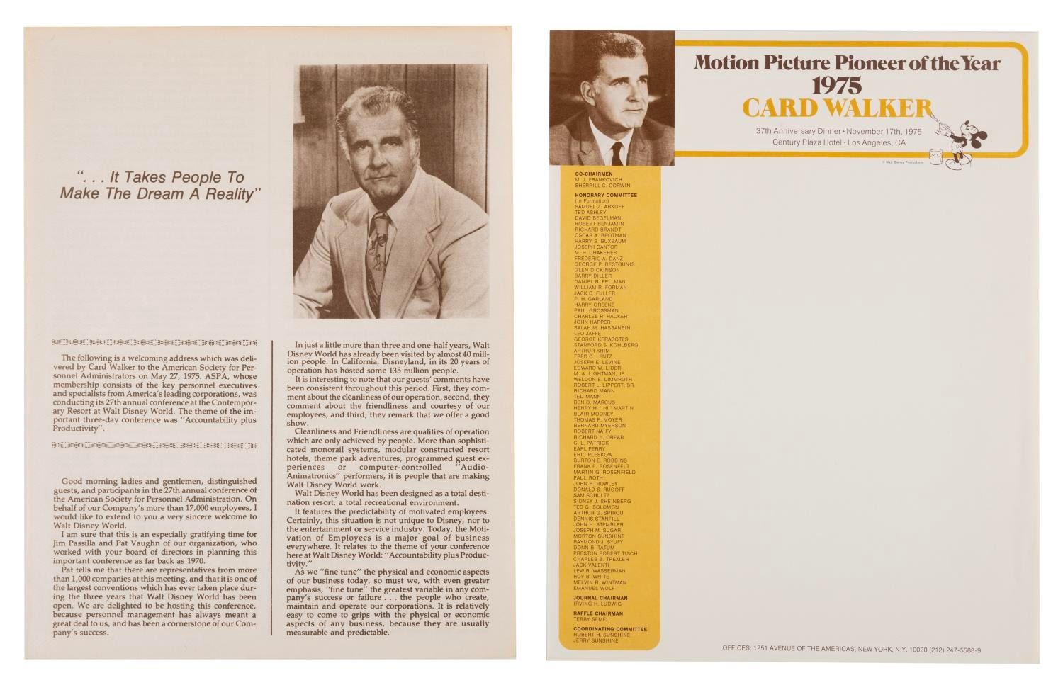 (Walt Disney World, 1975-1976) A collection of three Card Walker address transcripts from Cast Member publications, and a sheet of Card Walker stationery for "Motion Picture Pioneer of the Year 1975." The transcripts include two copies of Walkers address to the American Society for Personnel Administrators on May 27, 1975, and his convocation address to the Florida Institute of Technology on January 13, 1976. Measuring 8.5" x 11" each, the items are in very good condition with page discoloration from age.