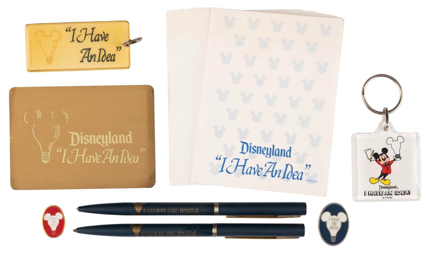 (Disneyland, 1980s-90s) a collection of "I Have an Idea" memorabilia. In 1985 Disneyland created this program to encourage communication between management and employees. Included are a magnetic address book, Post-it notes, two pens, two pins, and two keychains. The items are in good to very good condition, with typical light wear from age and handling, and the Post-It notes have lost their stickiness.
