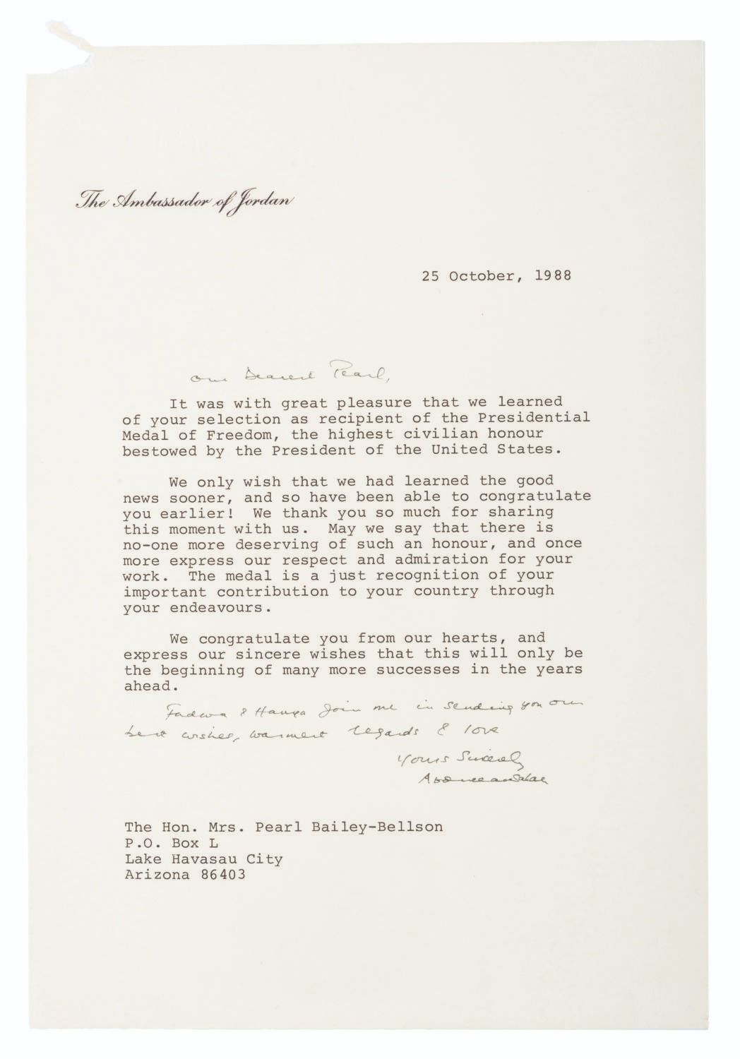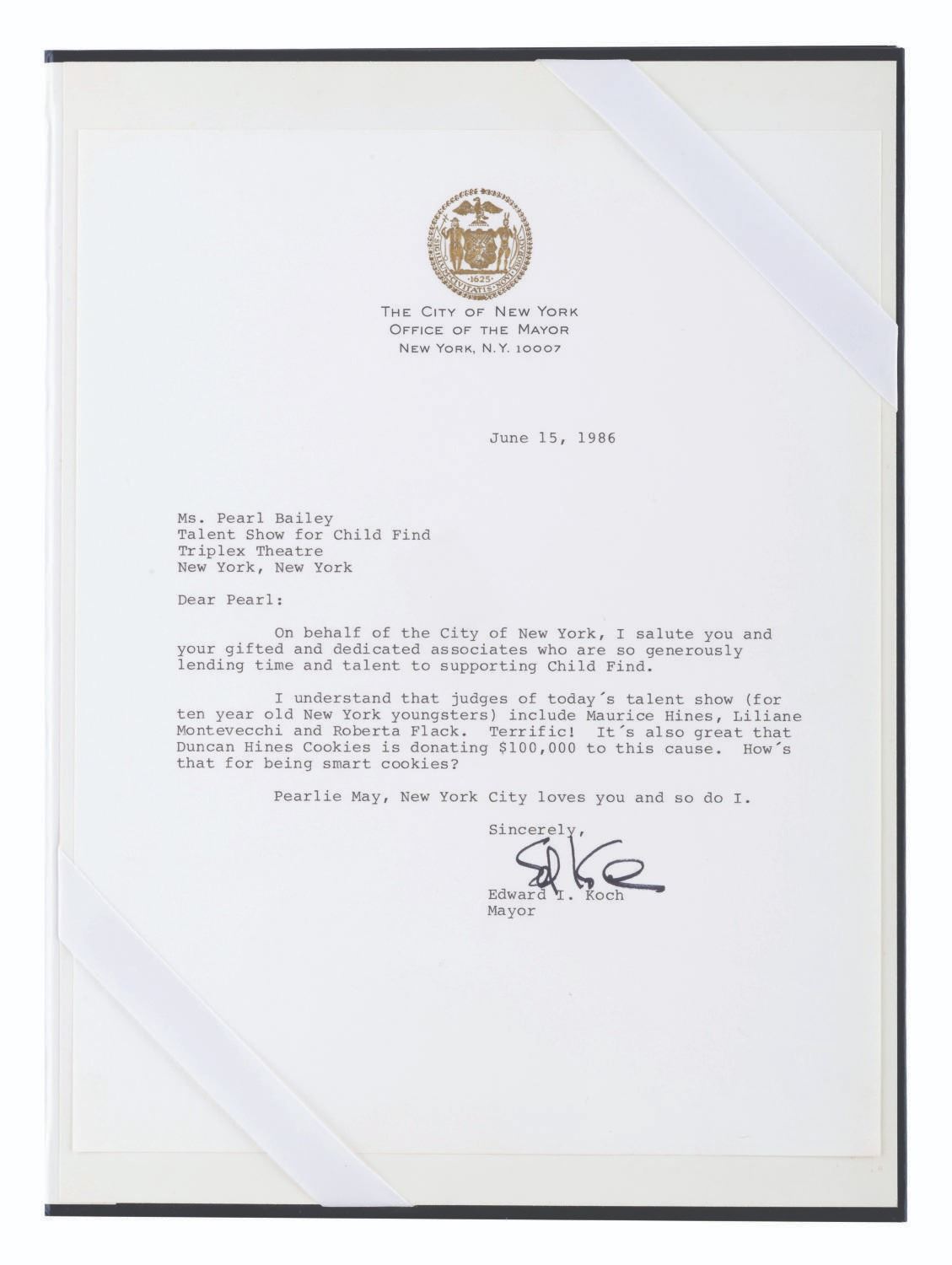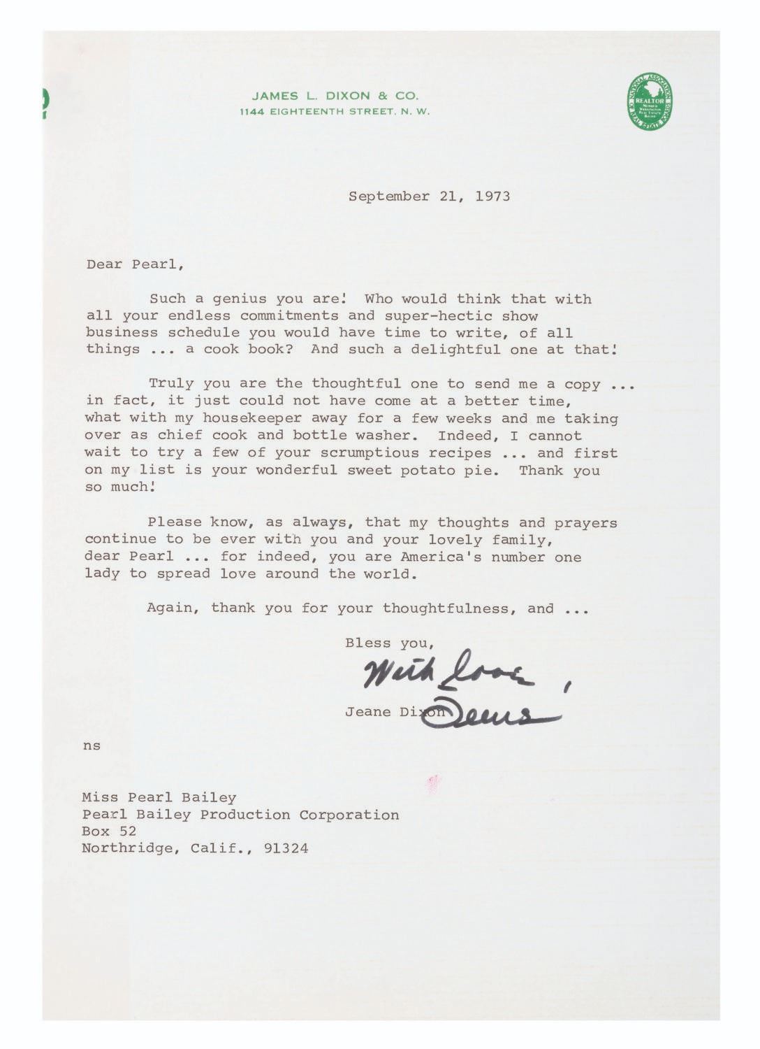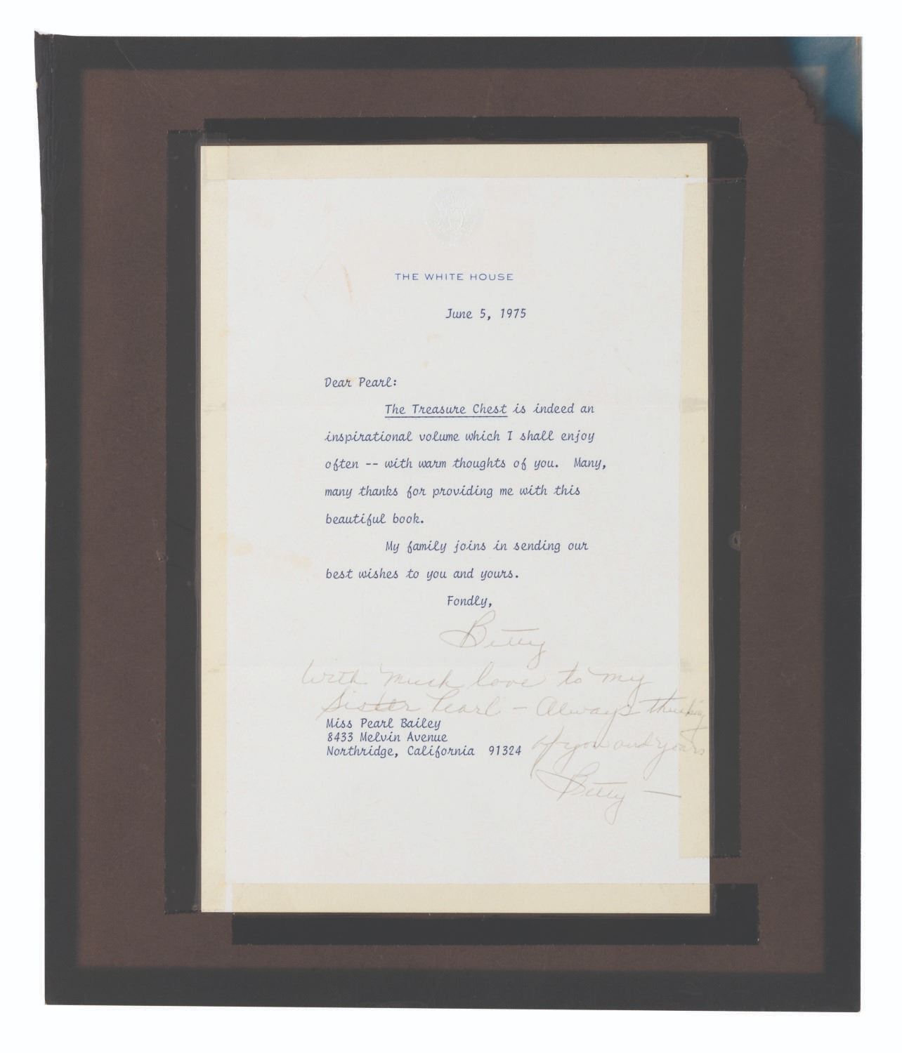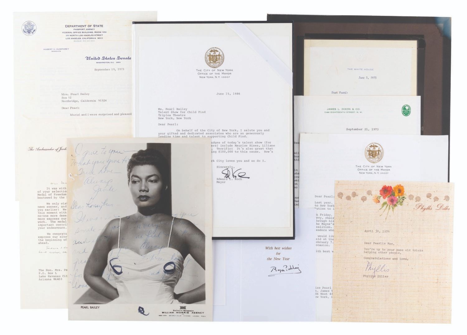 (Bailey, 1969-88) A collection of ten signed correspondences sent to singer and actress Pearl Bailey from celebrities and political figures. Included are a note from comedienne Phyllis Diller, a letter from psychic Jeane Dixon, a 1972 letter from passport agent Gene Burke, a letter from Senator and Vice President Hubert Humphrey, a letter on White House stationery from First Lady Betty White, a card from Reza Shah II (son of the last Shah of Iran), a letter from 1969 New York City Mayor John Lindsay, a letter in an official portfolio from 1986 New York City Mayor Ed Koch, and a letter from the 1988 Ambassador from Jordan. Also included is a publicity photo of Bailey with a personal message written faintly across most of the image. Measuring up to the 8.75" x 12" mayoral portfolio, the collection is overall in very good condition with some light handling wear. The Jordan Ambassador letter has a small tear at the top left corner, slight soiling to the Betty White letter, and tape on the corners of the Reza Shah II card and John Lindsay letter.