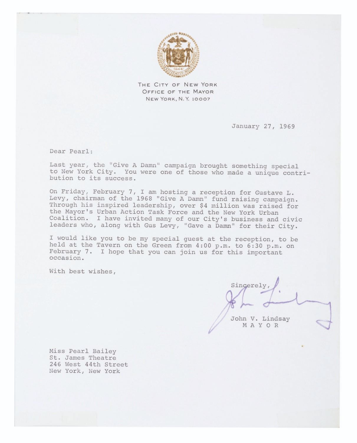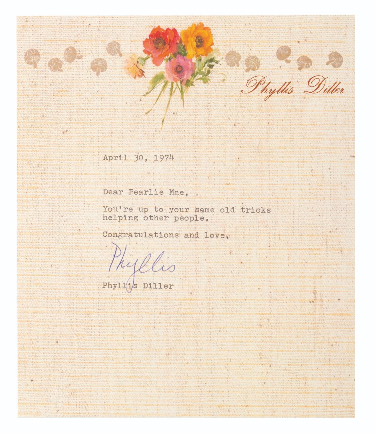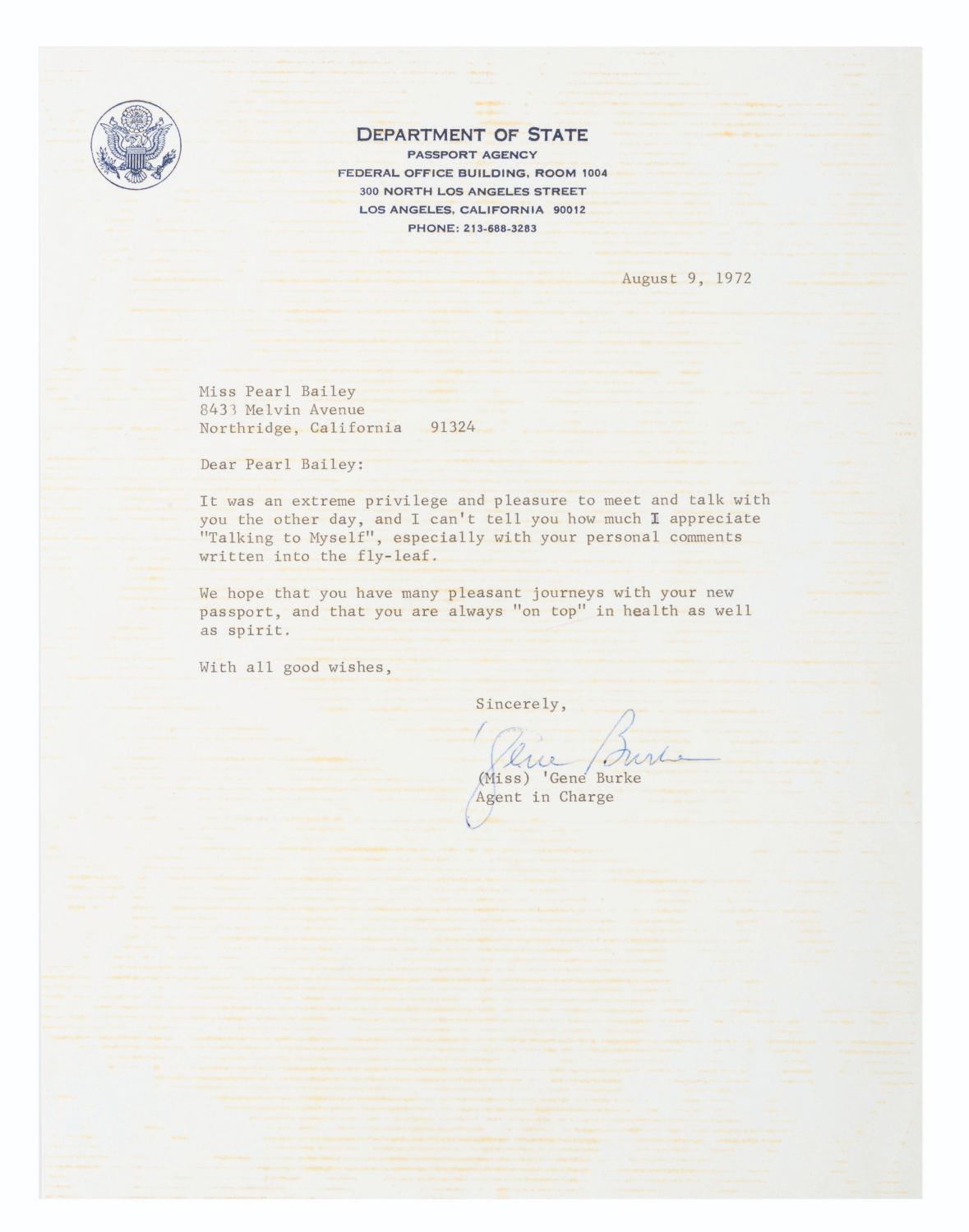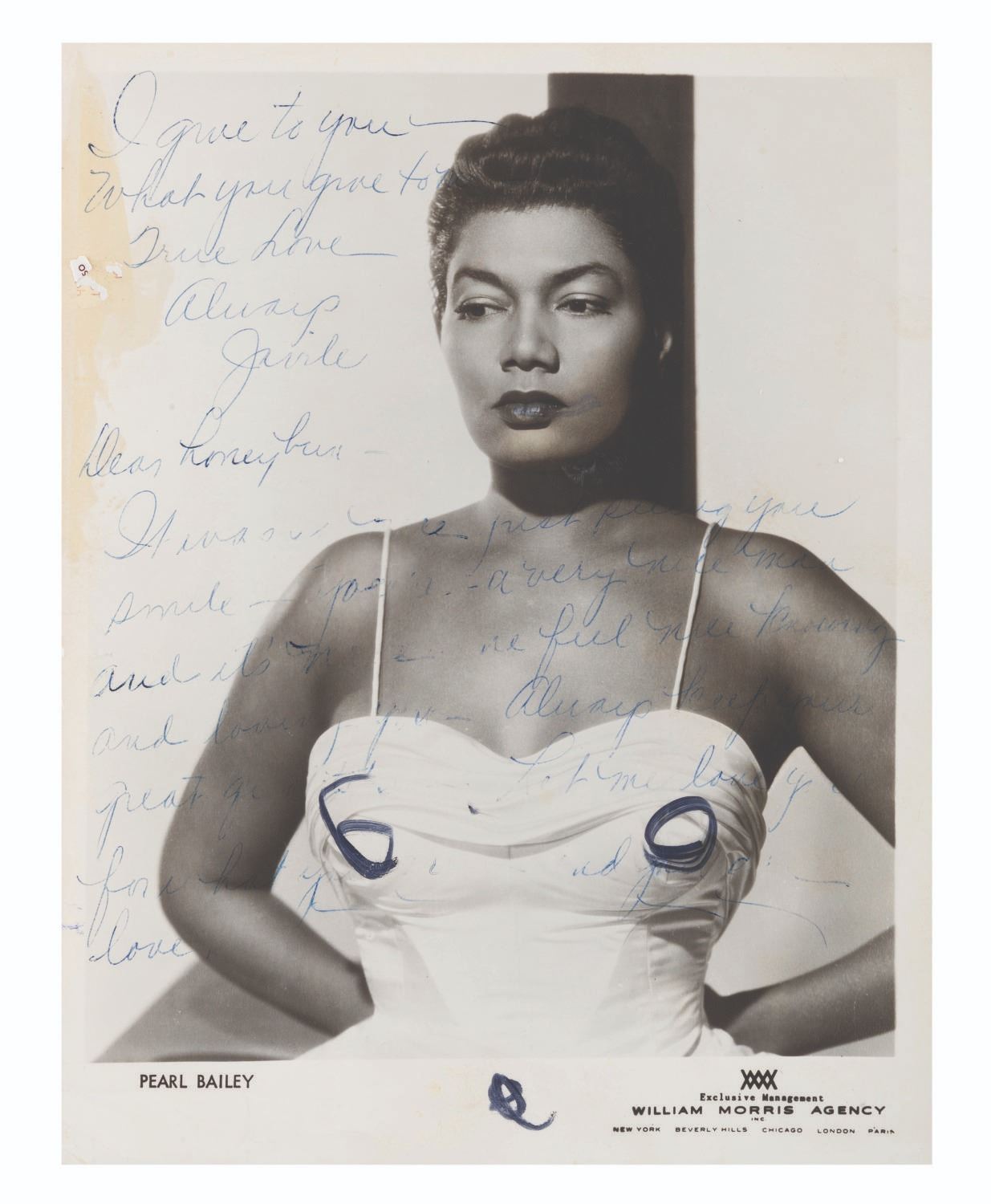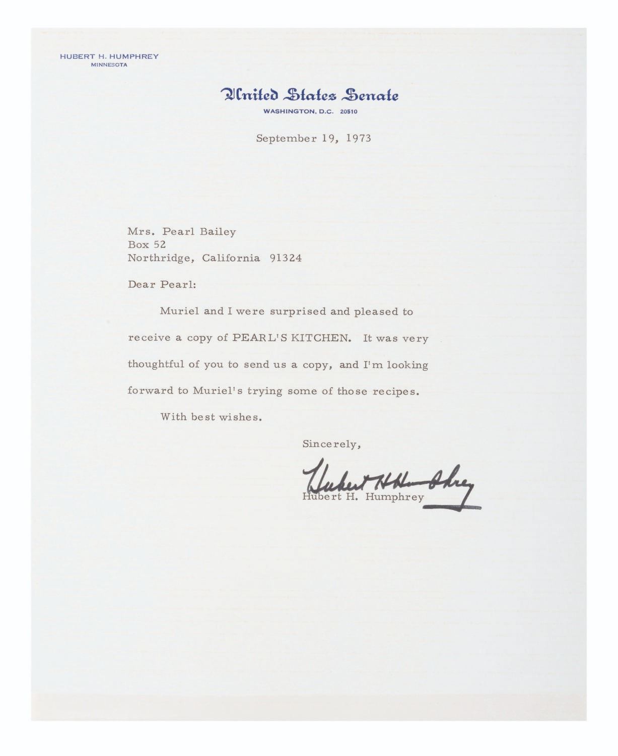 (Bailey, 1969-88) A collection of ten signed correspondences sent to singer and actress Pearl Bailey from celebrities and political figures. Included are a note from comedienne Phyllis Diller, a letter from psychic Jeane Dixon, a 1972 letter from passport agent Gene Burke, a letter from Senator and Vice President Hubert Humphrey, a letter on White House stationery from First Lady Betty White, a card from Reza Shah II (son of the last Shah of Iran), a letter from 1969 New York City Mayor John Lindsay, a letter in an official portfolio from 1986 New York City Mayor Ed Koch, and a letter from the 1988 Ambassador from Jordan. Also included is a publicity photo of Bailey with a personal message written faintly across most of the image. Measuring up to the 8.75" x 12" mayoral portfolio, the collection is overall in very good condition with some light handling wear. The Jordan Ambassador letter has a small tear at the top left corner, slight soiling to the Betty White letter, and tape on the corners of the Reza Shah II card and John Lindsay letter.