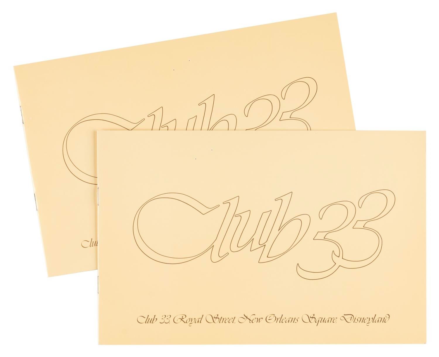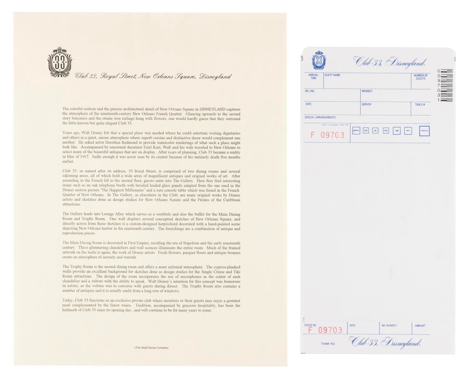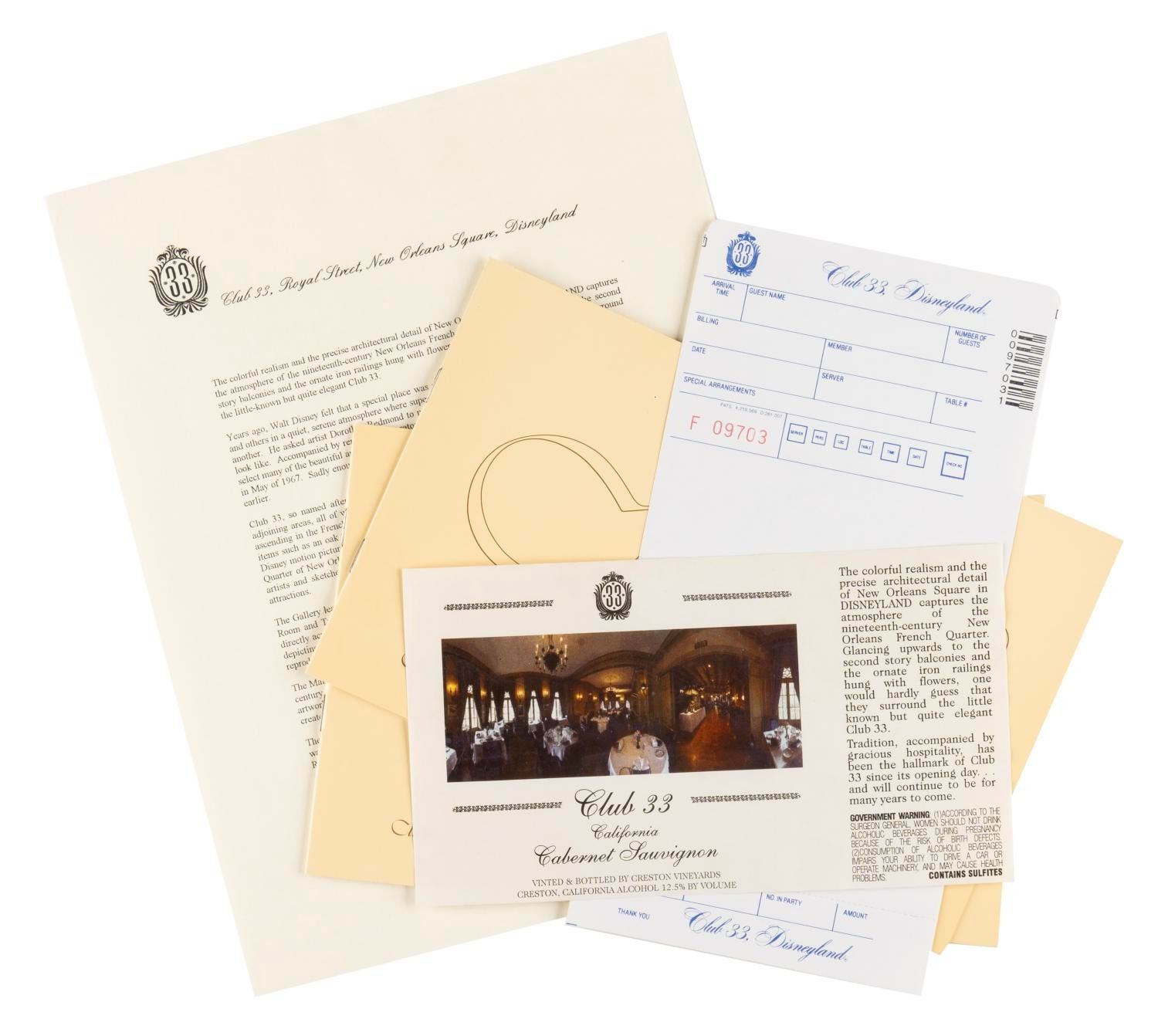 (Disneyland, 1990s-2000s) A collection of five Club 33 items including a blank table check, information sheet, wine label, and two private event menus. Measuring up to 8.5” x 11”, the items are in very good condition with some light handling wear.