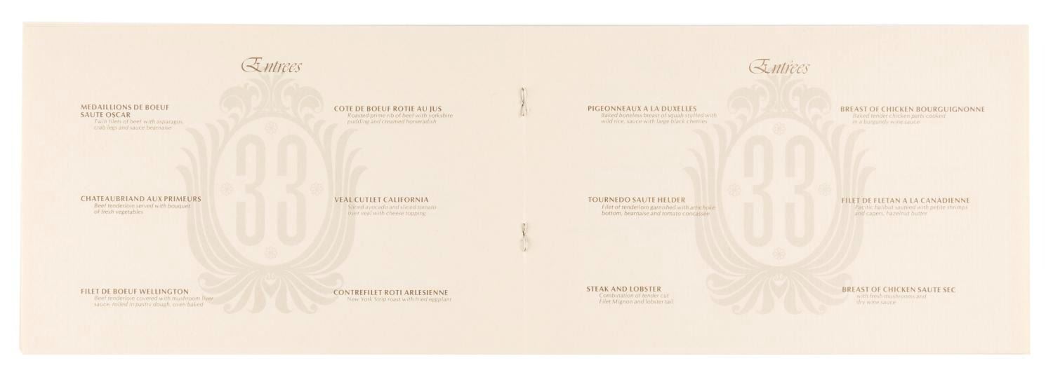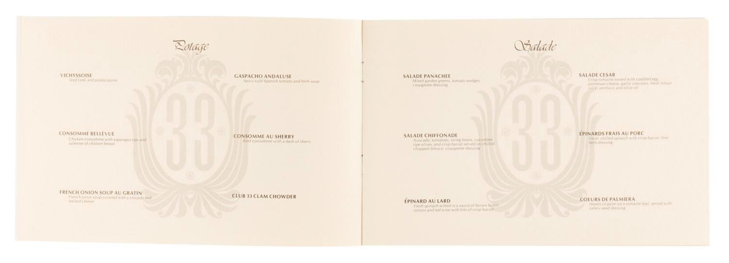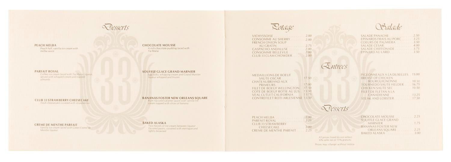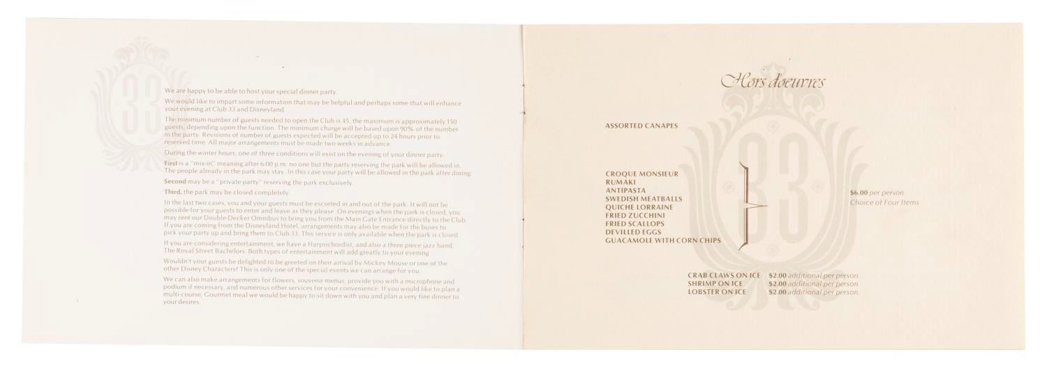 (Disneyland, 1990s-2000s) A collection of five Club 33 items including a blank table check, information sheet, wine label, and two private event menus. Measuring up to 8.5” x 11”, the items are in very good condition with some light handling wear.