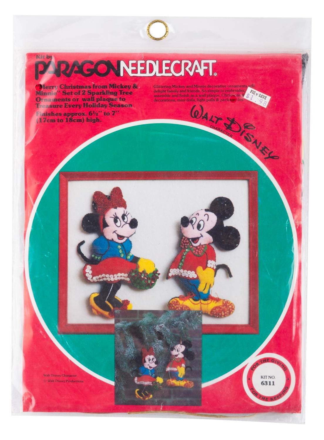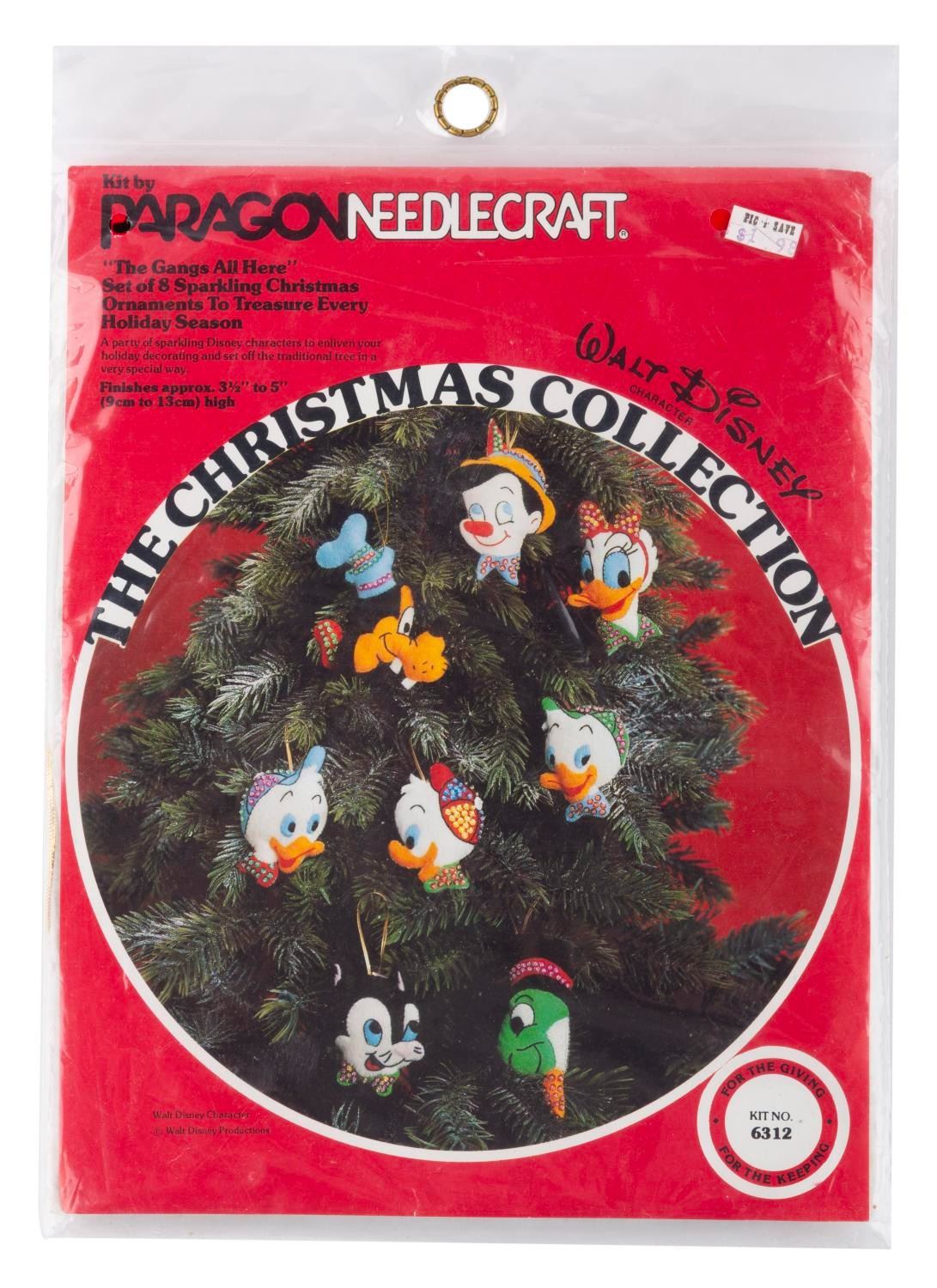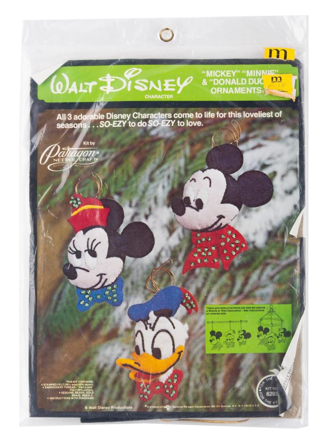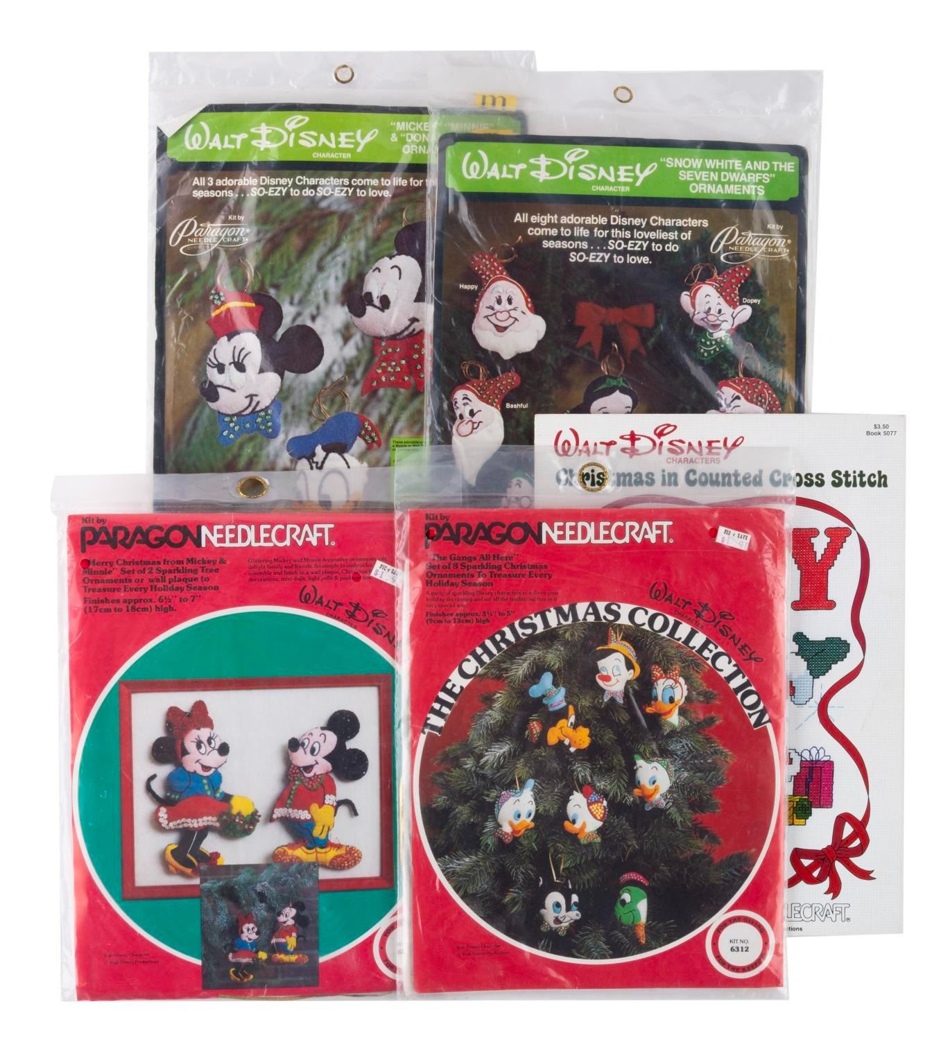 (Paragon, 1970s-80s) A collection of four Needlecraft Disney ornament kits, with all the materials needed to create fun plush character ornaments. Also included is a set of Disney character cross-stitch patterns. The kits are in fine, unopened condition, with light wear from age.