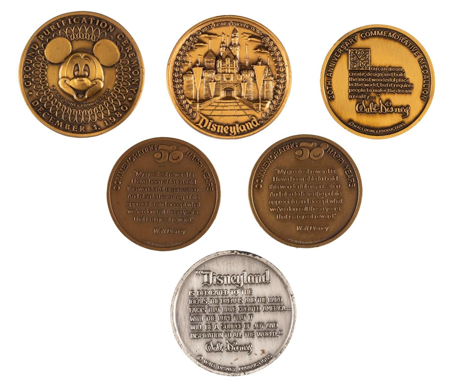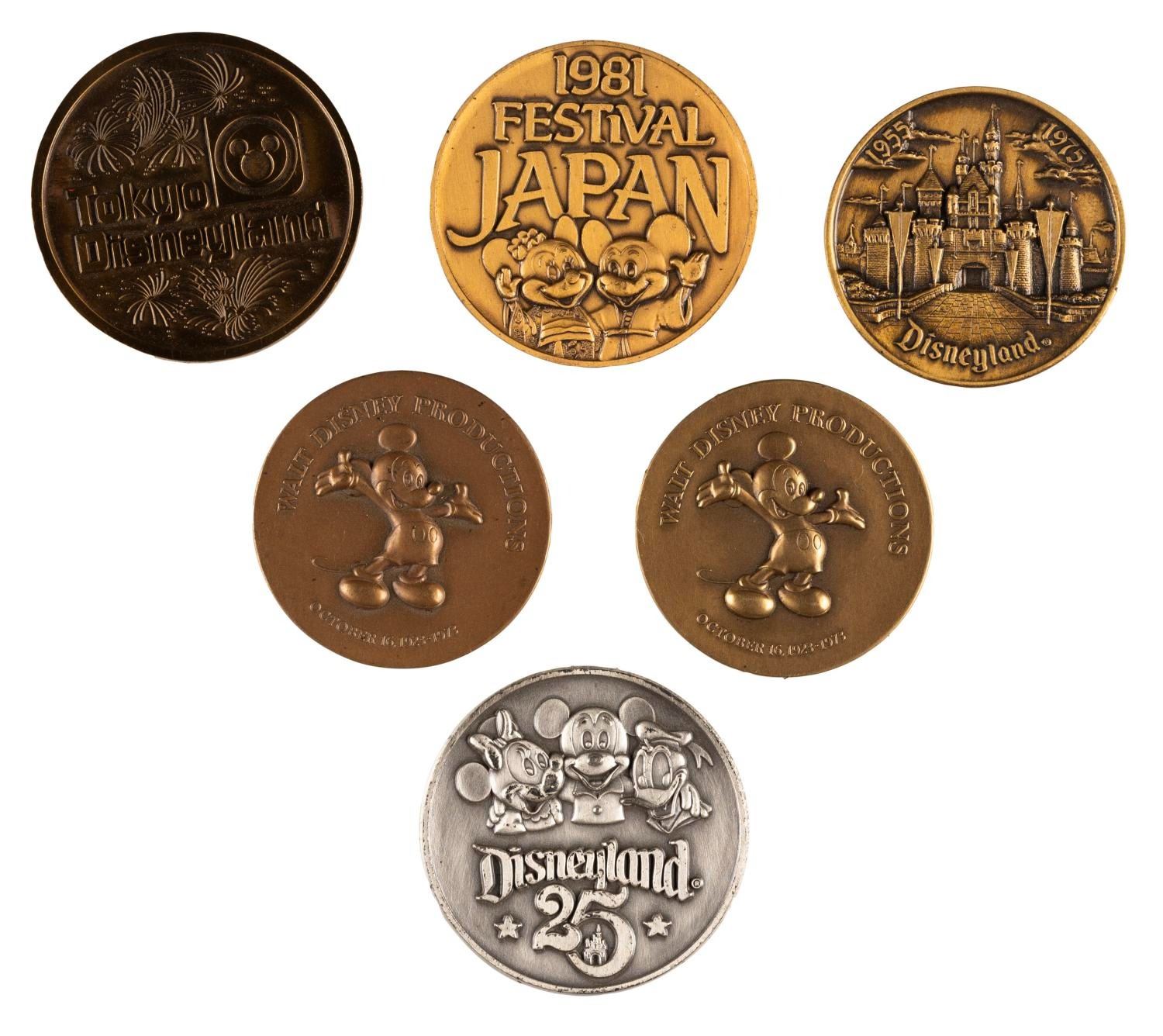 (Disney, 1973-1981) A collection of six Disney commemorative medallions. Included are two medallions for Walt Disney Productions 50th anniversary in 1973, a Disneyland 20th anniversary medallion from 1975, a 1980 Tokyo Disneyland Ground Purification Ceremony medallion, a 1980 Disneyland 25th anniversary medallion, and a 1981 Disneyland Festival Japan Medallion. Measuring up to 1.75” in diameter, the medallions are overall in fine condition, with the Disneyland 25th in very good condition with edge wear. The Tokyo Purification Medallion comes with a box in fair condition.