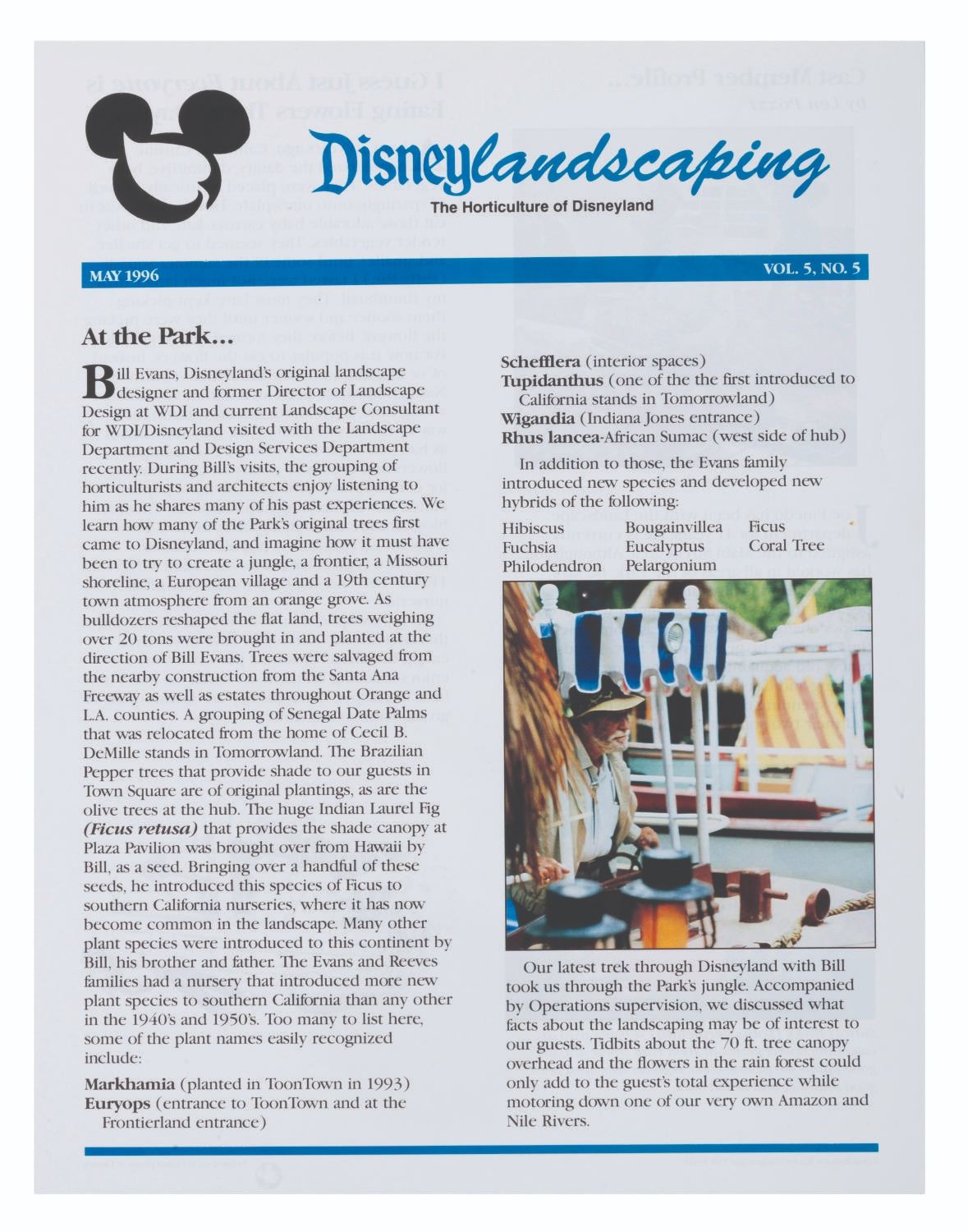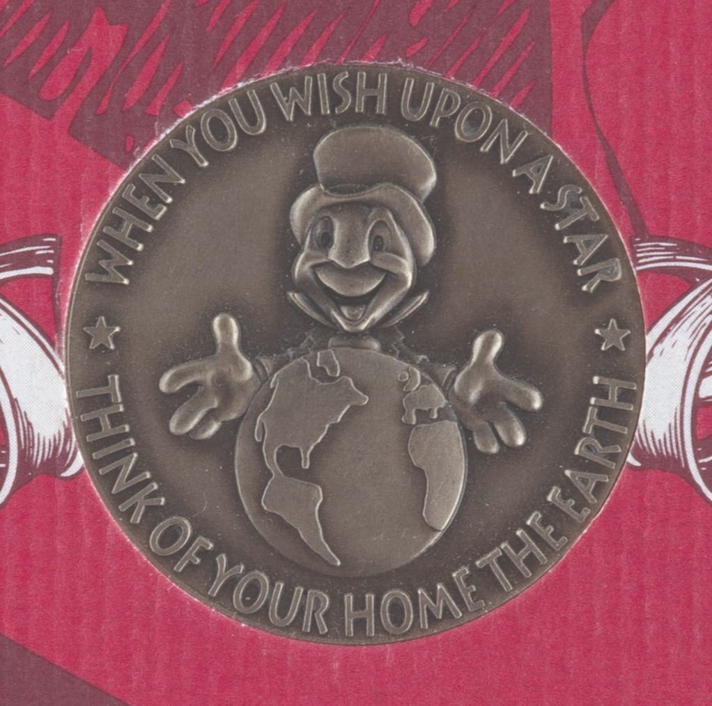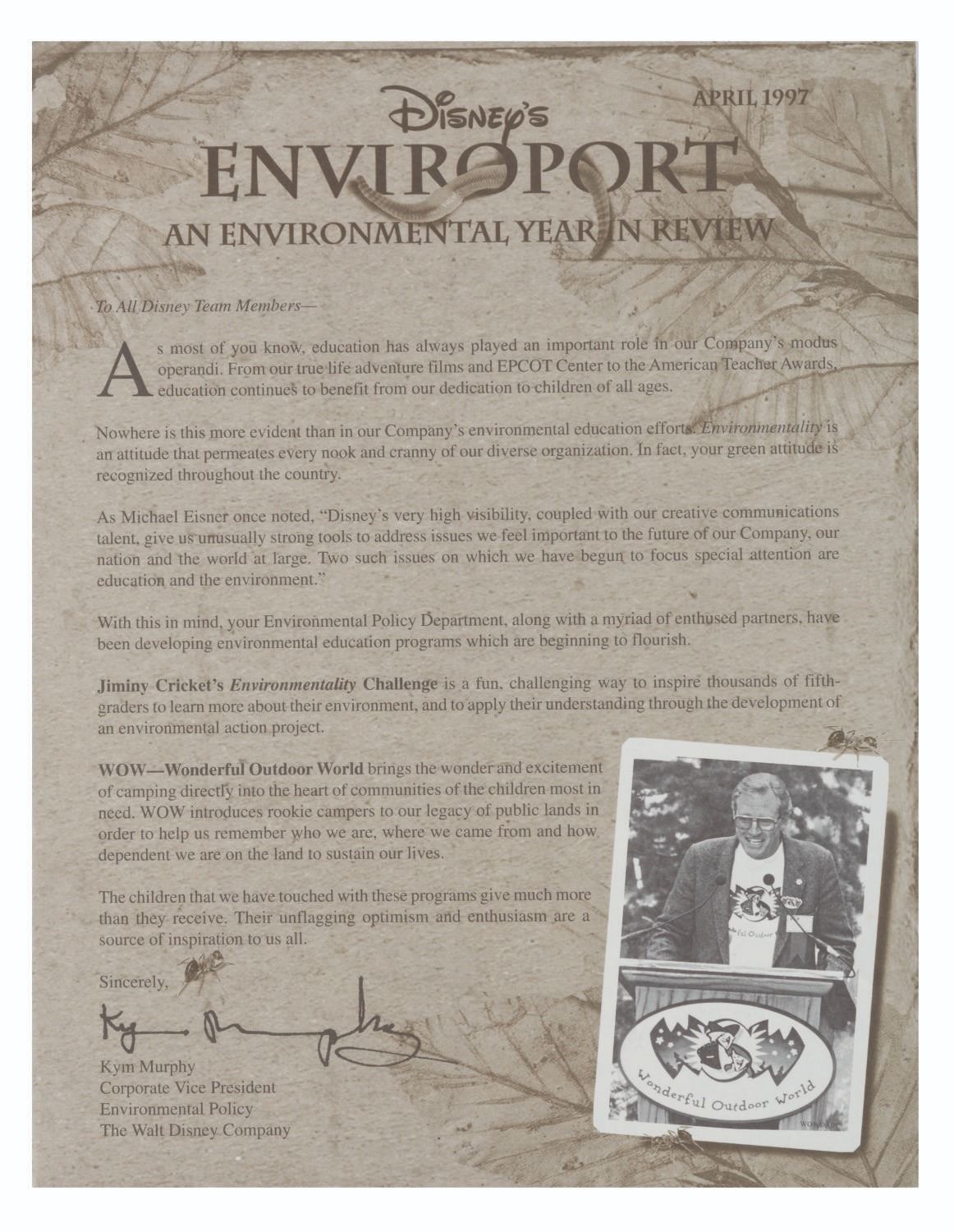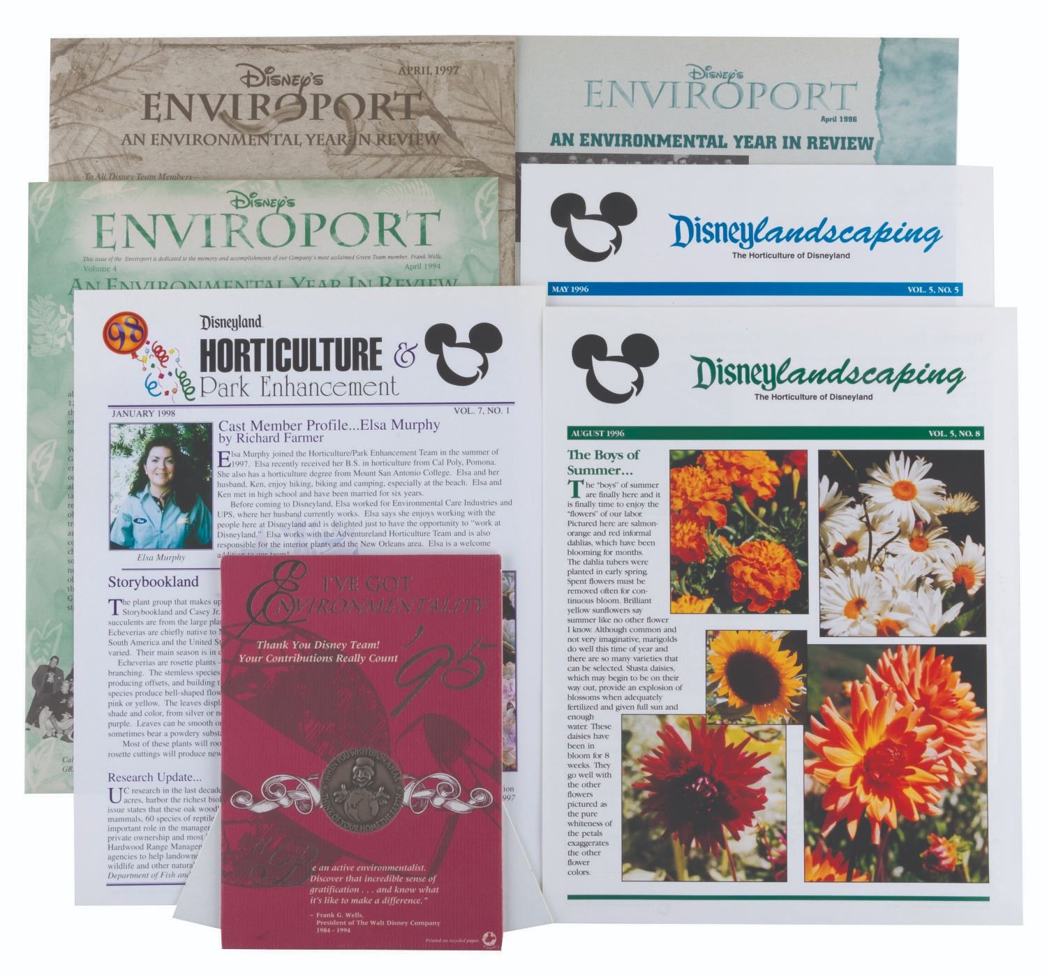 (Disneyland, 1994-1998) A collection of Disney internal environmental newsletters and a Jiminy Cricket coin. Included are the April 1994, 1996, and 1997 issues of Disney’s Enviroport, May and August 1996 Disneylandscaping newsletters, a January 1998 Disneyland Horticulture & Park Enhancement newsletter, and a 1995 coin in a display thanking the Disney team for contributions to the environment. Ranging in size from the 6.75” x 7” coin display to the 8.5” x 11” magazines, the lot is in very good to fine condition with light creases and wear.