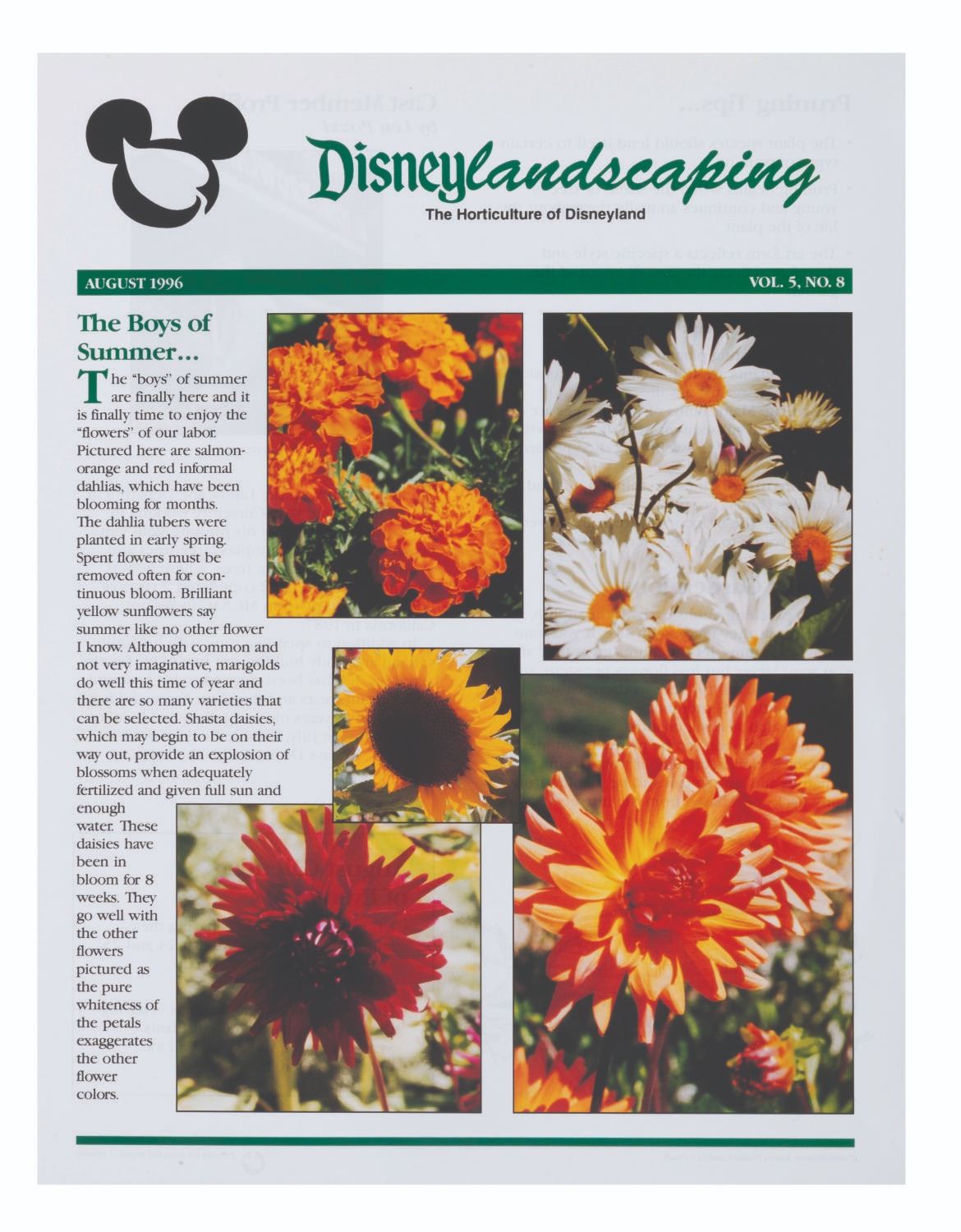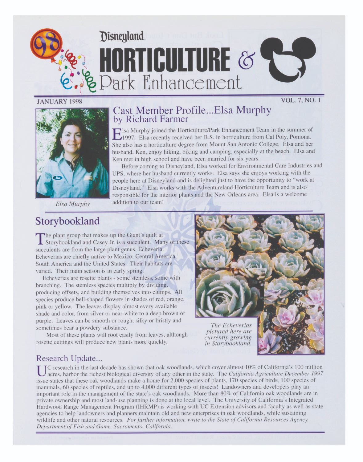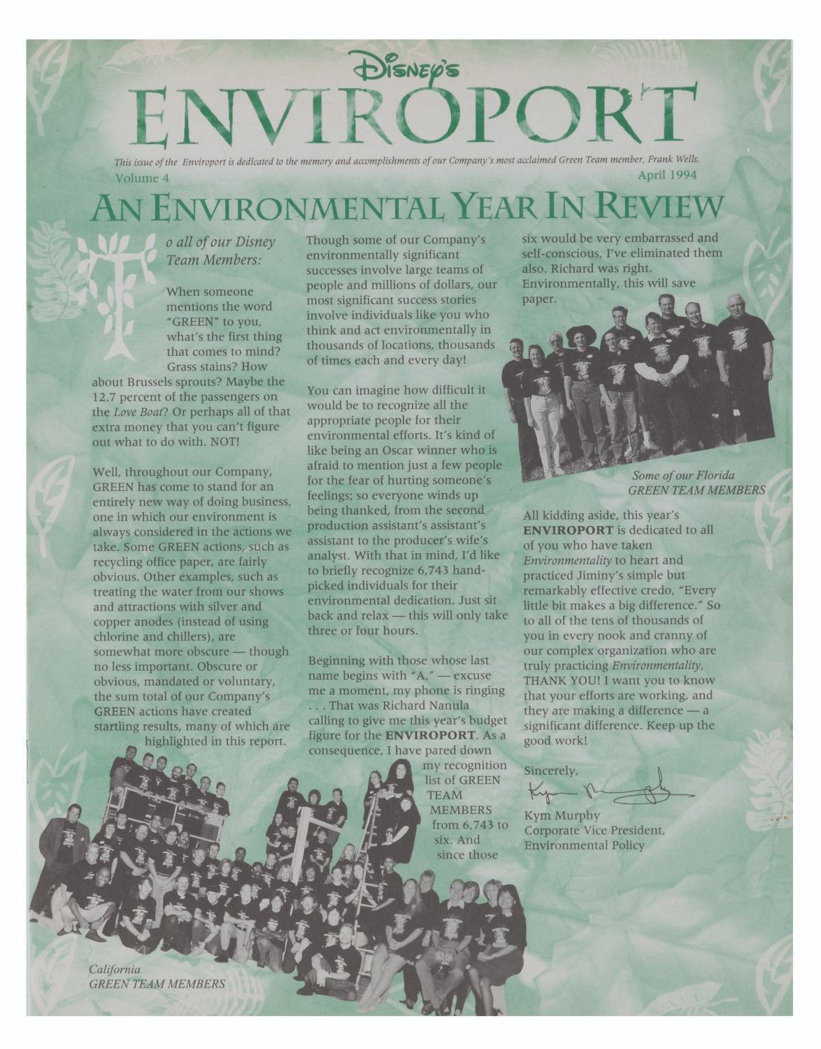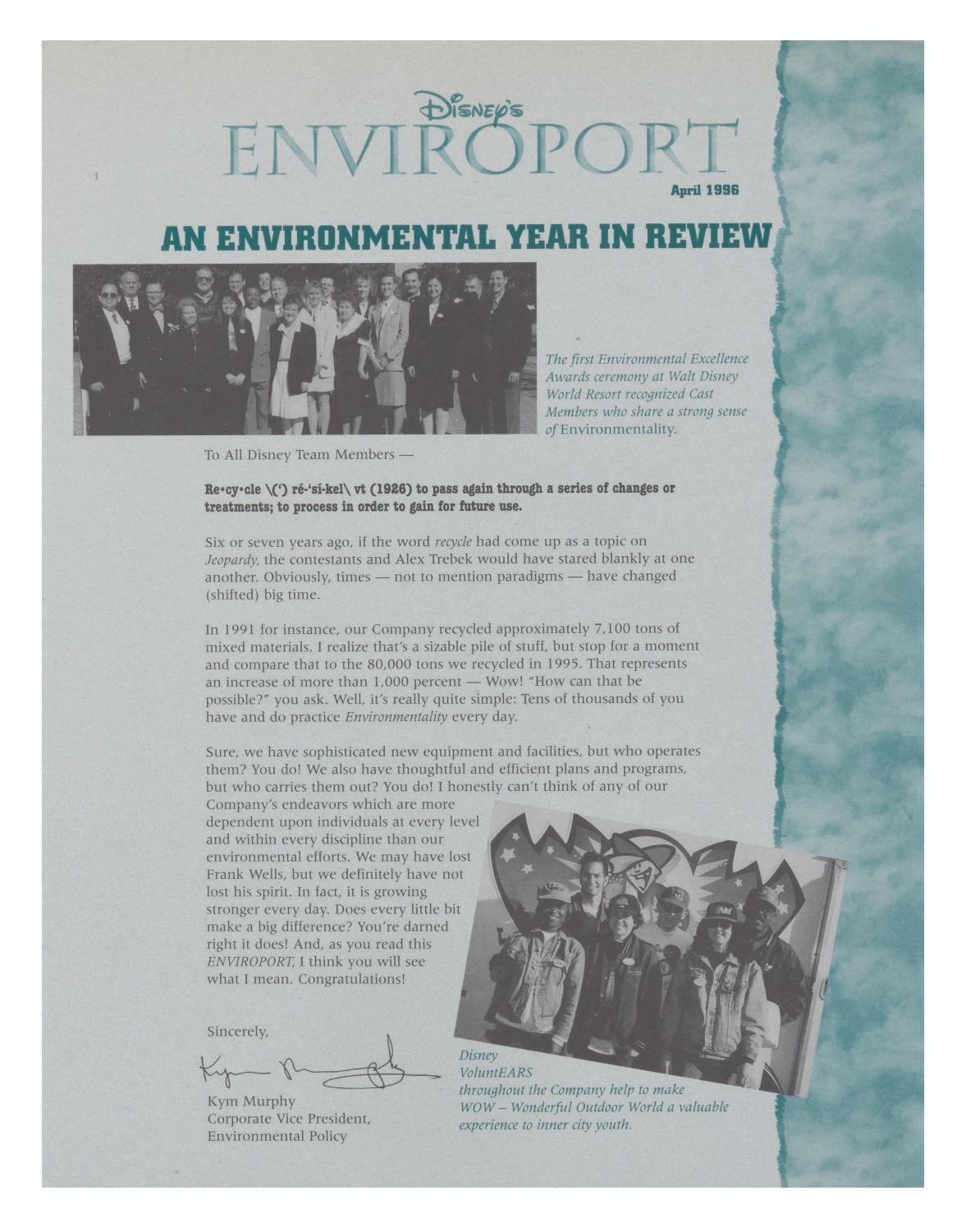 (Disneyland, 1994-1998) A collection of Disney internal environmental newsletters and a Jiminy Cricket coin. Included are the April 1994, 1996, and 1997 issues of Disney’s Enviroport, May and August 1996 Disneylandscaping newsletters, a January 1998 Disneyland Horticulture & Park Enhancement newsletter, and a 1995 coin in a display thanking the Disney team for contributions to the environment. Ranging in size from the 6.75” x 7” coin display to the 8.5” x 11” magazines, the lot is in very good to fine condition with light creases and wear.