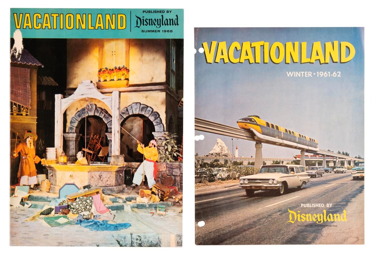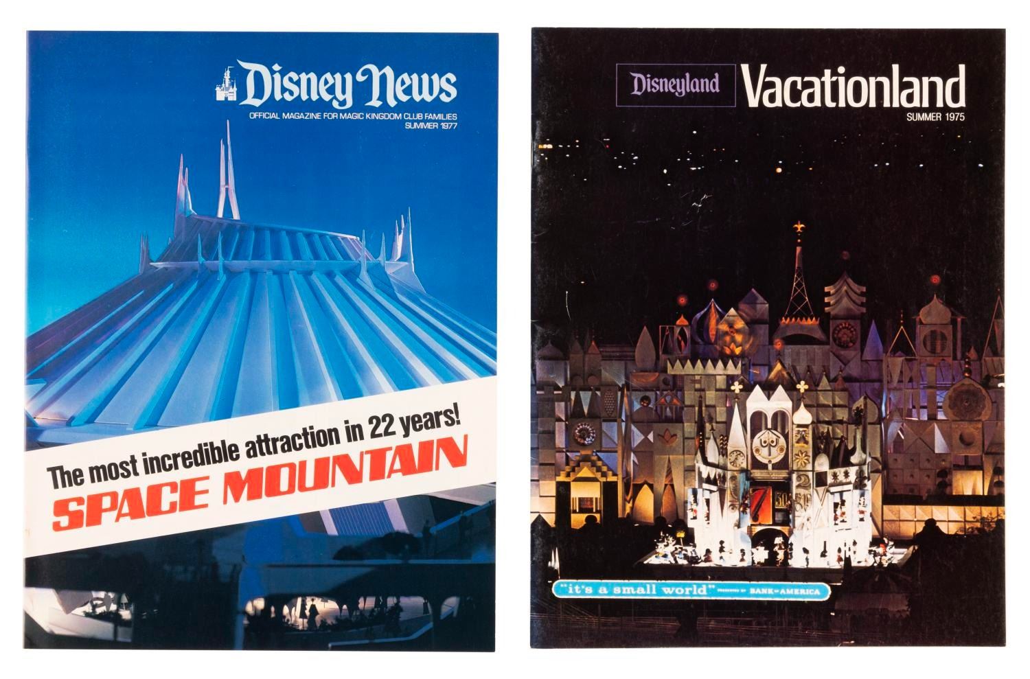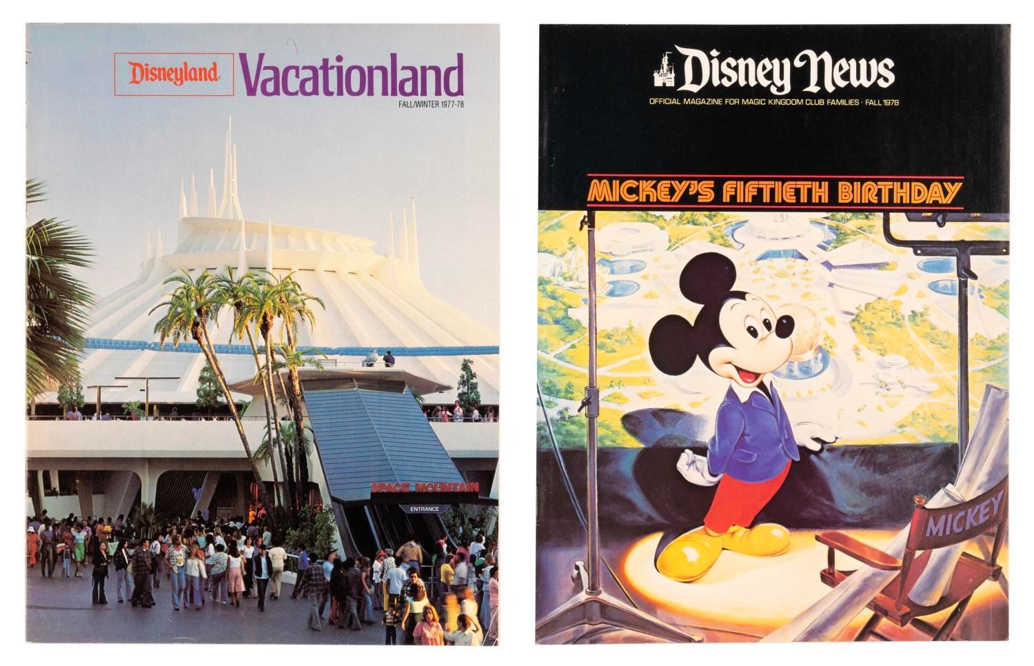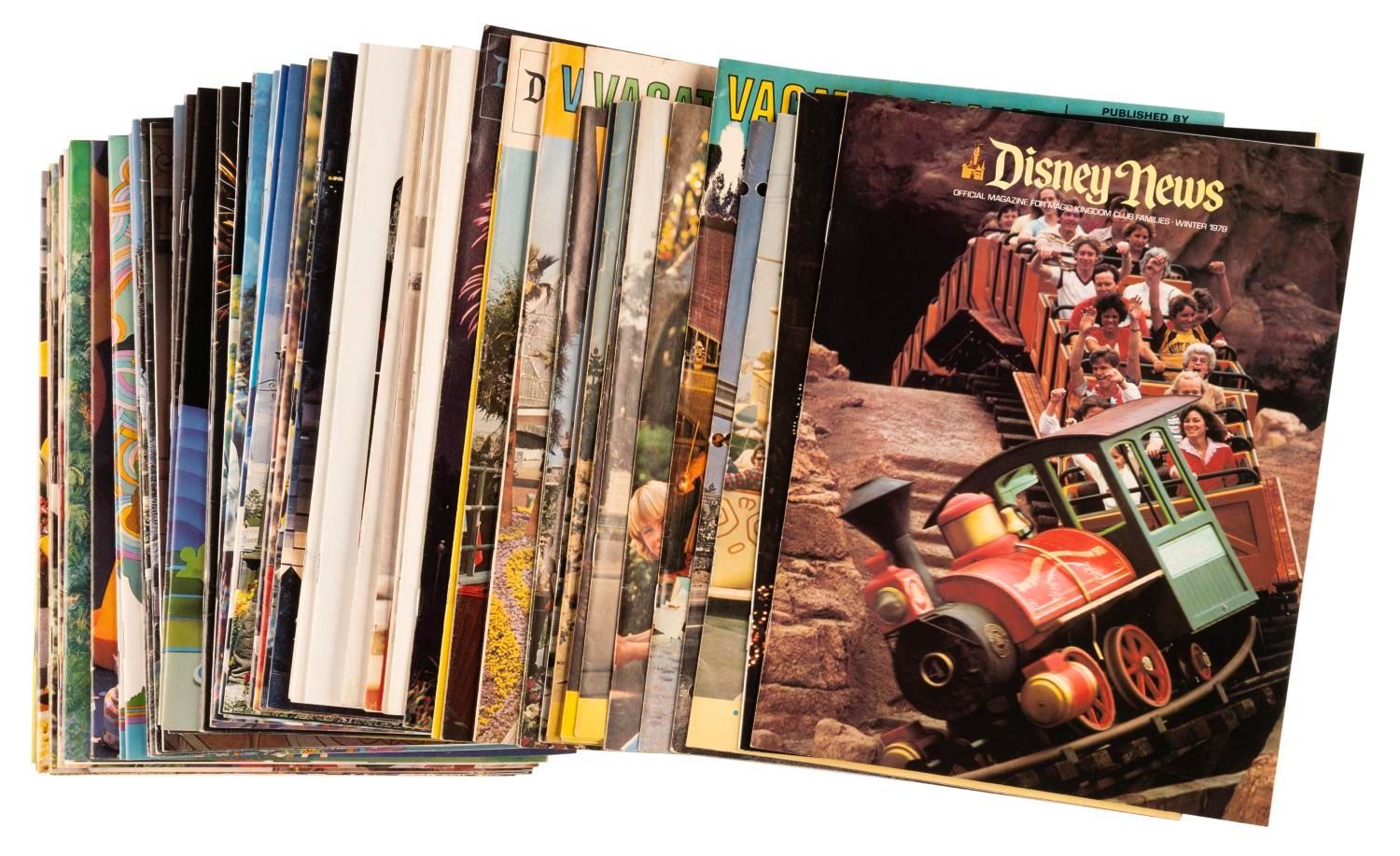 (Disney, 1958-1985) A collection of 20 issues of Disney News and 45 issues of Vacationland with cover stories on Pirates of the Caribbean, Country Bear Jamboree, Big Thunder Mountain Railroad, and more. Ranging in size from 8.5” x 11” to 8.5” x 11.75”, the issues are in good to very good condition with edge wear, several hole punches, scratches, several mailing labels and stamps, and wear from use.