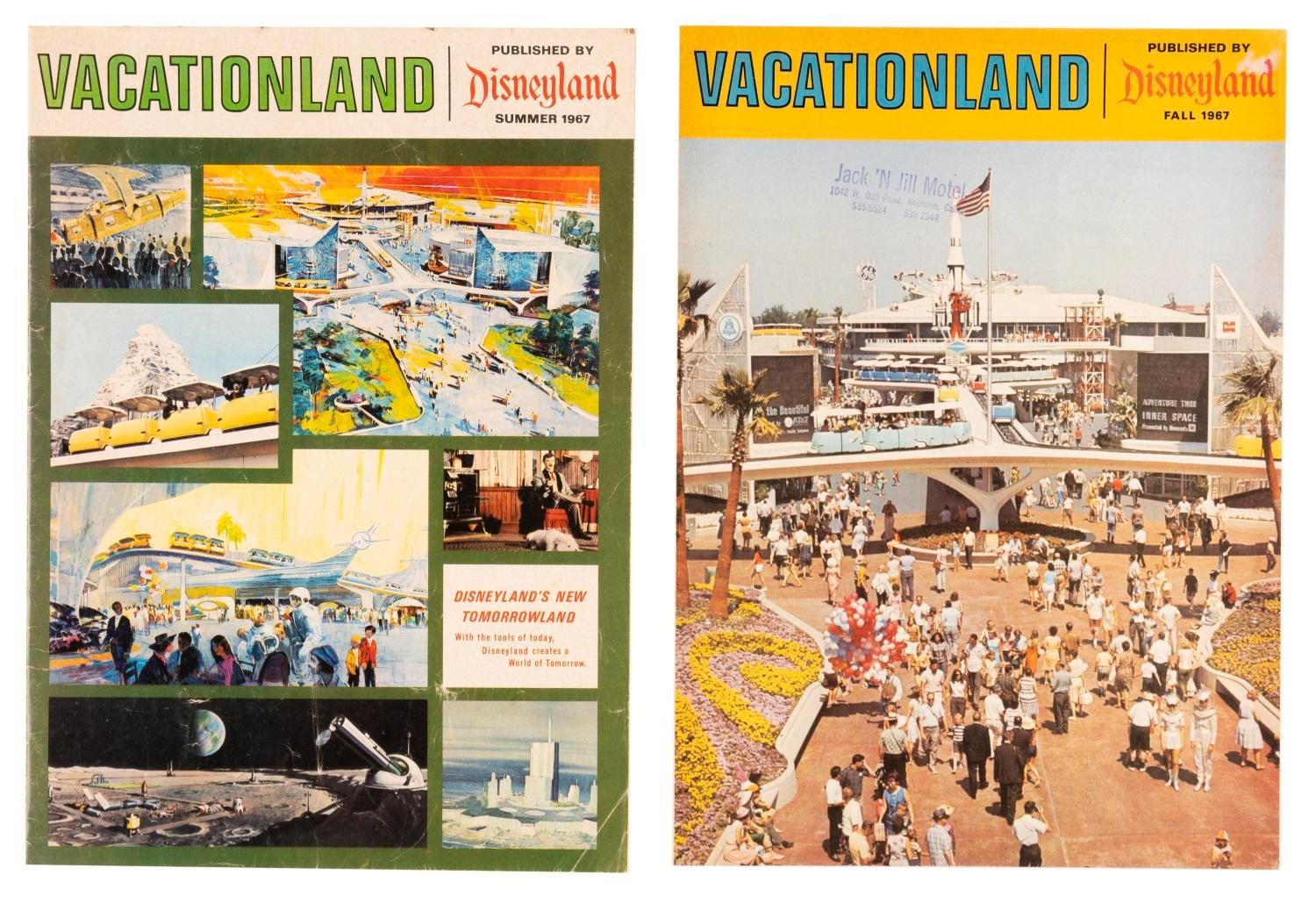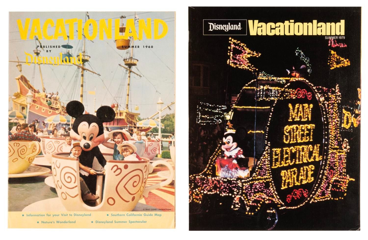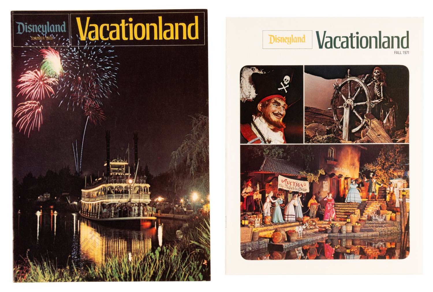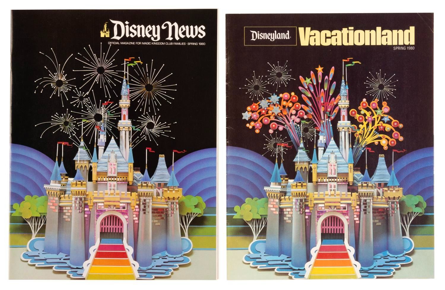 (Disney, 1958-1985) A collection of 20 issues of Disney News and 45 issues of Vacationland with cover stories on Pirates of the Caribbean, Country Bear Jamboree, Big Thunder Mountain Railroad, and more. Ranging in size from 8.5” x 11” to 8.5” x 11.75”, the issues are in good to very good condition with edge wear, several hole punches, scratches, several mailing labels and stamps, and wear from use.