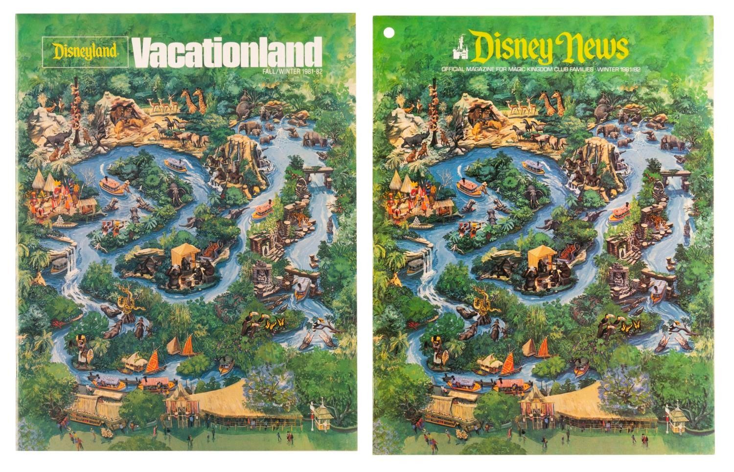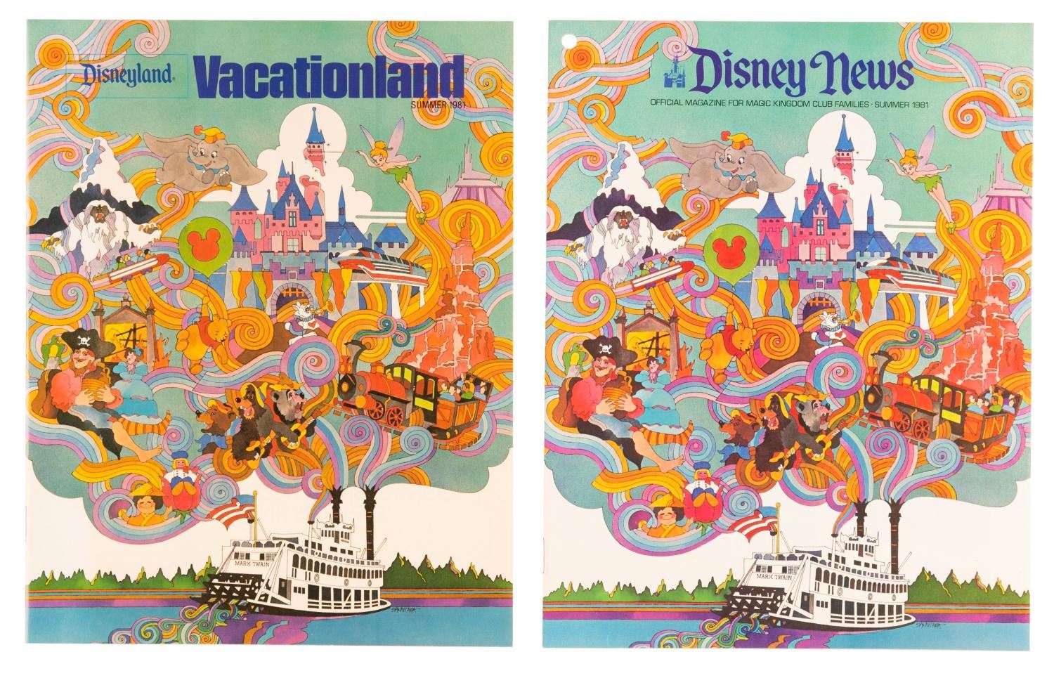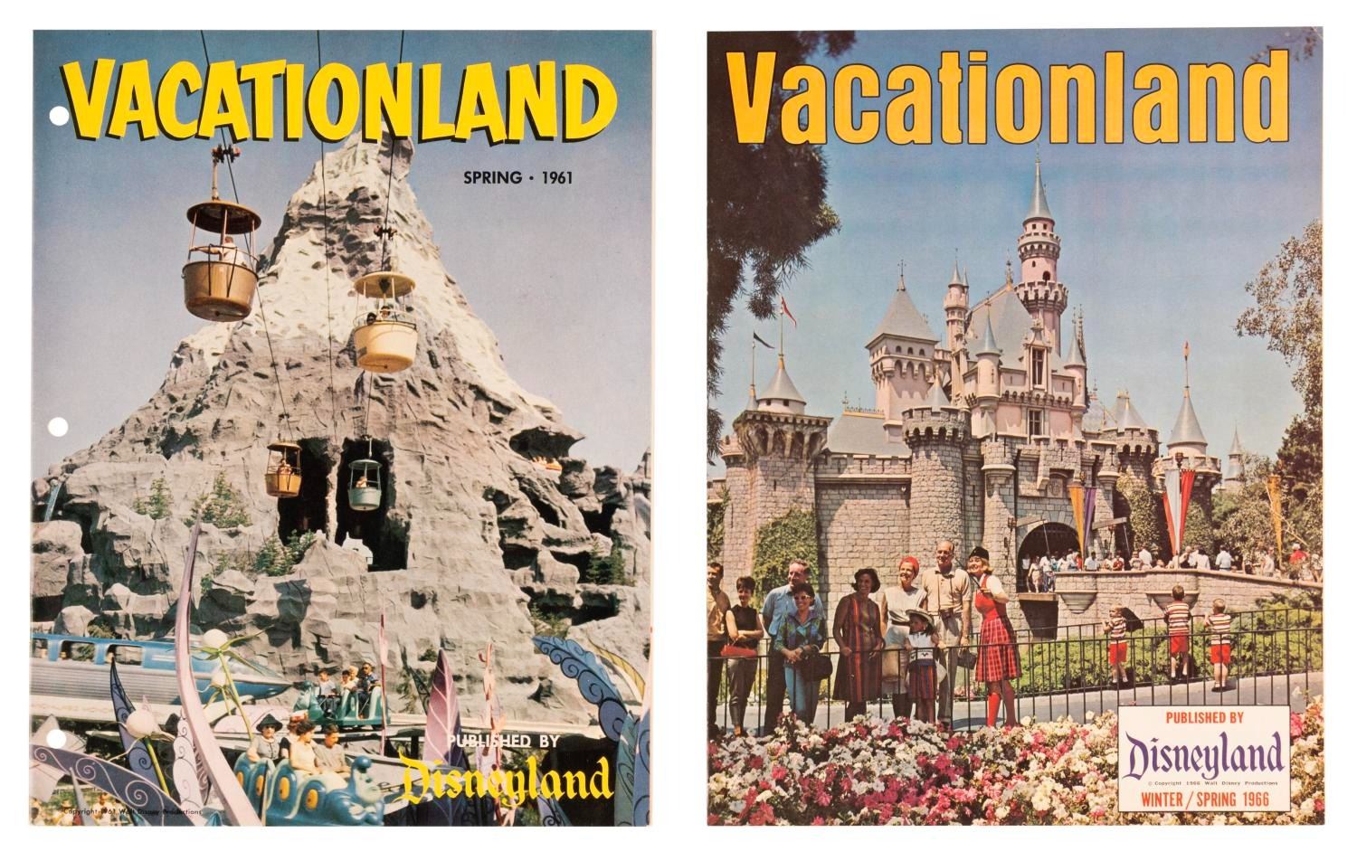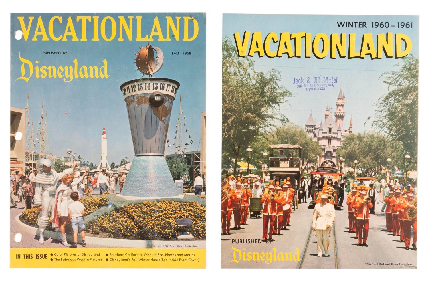 (Disney, 1958-1985) A collection of 20 issues of Disney News and 45 issues of Vacationland with cover stories on Pirates of the Caribbean, Country Bear Jamboree, Big Thunder Mountain Railroad, and more. Ranging in size from 8.5” x 11” to 8.5” x 11.75”, the issues are in good to very good condition with edge wear, several hole punches, scratches, several mailing labels and stamps, and wear from use.