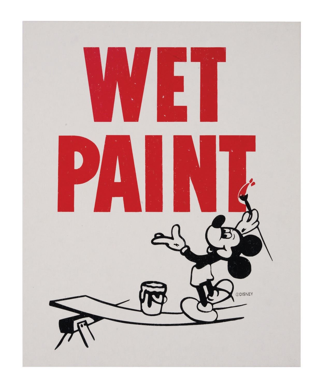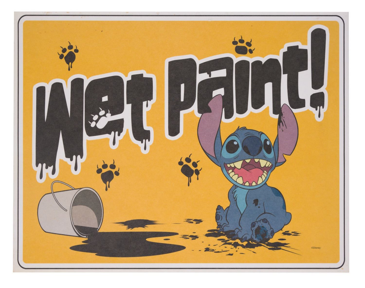 (Disney Parks, c.1980s-2000s) A collection of (3) "Wet Paint" signs created for rehabilitation of Disney Parks Backstage areas. The collection contains signs featuring Mickey Mouse, Donald Duck, and Stitch. Measuring 10.5"x13.5" to 9.25"x7.5", the signs, on heavy cardstock, are in overall fine condition.